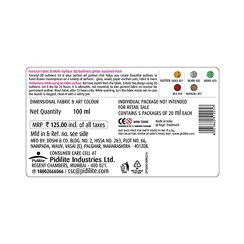 Fevicryl 3D outliners assorted glitter kit is a perfect art partner that helps create beautiful outlines or hand drawn masterpieces on a variety of surfaces - glass wood paper earthen pots fabric and more. Using these 5 shades outliner pack you can make colourful outlines and design your art work to turn it into a masterpiece