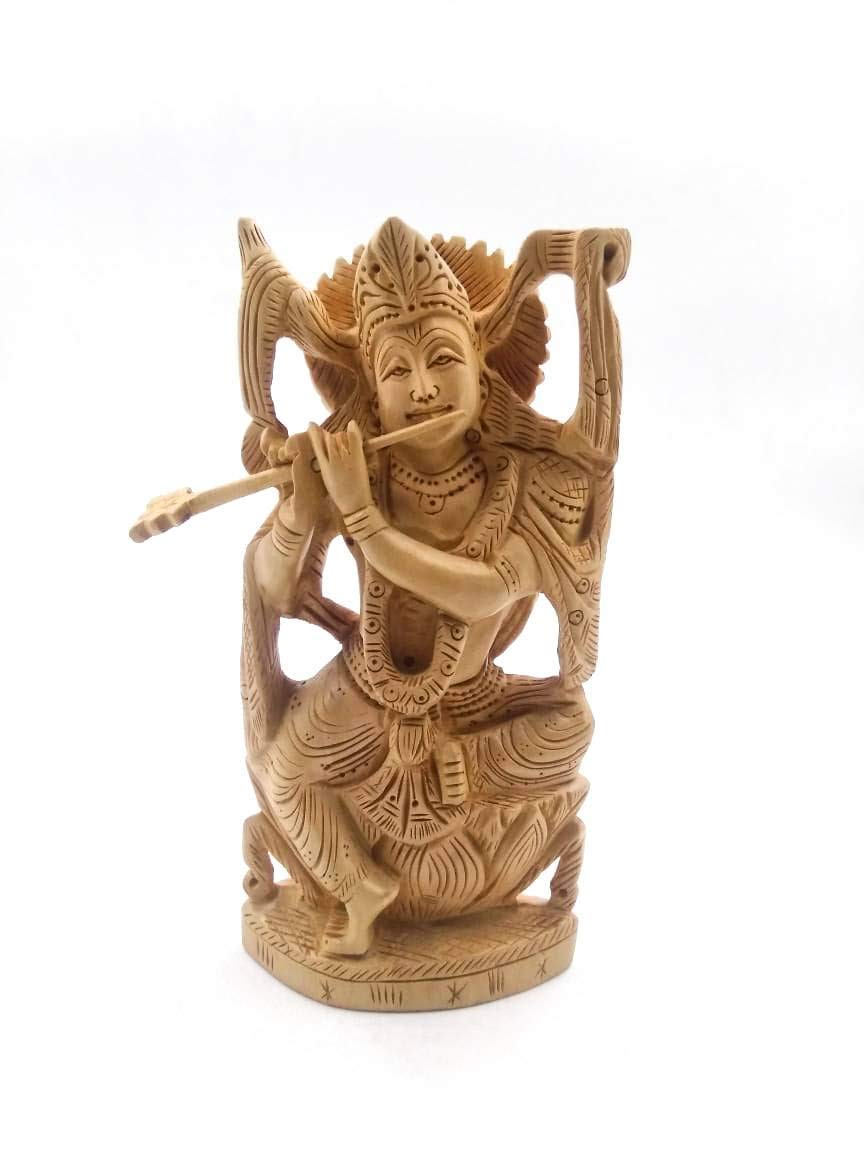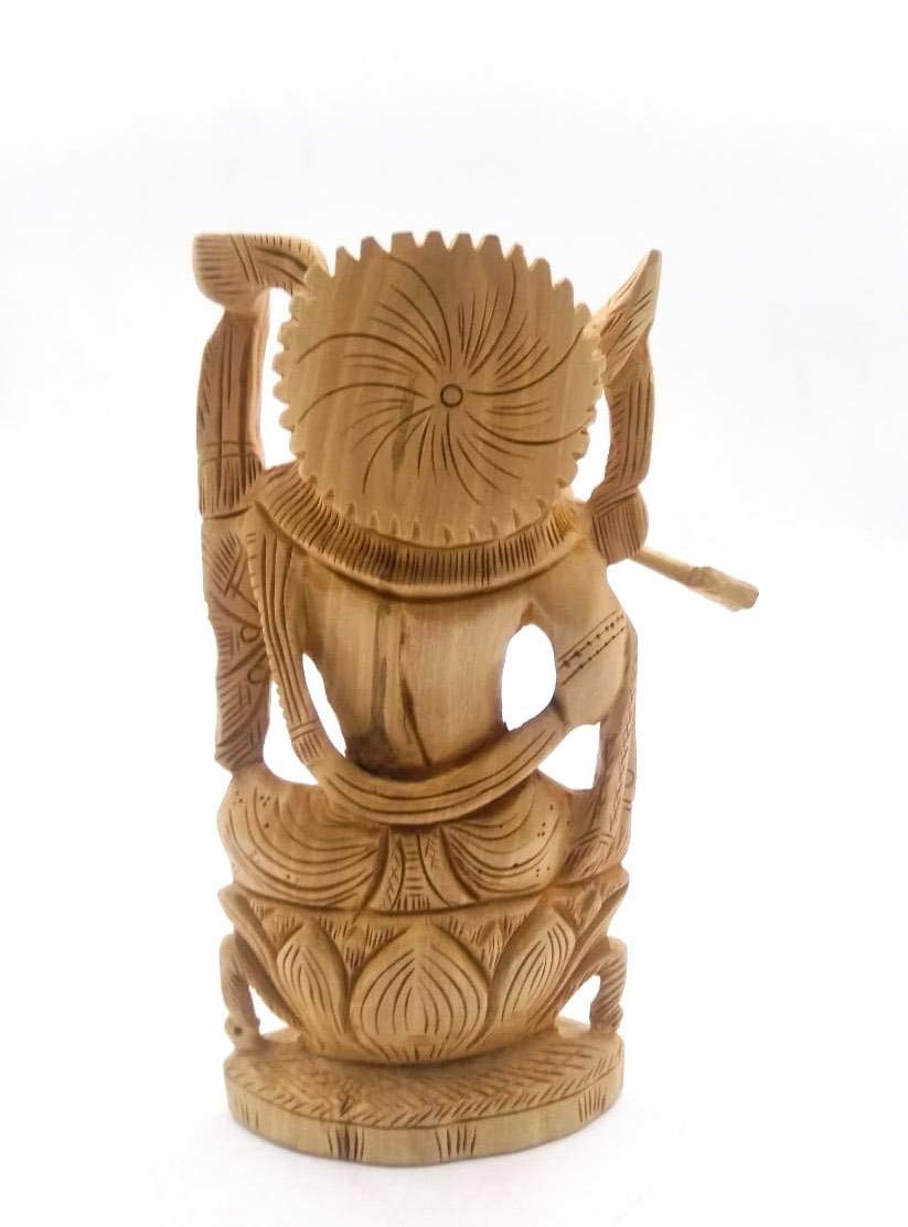 Wooden Hand Carved God Krishna Idol Sculpture Art Home Decorative Figurine Feng Lord Krishna is also known as the epitome of love. According to Shastras Lord Krishna is also one of the charming gods who had the elemental quality of attracting everyone who came in contact with him. This is a belief as Krishna in any form is believed to be a powerful charming and positive sight. So keeping a Lord Krishna Statue in a home is very beneficial and divine. Keep God Krishna in Offices Home Temples and as Souvenir. Art: Handmade Wooden Carving An ancient craft originally practiced on ivory is adapted to different kinds of wood as well. The community of Ivory carvers still known as Hast daant waale from Rajasthan and Haryana have over the years evolved their craft to carving on wood as well. The craftsmen create decorative artifacts jewellery and utility products like lamps boxes photo frames and pen stands out of finely carved wood. These craftsmen generally work on sandalwood and the less expensive Kadam wood. Sandalwood is softer to work on and hence requires slightly blunt tools as against sharper ones for the Kadam wood. Carving involves shaping wood to make objects of utility and chiseling parts of wood to form intricate designs with the help of hand tools. Buyer will love the smooth lines and subtle detailing that gives this piece a sense of mystery. Other carved animals/designs adds a bold attraction to produce a piece that you will love displaying on your shelf or table. The warm stain enhances the natural beauty of the wood grain.