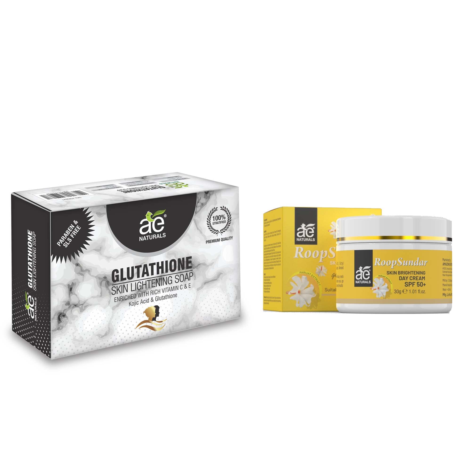 AE NATURALS Glutathione Skin Whitening Soap is a perfect organic formula that helps clean and brightens the skin naturally. The perfect combination of ingredients works effectively on pimples pores wrinkles and other skin issues. It is suitable for men and women with different skin types.It is formulated with Activated Charcoal Kojic Acid Glutta thione Vitamin E Jojoba Oil Almond Oil Glycerin and Coconut Oil. All these ingredients are blended in the right combination to control melanin giving you glowing and bright skin. AE NATURALS Roop Sundar Day Cream is specially designed to regulate uneven skin tone fine lines and dullness â while giving your skin a bright and glowing look. Our highly effective cream are ideal for all skin types. Combination of this Cream and Soap will give best result within 20 days. Usage Take a pea size amount of AE NATURALS Roop Sundar Day Cream and place small dots around your face and neck. Tap and massage lightly in a circular motion. Use it daily Twice a Day with this Apply Ae Naturals Glutta thione Soap on wet body and face. Bring the soap to lather and then rinse off with warm water