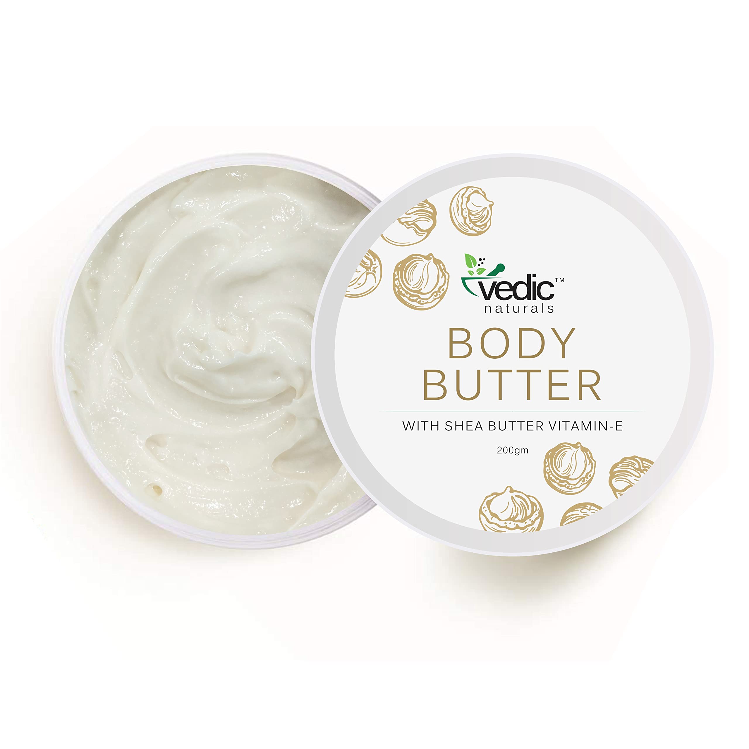 HomeBeautyBodyBody CareBody ButtersVedic Naturals Body Butter Enriched With Shea Butter & Vitamin-E - 200gm | Deep Moisturizing For Dry Skin & All Day Moisture Lock | For All Skin Types & Healing Stretch Marks | 100% Organic