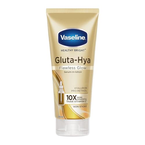 For over 150 years Vaseline has been passionate about healing skin and ensuring happy skin everyday for EveryBody. We believe 'Healthy Skin is Beautiful Skin' that helps you keep up with the demands of life. Vaseline's Gluta-Hya is a revolutionary product range from the house of Vaseline with advanced brightening ingredients & has a super-light sensory. The unique sensory of the serum-burst lotion is lighter and fresher than a lotion silkier and smoother than a gel. Gluta-Hya gives you âVisibly Brighter Skin from the First Useâ. It is boosted with GlutaGlow technology which is 10x more powerful than Vitamin C. Boost your skin's moisture for dewy skin with Hyaluron. Pro-Retinol exfoliates dead skin cells to give you even toned skin. Non-sticky formula & Easy to absorb. Spreads easily all over the body. Bring back your Glow with Vaseline's Gluta-Hya Range. It comes in two variants: Flawless Glow for Even Toned Skin and Dewy Radiance for Radiant Skin. Intense heat pollution and moisture loss takes a toll on your skin making it look dull and lose its natural glow. And applying your regular body lotions can feel heavy and sticky especially in summers. Unlike Heavy Lotions Gluta-Hya has super-light texture which is perfect for Indian weather. Experience the goodness of Vaseline's Gluta-Hya Range and say bye-bye to dull body skin.