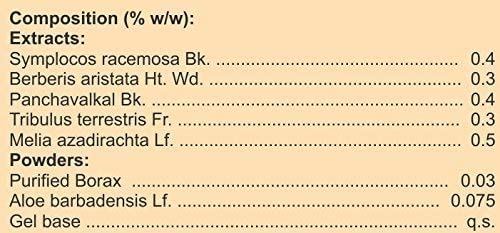 Ingredients: lodhra (0.004) Daruhaldi (0.003) Panchavalkal (0.004) Gokhru (0.003) Neem (0.005) Shuddha tankaankhar (0.0003) Kumari (0.00075) Glycerine ip (0.05) Propylene glycol ip (0.025) Disodium edta ip (0.001) Carbopol 940 usp (0.02) Carrageenan ip (0.0025) Sodium benzoate ip (0.001) Bronopol ip (0.001) Benzyl alcohol ip (0.005) Sodium hydroxide ip (0.0032) Purified water (qs).