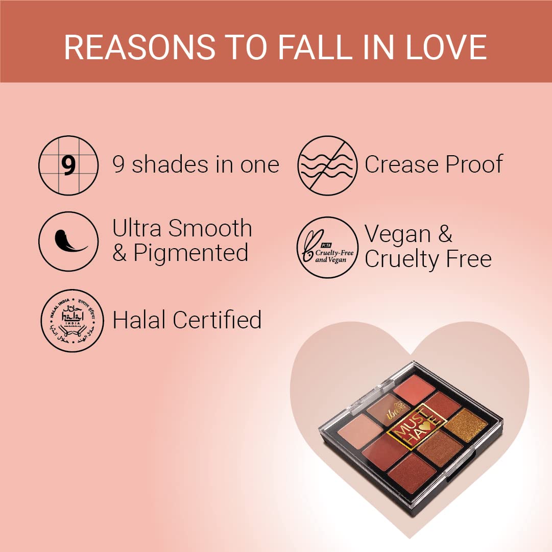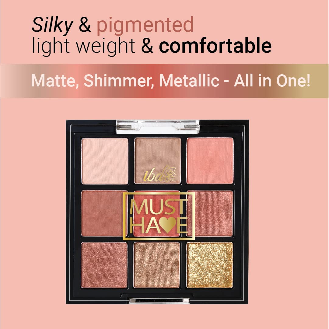 Iba Must Have Limitless Looks Eyeshadow Palette - Peach Glam | 9 Pigmented Colours Eyeshadow Palette | Shimmer & Metallic Finish Shades 10.8gTake your love for Eyeshadow Palettes to the next level with Iba Must Have Limitless Looks Palatte! Why is this palette a Must Have?Contains 9 shades which are a mix of matte shimmer and metallic to create limitless eyeshadow looks with a single palette!Crease-proof highly pigmented colors are rich and ultra-blendable so you mix and match and build your look with easeSilky ultra-fine particles ensure one stroke is all it takes for a long-lasting color that works magic on the eyelidsLightweight and all-day comfortable wearPETA Certified Vegan & Cruelty Free