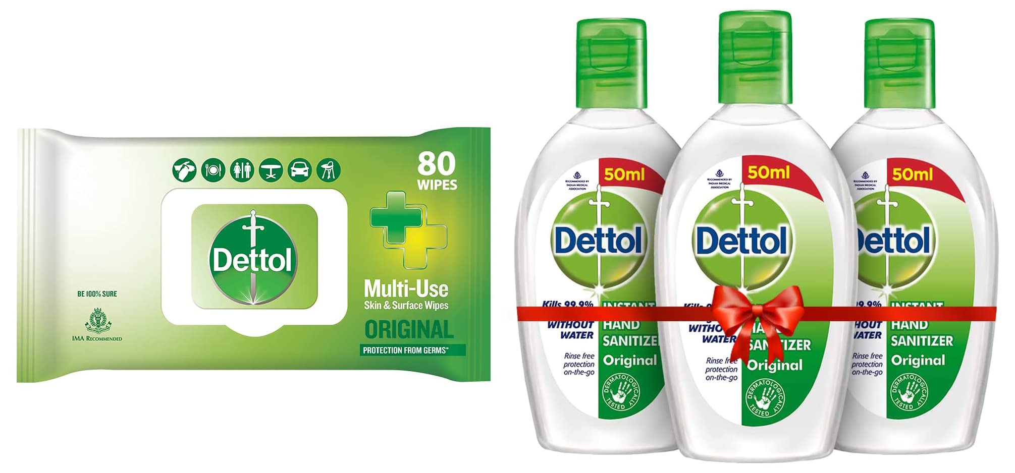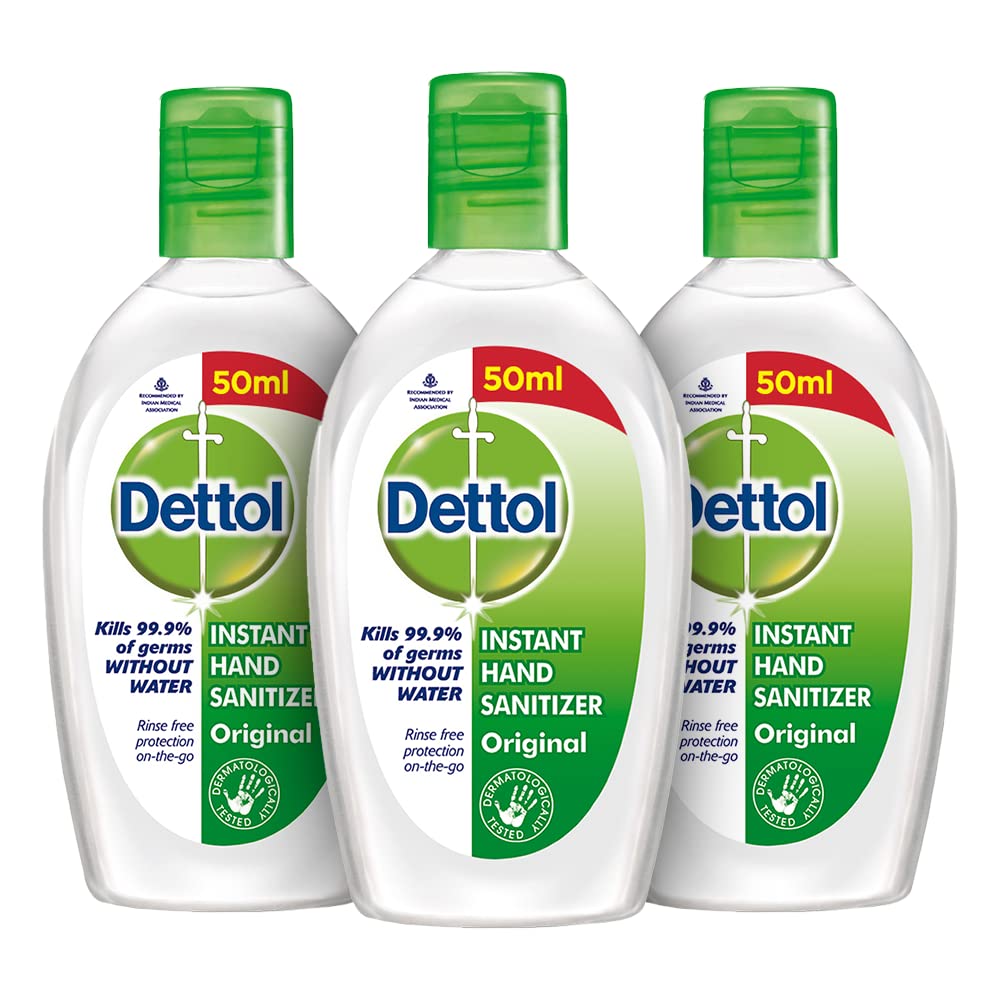 Dettol Disinfectant Sanitizer Wet Wipes for Skin & Surfaces Original â 80 Count| Moisture-Lock Lid | Safe on Skin | Ideal to Clean SurfacesDettol's Disinfecting Skin & Surface Wipes are Safe on Skin Ideal to Clean Multiple Surfaces Easy to carry with a resealable Moisture-lock lid. Dettol disinfecting wipes are practical for everyday use on furniture taps sinks door knobs kitchen bathroom surfaces floor cleaning childrenâs surfaces and places that are germ hotspots. It can be used on most hard non-porous surfaces including Finished Wood Sealed Marble Stainless Steel Laminated Floors Glass and Plastic.Dettol Original Germ Protection Alcohol based Hand Sanitizer 50ml Pack of 3DETTOL Hand Sanitizer is protection on the go; whether you are using a public toilet public transport or simply eating outside use DETTOL Sanitizer that offers water-less protection against germs. DETTOL hand sanitizer is specially formulated to protect you from 100 illness causing germs withot the use of soap and water. This rinse free and non-sticky sanitizer is recommended by Indian Medical Association. USAGE: Squirt a thumbnail amount onto the palms. Spread sanitizer and rub palms together. Rub tips of each hand with palm of other hand. Rub hands together until they are dry.