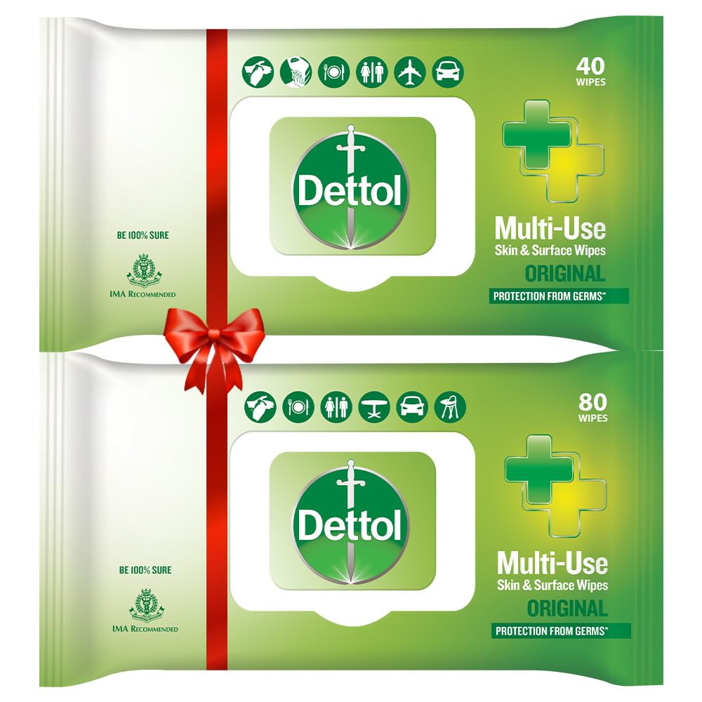 Dettol Disinfectant Sanitizer Wet Wipes for Skin & Surfaces Original â 80 Count| Moisture-Lock Lid | Safe on Skin | Ideal to Clean SurfacesDettol's Disinfecting Skin & Surface Wipes are Safe on Skin Ideal to Clean Multiple Surfaces Easy to carry with a resealable Moisture-lock lid. Dettol disinfecting wipes are practical for everyday use on furniture fridges taps sinks door knobs kitchen bathroom surfaces floor cleaning childrenâs surfaces and electronics that are germ hotspots. It can be used on most hard non-porous surfaces including Finished Wood Sealed Marble Stainless Steel Laminated Floors Glass and Plastic.Dettol Disinfectant Skin & Surface Wipes Original â 40 Count| Safe on Skin| Ideal to Clean Multiple Surfaces| Resealable lock-lidDettol's Disinfecting Skin & Surface Wipes are Safe on Skin Ideal to Clean Multiple Surfaces Easy to carry with a resealable Moisture-lock lid. Dettol disinfecting wipes are practical for everyday use on furniture fridges taps sinks door knobs kitchen bathroom surfaces floor cleaning childrenâs surfaces and electronics that are germ hotspots. It can be used on most hard non-porous surfaces including Finished Wood Sealed Marble Stainless Steel Laminated Floors Glass and Plastic.