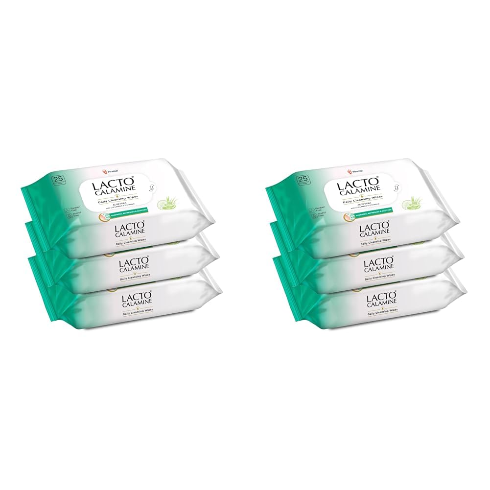 Lacto Calamine Daily Cleansing Facial Wipes 25N Each - Pack of 6 | Wet Wipes for Face with Aloe Vera, Cucumber & Vitamin E | Makeup Remover Wipes| Hydrating,Refreshing, Soothing|Paraben & Alcohol Free
