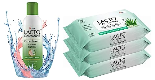 Lacto Calamine Daily Face Cleansing Wipes with Aloe Vera Cucumber & Vitamin E Hydrating Refreshing Soothing Paraben and Alcohol Free White Pack of 3 75 CountLacto Calamine Daily Cleansing Wipes are face wipes that gently cleanse your skin from impurities dirt & pollution. Aloe Vera & Cucumber soothes and refreshes your skin while Vitamin E acts as an antioxidant protecting your skin.Lacto Calamine Cucumber Face Toner with Green Tea & Niacinamide for cool and hydrated skin. Tightens pores & evens skin tone. Suitable for Oily and Acne prone skin. No Parabens No Sulphate No Alcohol - 120 ml x Pack of 1Lacto Calamine Cucumber toner with Green tea and Niacinamide cleanses the skin and tightens the pores. Niacinamide controls excess oil on the skin while cucumber extracts keep the skin cool and hydrated. The natural properties of green tea extracts makes the product suitable for oily and acne prone skin.