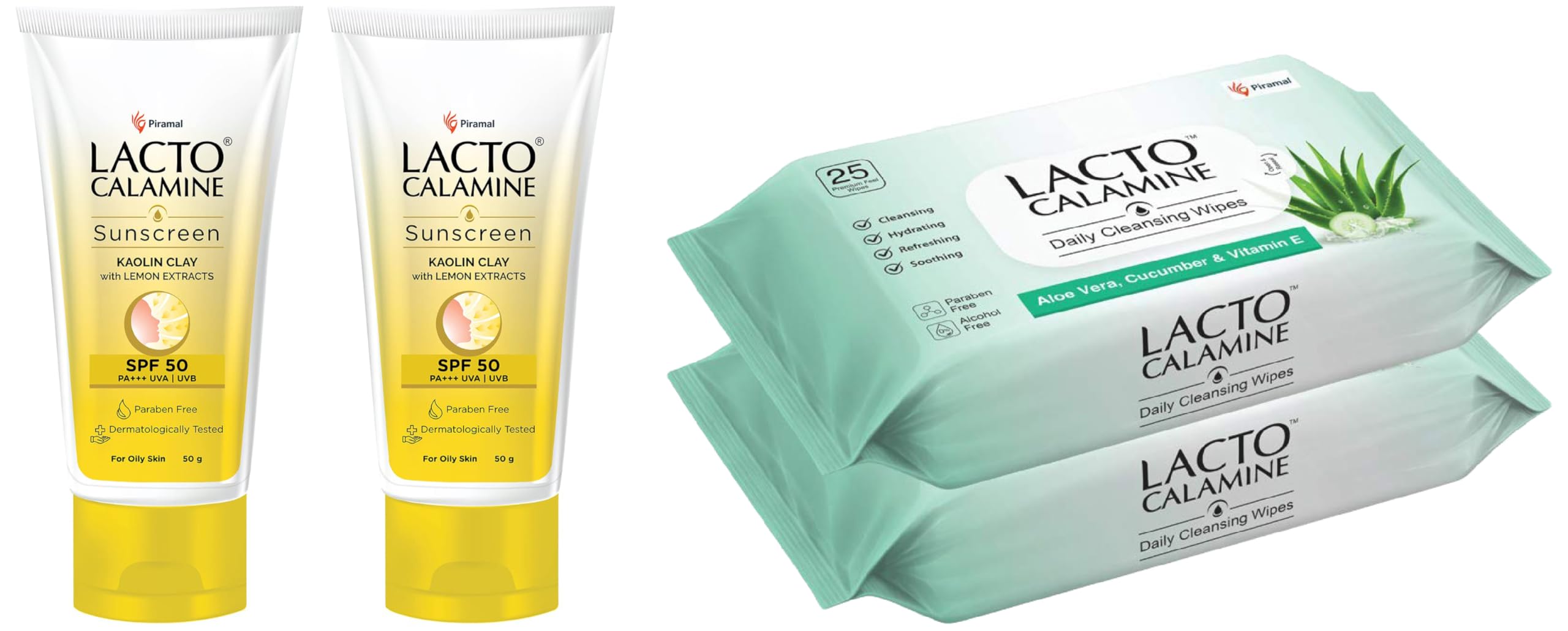 Lacto Calamine Sunscreen SPF 50 | 50g Each - Pack of 2 | PA +++ Sunscreen For Oily Skin | UVA â UVB Sunscreen | Water Resistant & No White Cast | With Kaolin Clay Vitamin E & Lemon ExtractsPacked with the goodness of a host of beneficial ingredients it will not only deliver the desired results that you expect but also care for your skinLacto Calamine Daily Cleansing Facial Wipes 25N Each - Pack of 2 | Wet Wipes for Face with Aloe Vera Cucumber & Vitamin E | Makeup Remover Wipes| HydratingRefreshing Soothing|Paraben & Alcohol FreeLacto Calamine Daily Cleansing Wipes are face wipes that gently cleanse your skin from impurities dirt & pollution. Aloe Vera & Cucumber soothes and refreshes your skin while Vitamin E acts as an antioxidant protecting your skin.
