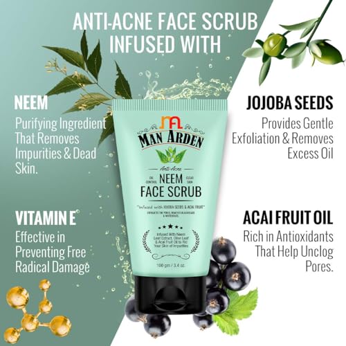 Anti Acne Neem Face Scrub - For Oil Control And Clear Skin - Infused With Jojoba Seeds, Neem Extract, Olive Leaf And Acai Fruit Oil, 100g