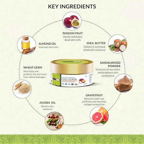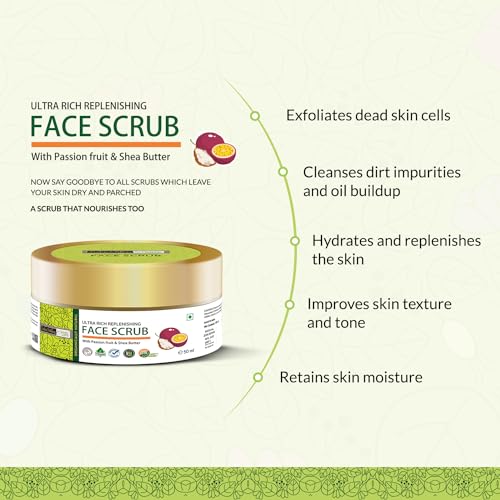 • Indus Valley Ultra Rich Replenishing Face Scrub is infused with the goodness of Shea butter passion fruit Jojoba oil sweet almond oil and wheat germ oil which lightens and brightens the skin.