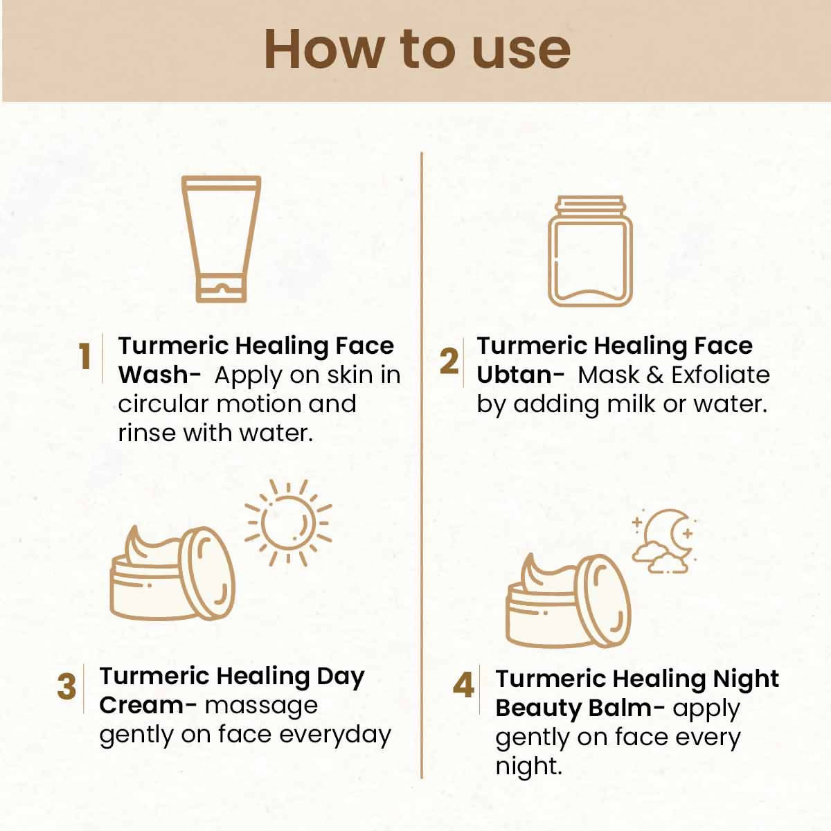 Mother Sparsh Turmeric Healing KitThis combo contains:Mother SparshTurmeric Healing Face Wash: 100mlMother Sparsh Turmeric Healing Day Cream: 40gmMother Sparsh Turmeric Healing Night Beauty Balm: 40gmMother Sparsh Turmeric Healing Face Ubtan: 75gmTurmeric Healing Face Wash targets blemishes, dark spots & supports healthy cell renewalTurmeric Healing Face Ubtan sloughs away dead skin cellsTurmeric Healing Day Cream enhances skin resiliency & shields the skin from UV RaysLegal Disclaimer: The product is guaranteed to be 100% genuine. Product images are for illustrative purposes only. Images/packaging/ labels may vary from time to time due to changes made by the manufacturer's manufacturing batch a
