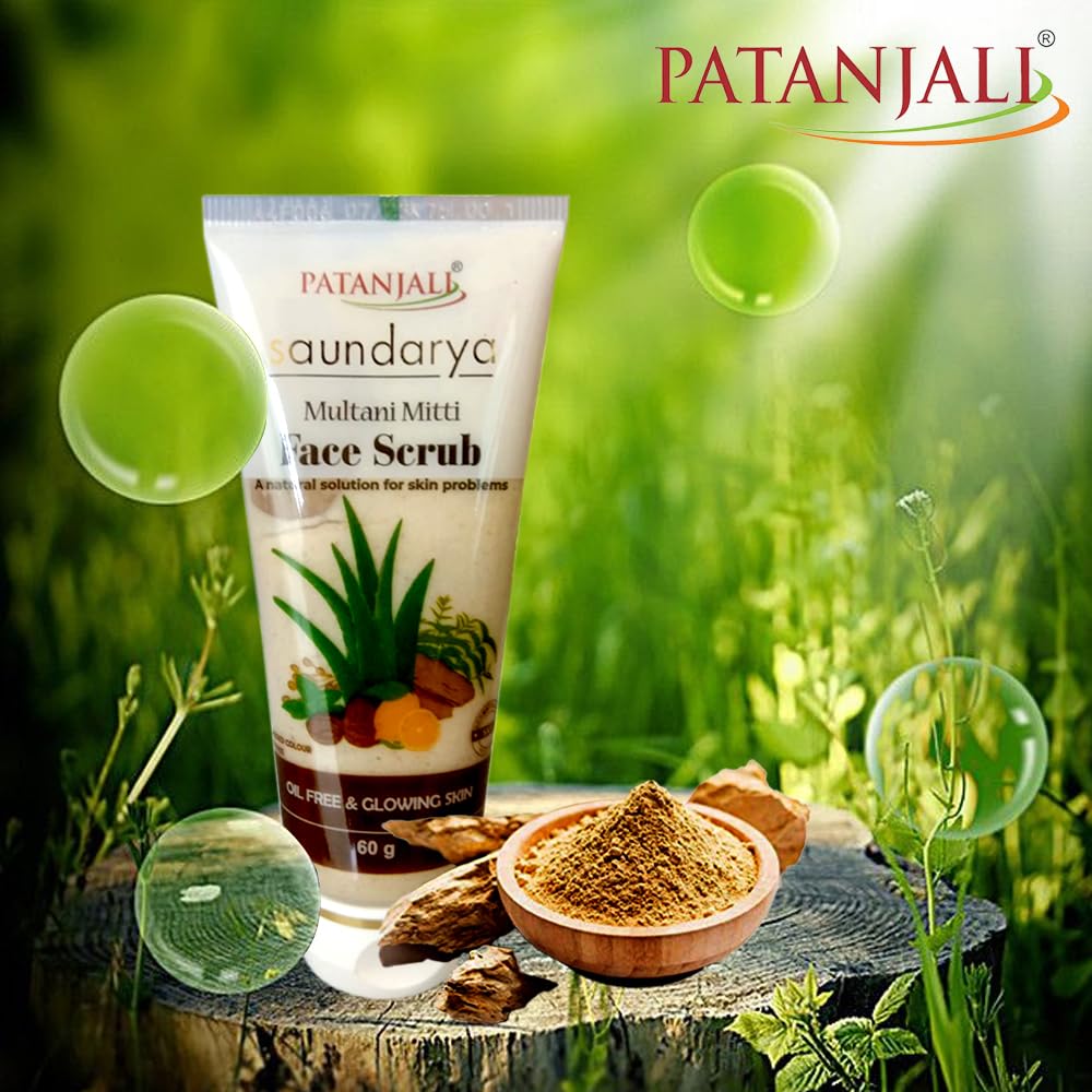 Patanjali Saundarya Multani Mitti Face Scrub is a unique blend of multani mitti herbal extracts vitamins and natural scrubbing beads with soap base. Its deep cleansing action removes impurities black heads and dead skin.