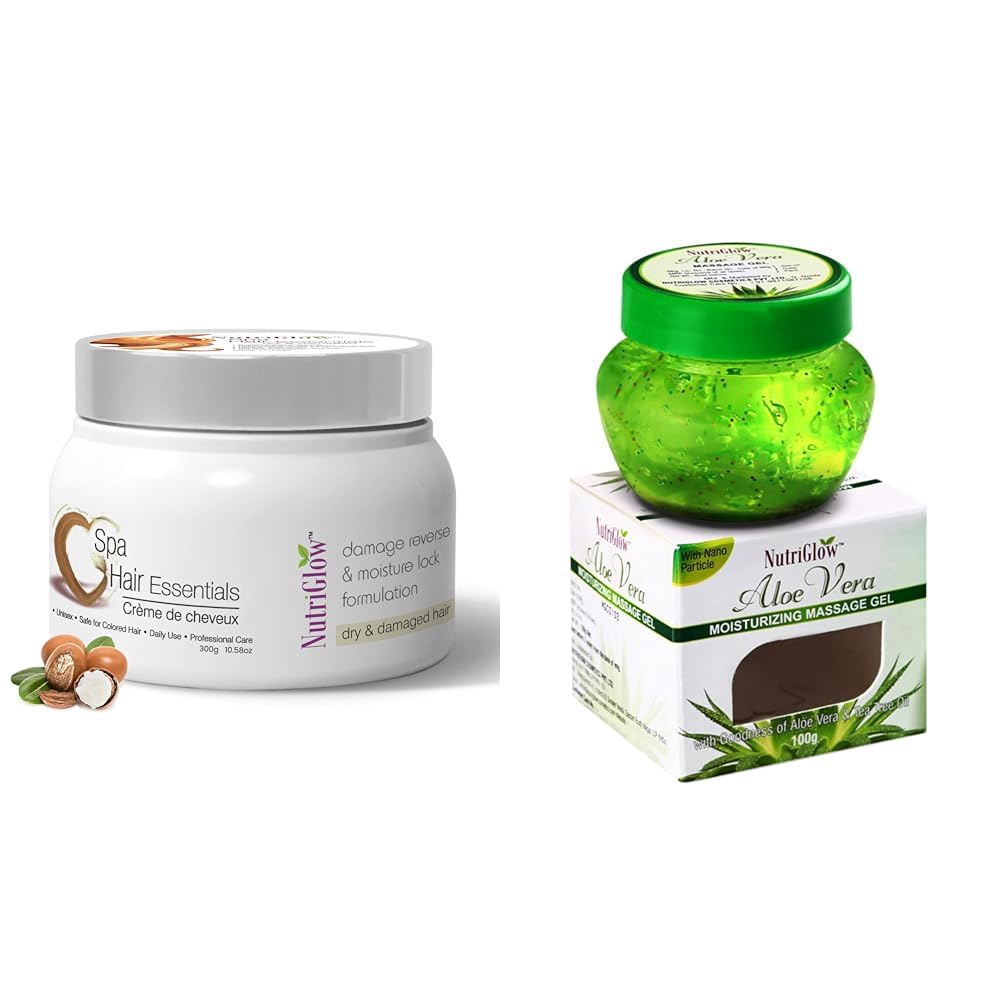 NutriGlow Hair Spa Cream with Damage Reverse & Moisture Lock Formulation for Dry & Damaged Hair - 300gHair spa nourishing cream bath - 490 g ideal for dry and damaged hair. Description the nourishing formula is based on purified water a cationic agent and conditioning silicone. The hair gains manageability and softness for healthy - looking hair with beautiful shine. For dual-action on hair and scalp: blend this cream bath with the appropriate scalp concentrate. Direction of use bland a generous amount of the smoothing cream bath with the corresponding scalp concentrate. Apply the blend to shampooed towel-dried hair. Distribute evenly and massage thoroughly into hair and scalp for 20 minutes.NutriGlow Aloe Vera Gel Great for Face Hair Acne Sunburn Bug Bites Rashes Glowing and Radiant Skin Hydrating Gel Relieves Itchy & Irritated Skin Non Sticky 100gmPamper your skin and hair with NutriGlow Aloe Vera gel the purest and the finest you can get in a bottle. Guaranteed 99 percent pure NutriGlow Aloe Vera gel has been hygienically extracted from ripe robust and succulent aloe vera leaves and packaged with care to retain its natural healing and rejuvenating goodness. Aloe vera has been used for thousands of years for beauty and medicinal benefits across cultures. Aloe vera is loaded with over 75 beneficial nutrients like vitamins enzymes minerals and amino acids. When applied topically on the skin it inhibits microbes and germs moisturizes skin. Similarly when applied to hair and scalp it conditions and protects hair from dryness and damage.