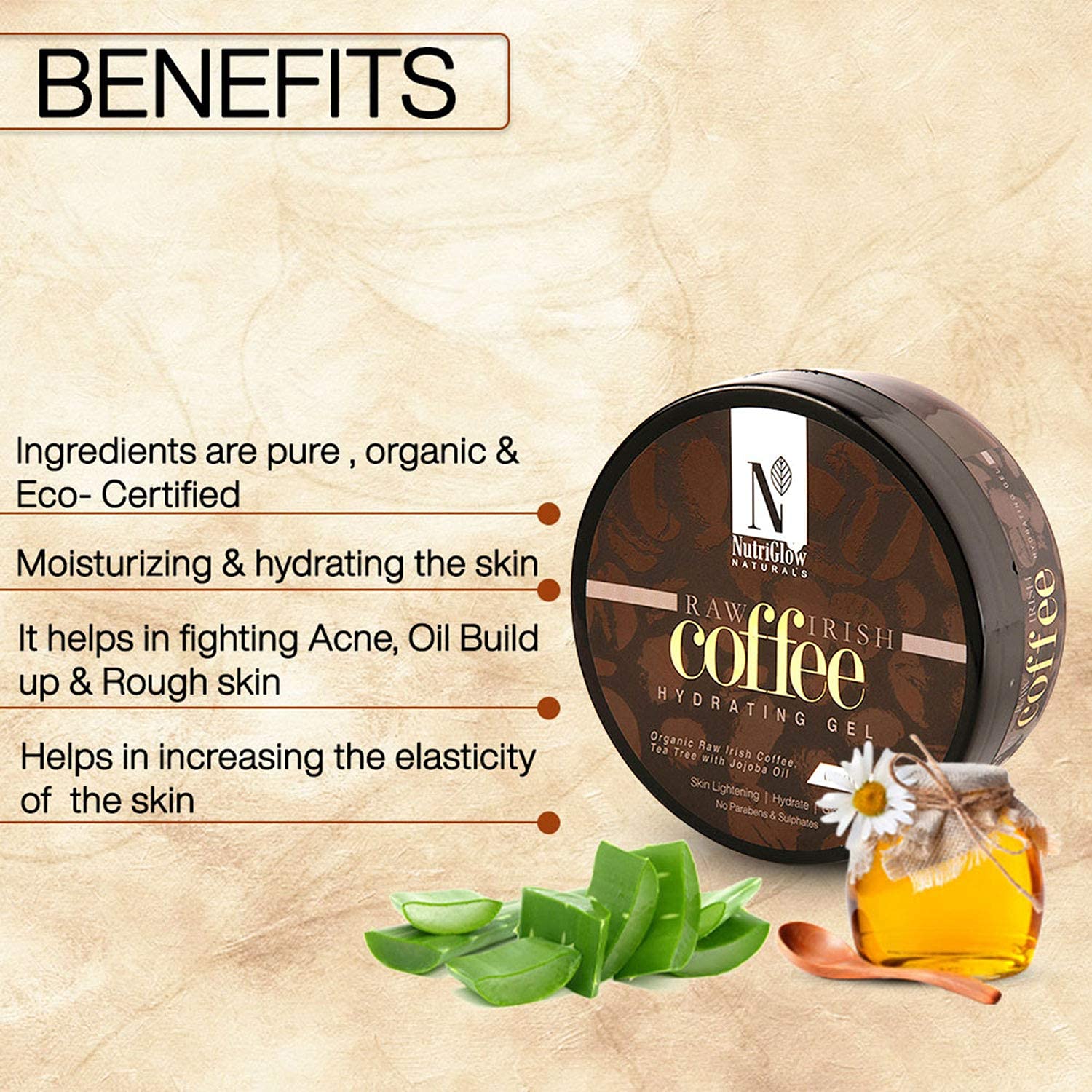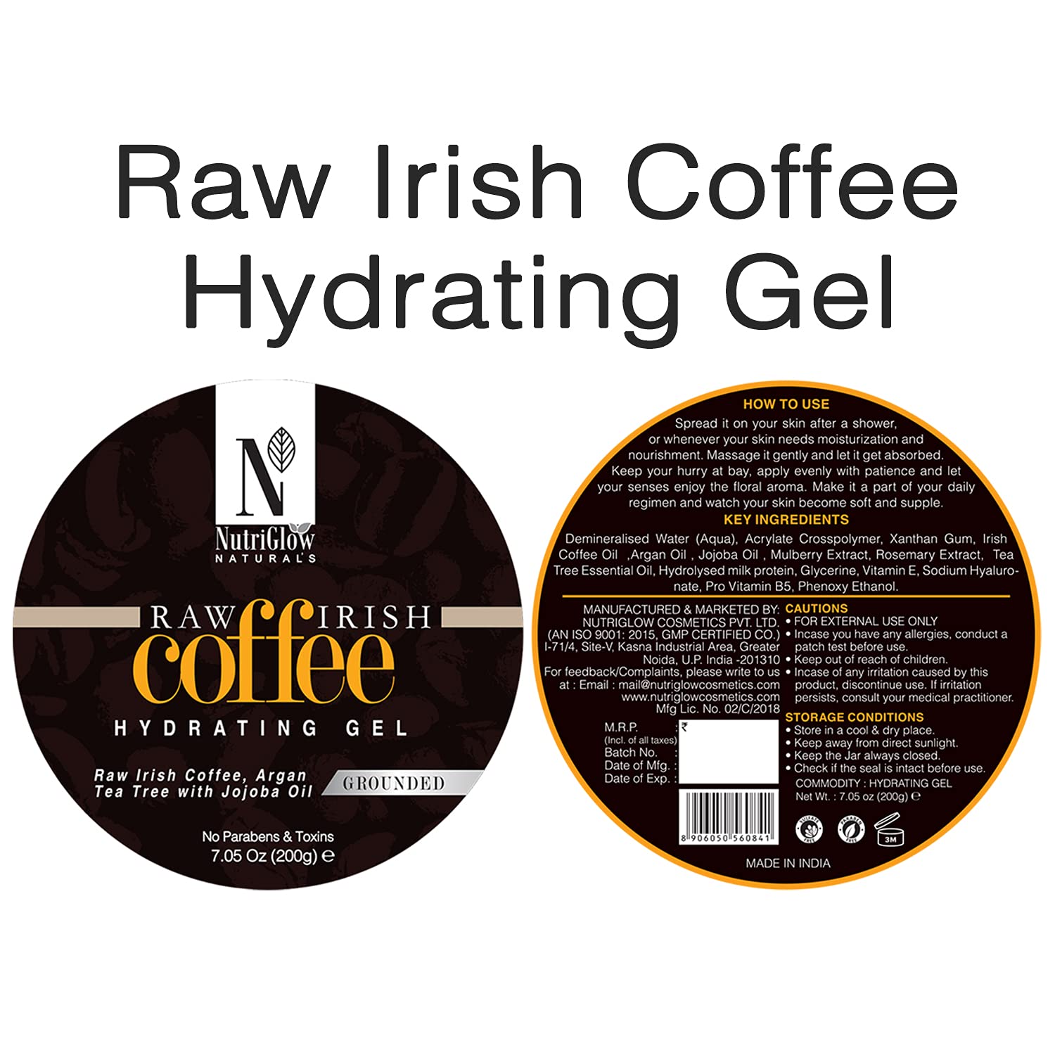 NutriGlow NATURAL'S Coffee Hydrating Gel Organic Raw Irish Coffee With Tea Tree With Jojoba Oil For Skin Lighting Hydrate & Glowing Skin No Parabens & Sulphates 200gm
