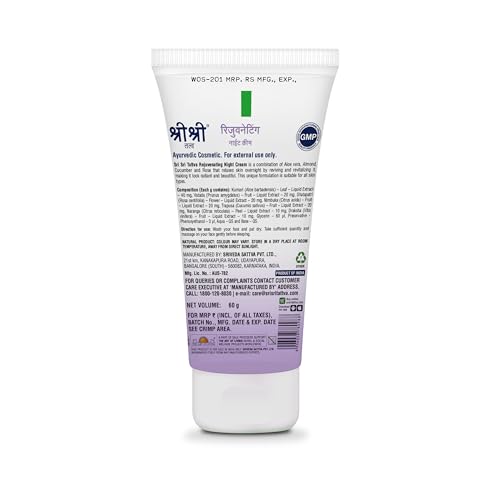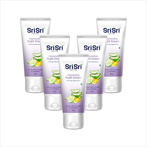 Sri Sri Tattva Rejuvenating Night Cream is a combination of Aloe vera Almond Cucumber and Rose that relaxes skin overnight by reviving and revitalizing it making it look radiant and beautiful. This unique formulation is suitable for all skin types. Ayurvedic Cosmetic. For External Use Only Direction for Use: Wash your face and pat dry. Take sufficient quantity and massage on your face gently before sleeping. Natural Product: Colour may vary Store in a dry place at room temperature. Away from direct Sunlight. Net weight : 60 gm