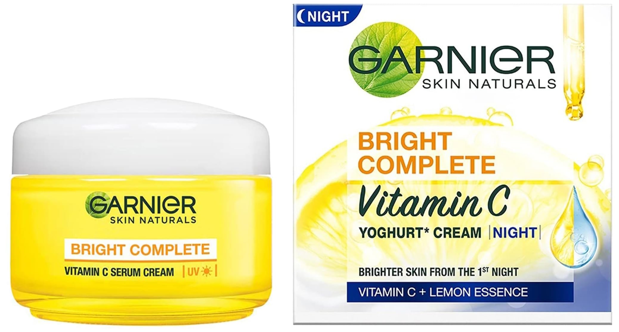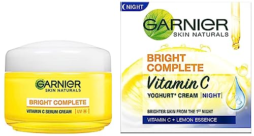 Garnier Skin Naturals Day Cream Brightening and with Sun Protection Bright Complete 45 gGarnier Bright Complete is a face cream for women that is enriched with Japanese Yuzu Lemon. Yuzu Lemon is known as the King of Lemons since it contains a high concentration of Vitamin C and is known for its strong brightening exfoliating and anti-oxidant properties. The cream also has 3X Vitamin C serum which allows this serum-in-cream formula to absorb fast and go deep into the skin. This face moisturizer gives you spot-less brighter skin in 1 week. It instantly brightens the skin and gives it a long lasting glow. It also reduces 3 types of spots â Dark Spots Pimple Spots and UV Spots. The face cream has UV filters to protect the skin from the harsh sun rays. For fast results switch to Garnier Bright Complete skin care. The cream has been dermatologically tested. How to use - Spread evenly on perfectly cleansed face and neck. Avoid delicate eye area.For best skin care results use with Garnier Bright Complete Face Wash and Garnier Bright Complete Yoghurt Night cream. Garnier Bright Complete is a brightening face cream for women. Is enriched with Yuzu Lemon & Vitamin C serum. Gives spot-less brighter skin in 1 week. Reduces dark spots pimple spots and sun spots. Contains UV filters to protect skin from sunGarnier Skin Naturals Night Cream Anti-Dark Spots & Brightening Bright Complete Vitamin C Yoghurt 40 gHelp your skin stay well-nourished all night with Garnier's Bright Complete Vitamin C Yoghurt Night Cream. This lightweight formula is quickly absorbed into the skin the ad leaves the skin feeling non-sticky without giving it any greasy finish. After the first application your skin gets a noticeably brighter glow with dark spots being less apparent. The night cream is enriched with natural ingredients such as Vitamin C lemon essence and yogurt Bifidus which helps reduce dark spots and brightens your skin