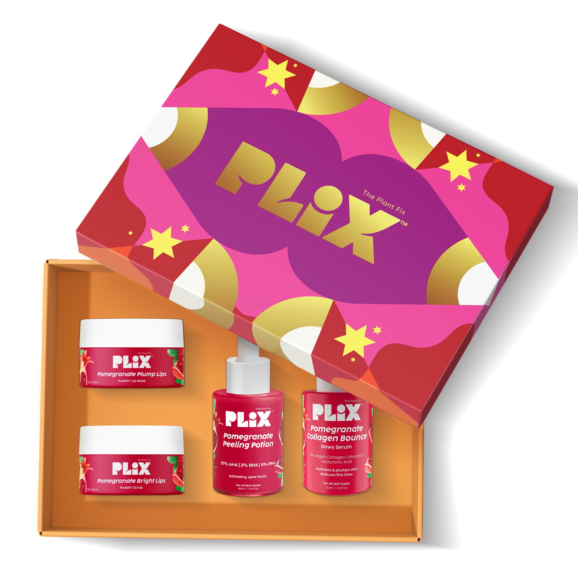 PLIX - THE PLANT FIX Pomegranate Luxe Skin Secrets Gift Box | Festive Gift Set with Lip Scrub, Lip Mask, Peeling Potion and Collagen Bounce Serum | For Him & Her | Limited Edition Gift Box