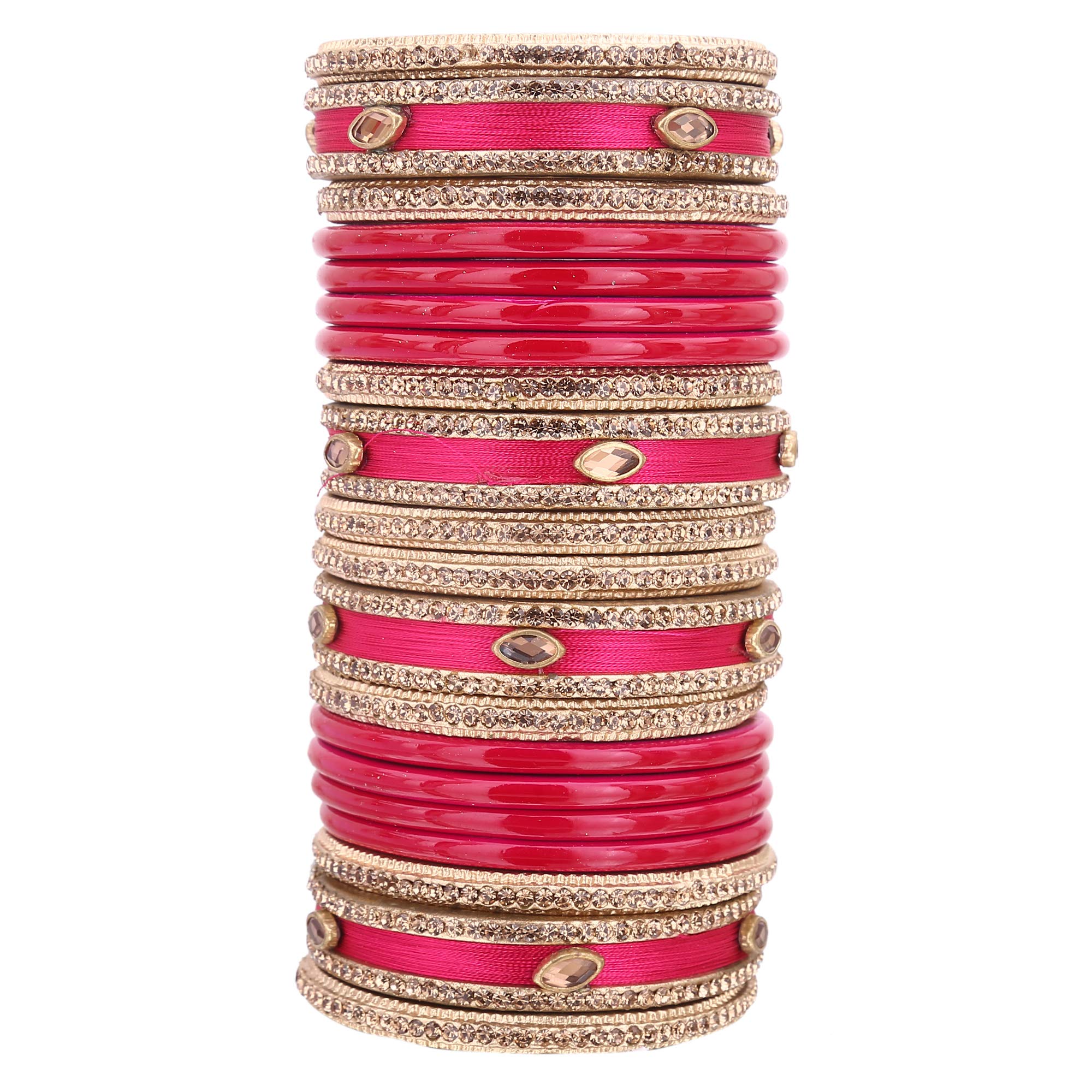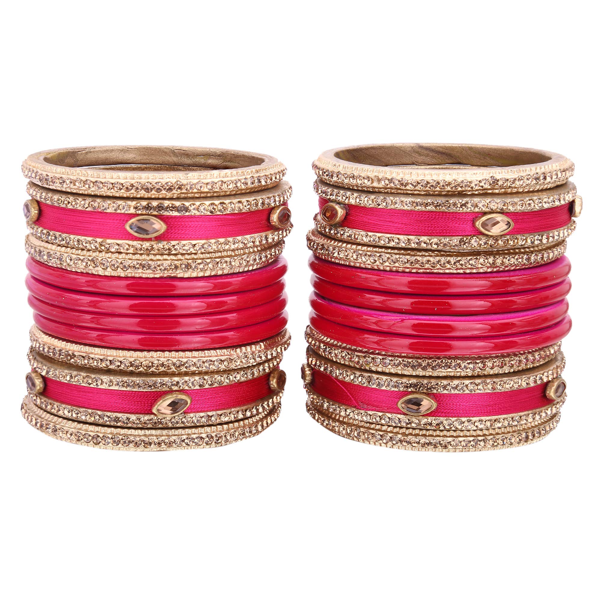 Upgrade your existing jewellery collection with this beautiful rajasthani pair of bridal bangle set from the house of LAC BANGLES. This 20 piece bangle set comes with eight piece bangles studded with golden stones four piece kadas studded woth golden color stones embellished with golden color beads & eight piece red maroon bangles which will enhance your attire & add a magical sparkle to your dazzling persona.Pair it with ethnic traditional or any party wear & create your own style statement.