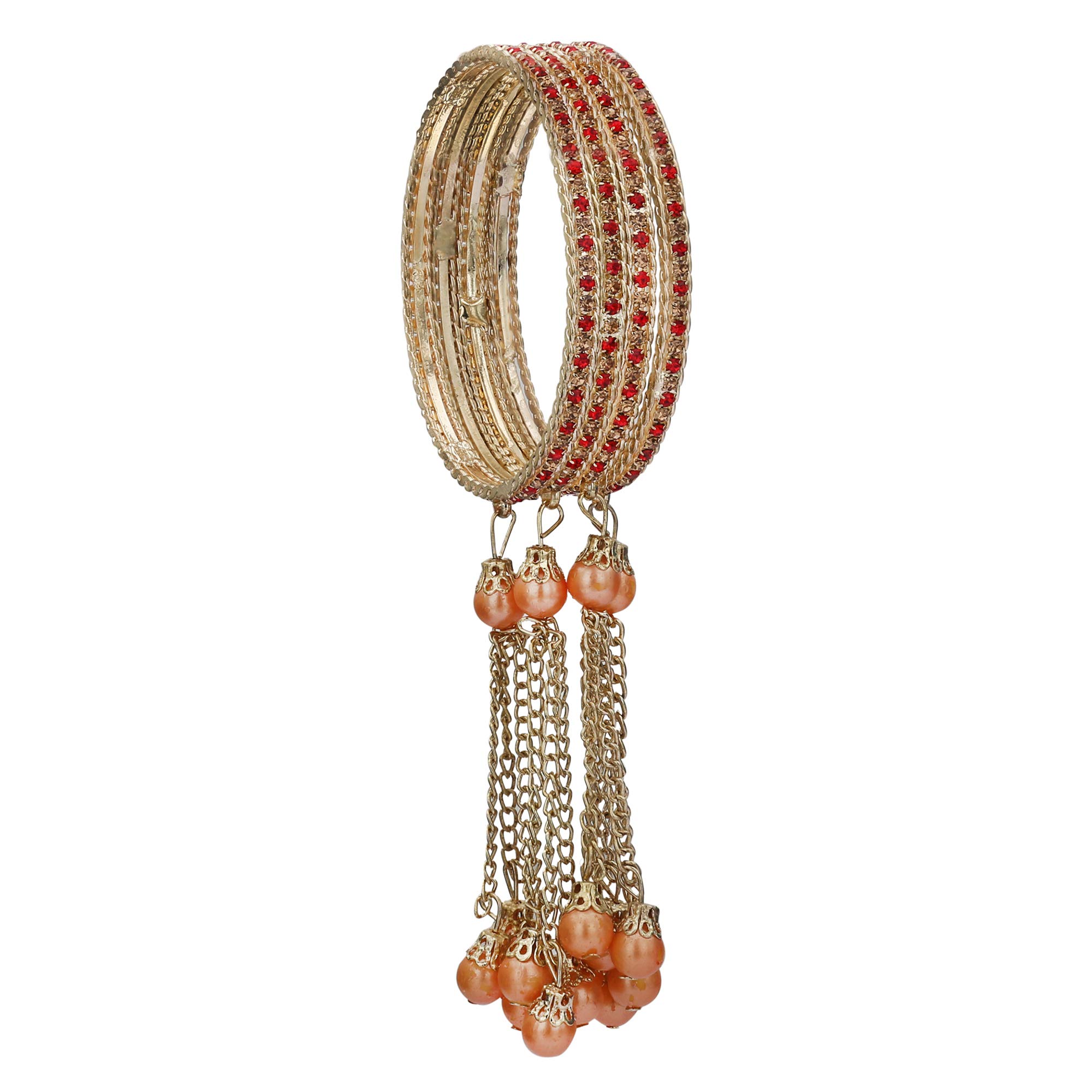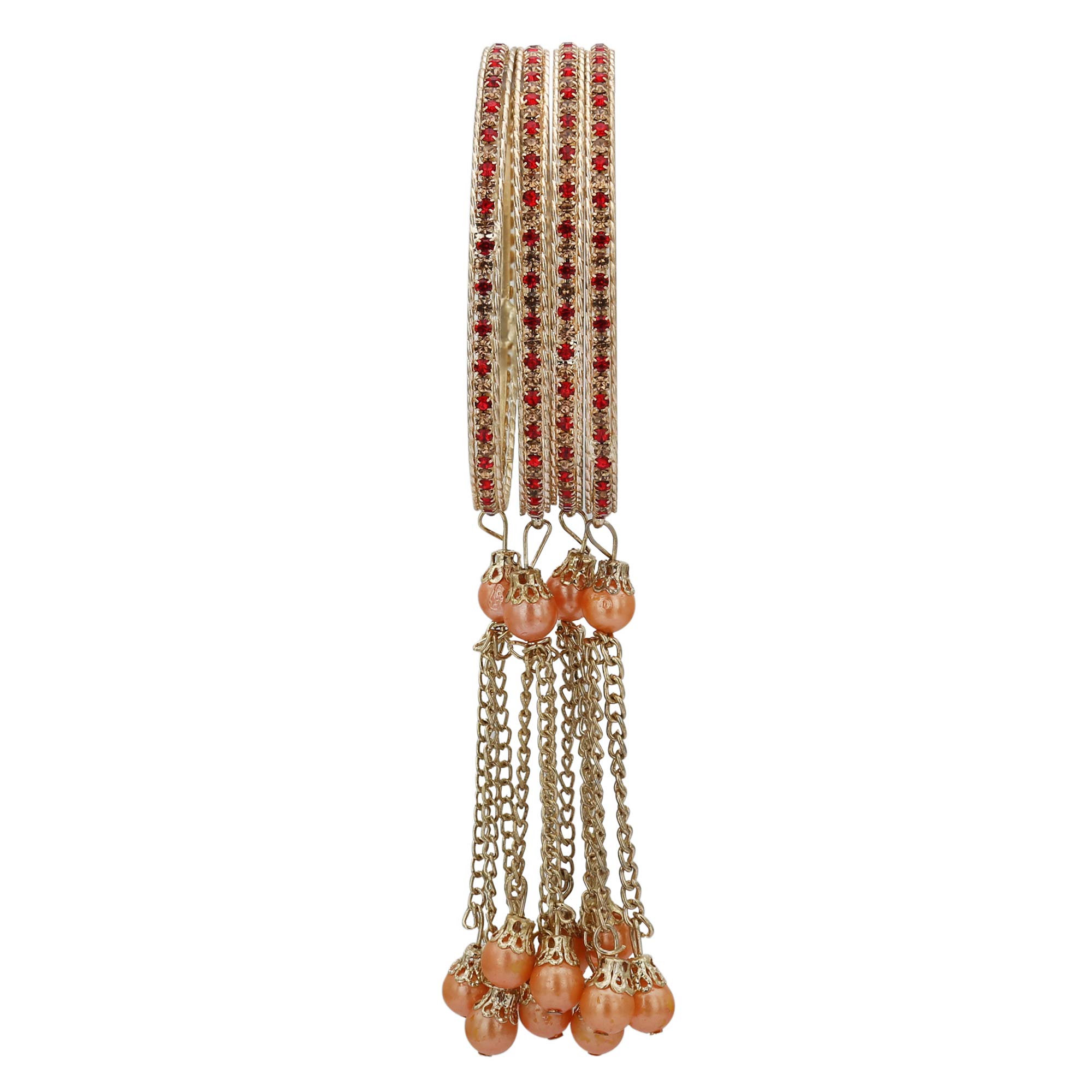 LAC BANGLES presents you an eye-catching wonderful latest design bangles by the artisans of Rajasthan India. This bangle set comprises 4 metal bangles stud with color stones and pearl latkan tassels. This unique Indian handicraft is an all-occasion gift to add grace to any outfit. Pair it with any traditional ethnic designer casual or any party wear & create your own style statement.