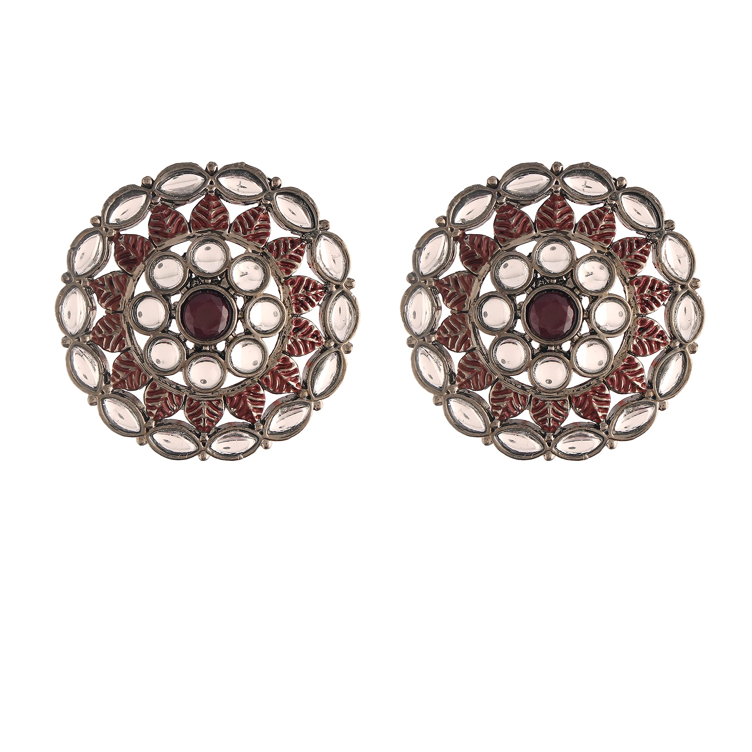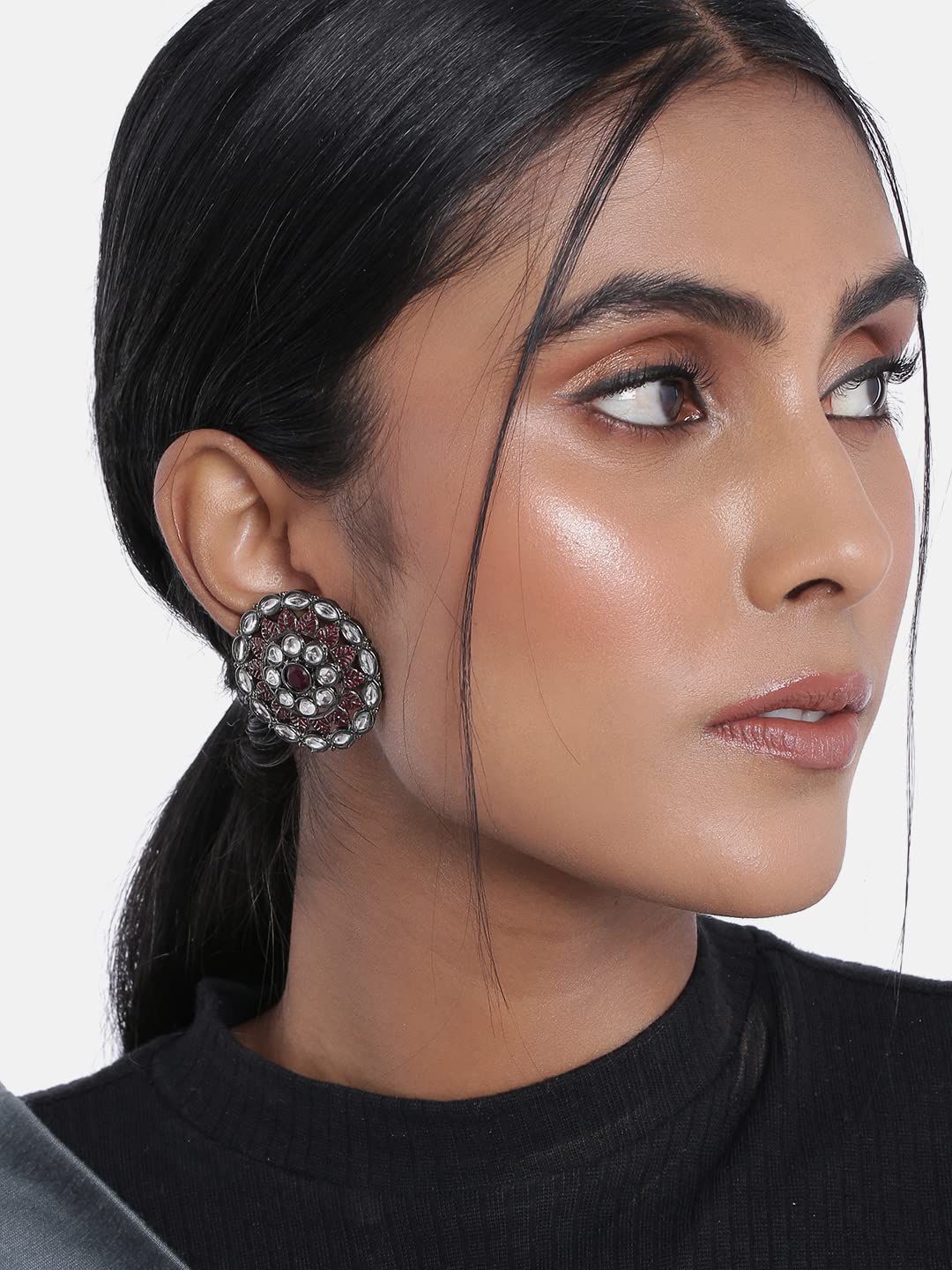 I Jewels Silver Oxidized Indian Wedding Bollywood Kundan Studded Meena Work Designer Circular Stud Earrings for Women(E2932Z)