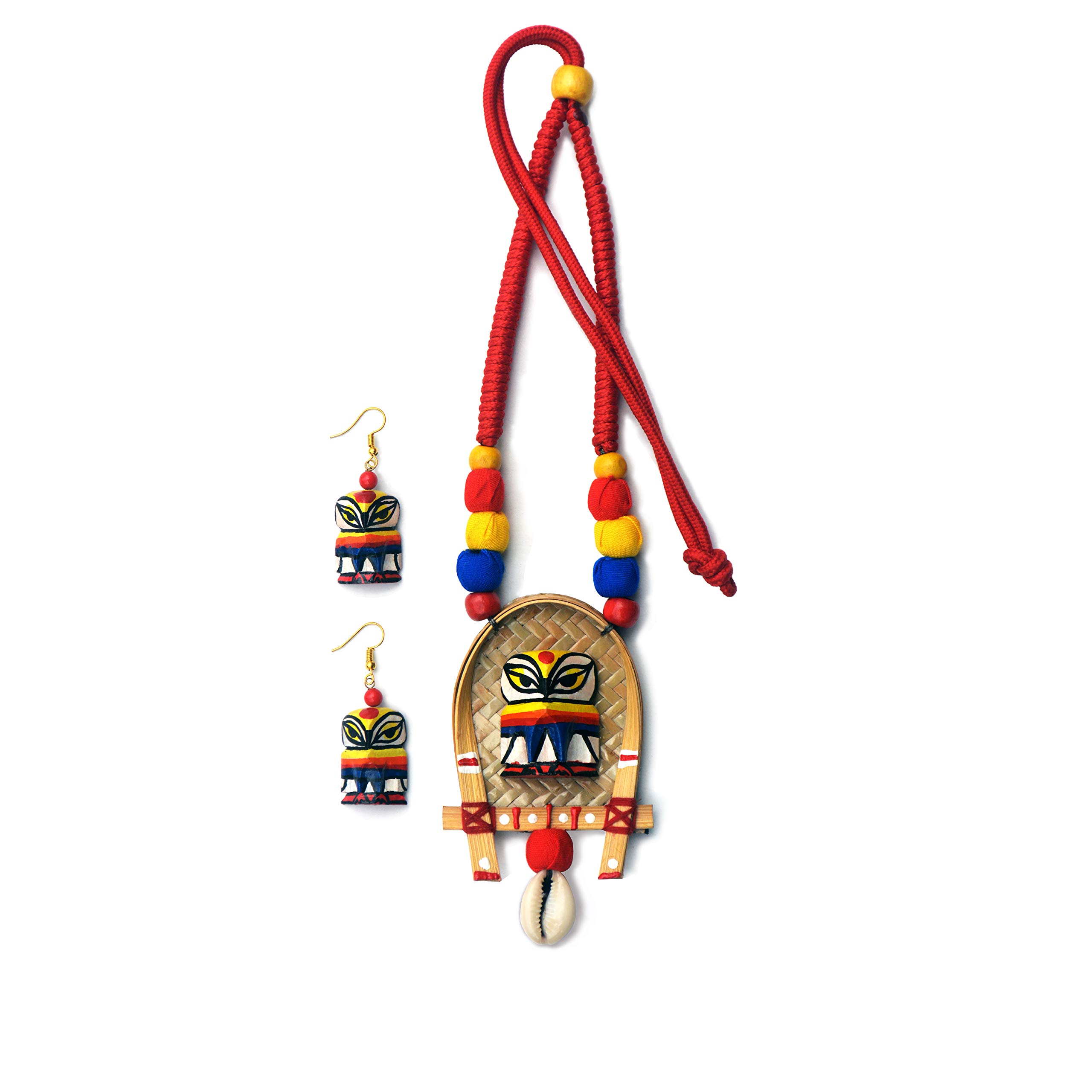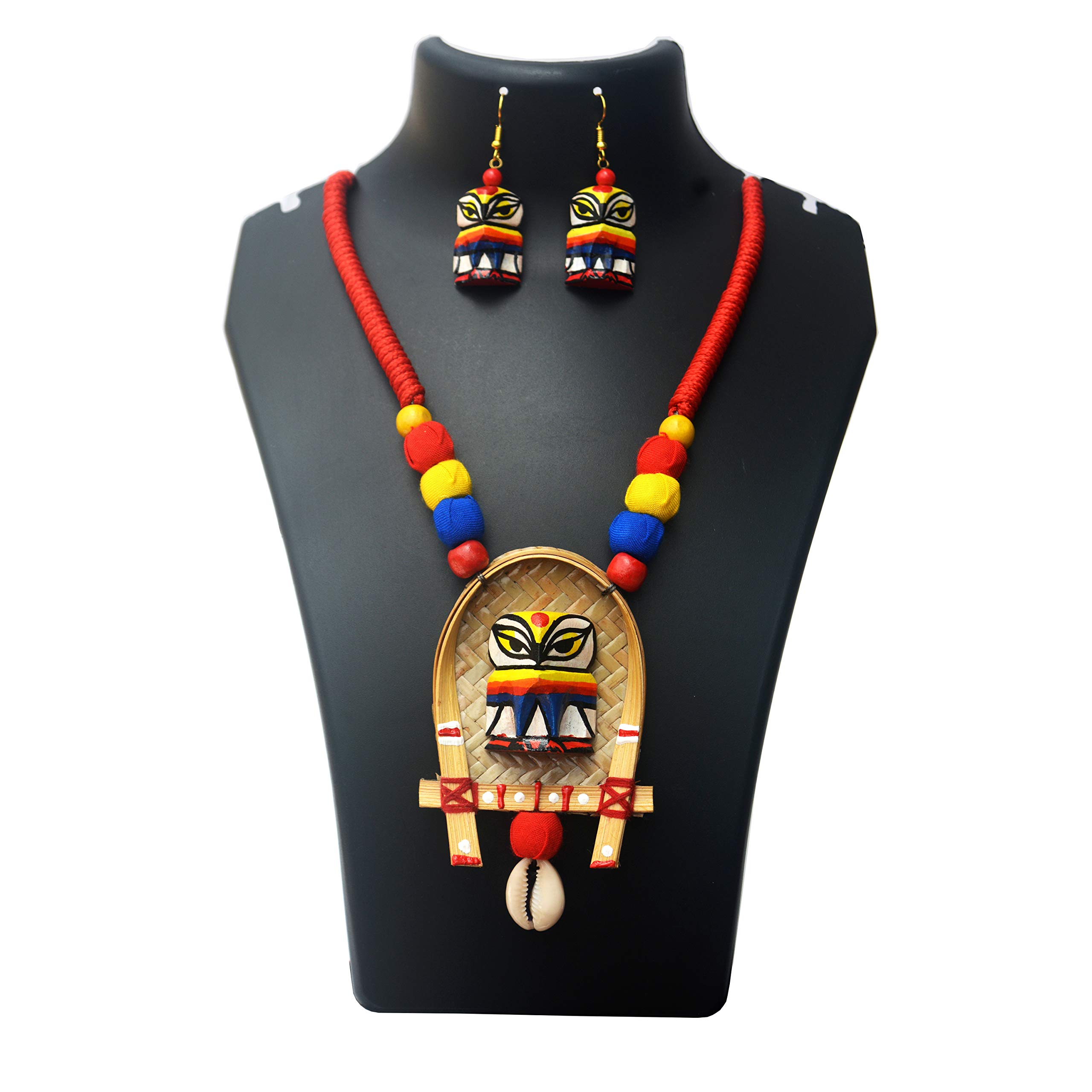 TERRACOTTA JEWELLERY Handicraft Blue Owl Shitolpati Necklace & Earring Sets define the two combinations of the different art form. "Kulo" is a tray which is used in almost all Bengali festivals and occasions from marriage to puja made of bamboo. Especially for Laxmi Puja Kulo is mandatory as goddess Laxmi is God of prosperity & Kulo is Uses for Rice Processing. Here we Used North Indian "Beth" Bamboo to make "Shitolpati". Shitolpati is the Traditional Art of Kuchbihar District of West Bengal. From That Original Shitolpati We Made Miniature Kulo. Used Wooden Craft Owl of Burdwan District but little modified as per our designer in this Jewellery.