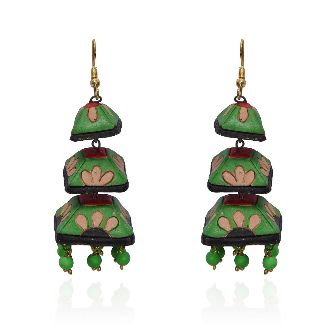 The products in display is made from terracotta material and is finished in an attractive color. Furthermore this product features a Jhumka shape and a design that renders it with the versatility to be worn as a festive occasion wear