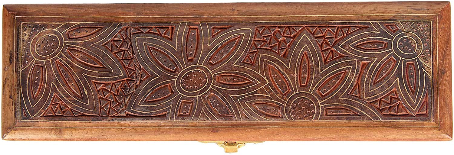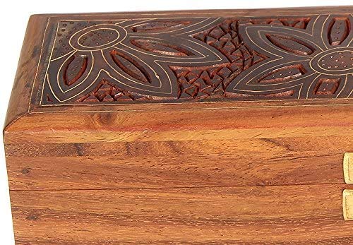 This hinged wooden jewelry box with beautiful decorative hand carved drawing and inlay work has been handmade by artisans of pilkhua in utter pradesh state of north india Jewelry boxes are thoughtful gifts for women and girls as they can be treasured for years to come and displayed in a special place where they can be seen daily. If you're looking for a cheap jewelry box to give as an inexpensive gift to someone special but still want to make sure that lovely lady or girl gets a gift of the absolute finest quality our Handmade Indian Wood Jewelry Box is the perfect choice. Our jewelry box for girls and women is a design you won't find in stores or anywhere else on Amazon. Each of jewelry box is handcrafted out of sheesham wood an Indian renowned for its durability and handsome natural grain. The Handmade Indian Wood Jewelry Box is made with traditional techniques that have been passed down through generations of artisans from Saharanpur India. The skills of these woodworkers are world renowned and make this jewelry box truly beautiful and capable of standing the test of time. On the lid of the Handmade Indian Wood Jewelry Box is a beautiful motif produced out of inlaid brass. The technique is called tarkashi and involves carefully hammering pieces of genuine brass into engravings in the wood. Small holes are punched into the flowers to add a pleasing texture to the design. The careful attention to detail makes the jewelry box more than just a place for storing earrings bracelets rings and necklaces. The piece doubles as a decorative item that can be displayed anywhere in the home. The Handmade Indian Wood Jewelry Box measures 8 inches by 2.5 inches by 2 inches outside. Inside the box's dimensions are 7.25 inches by 1.75 inches by 1 inch. The box features a brass clasp and brass hinges to complement the color of the inlay. Choose a cheap jewelry box that is low in price but not cheaply made.