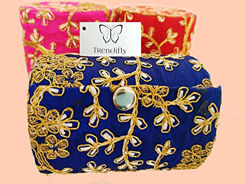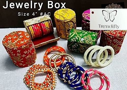 Trendifly brings for customer a Fully Embroidery wood design Bangle box. so this is very durable long-lasting and very useful. This has an attractive and elegant look and has embossed flower circle design which increases the beauty of this bangle box. This is used to organize your bangles systematically and protect them from breakage so keep delicate your bangles safely. Handmade with durable ply with velvet coating premium quality and sophisticated look. Keeps delicate bangle safe and dust free a perfect gift durable lasts for years displayed bangles are for demonstration. It's a best option to use while travelling and in home it will help you to keep your heavy bangles in a separate cover from other items in your luggage lock. Now organize your bangles systematically and protect them from breakage. Ideal Choice For: wooden bangle storage box Bracelet Box Bangle Box Bangle case Bridal Wedding Box Gift (Shagun) Box Wrist Watch Box kit Organizer earring box etc. Its MADE IN INDIA ECO FRIENDLY AND EMPOWERMENT TO WOMEN. BEST FOR GIFTING PURPOS.