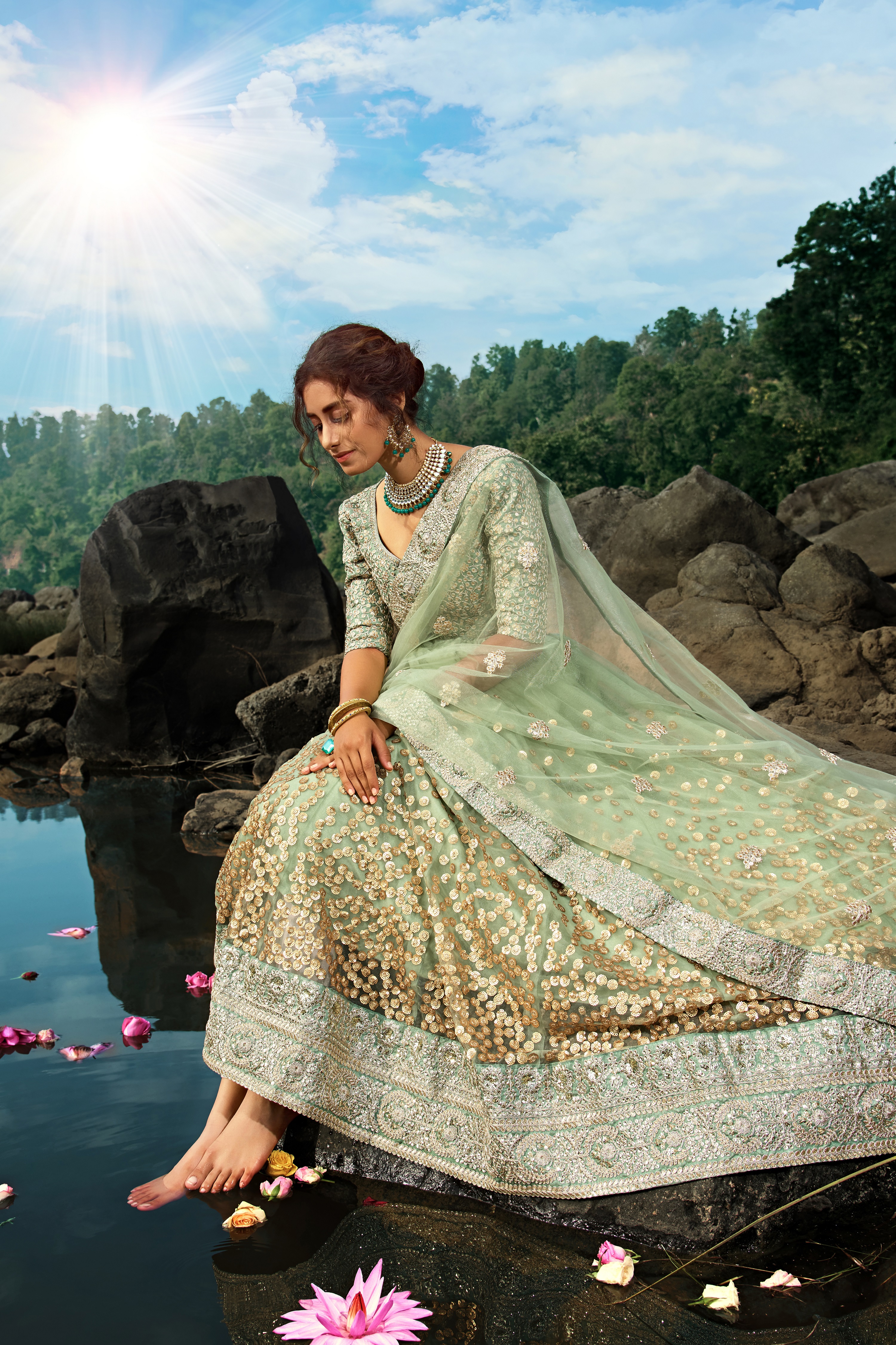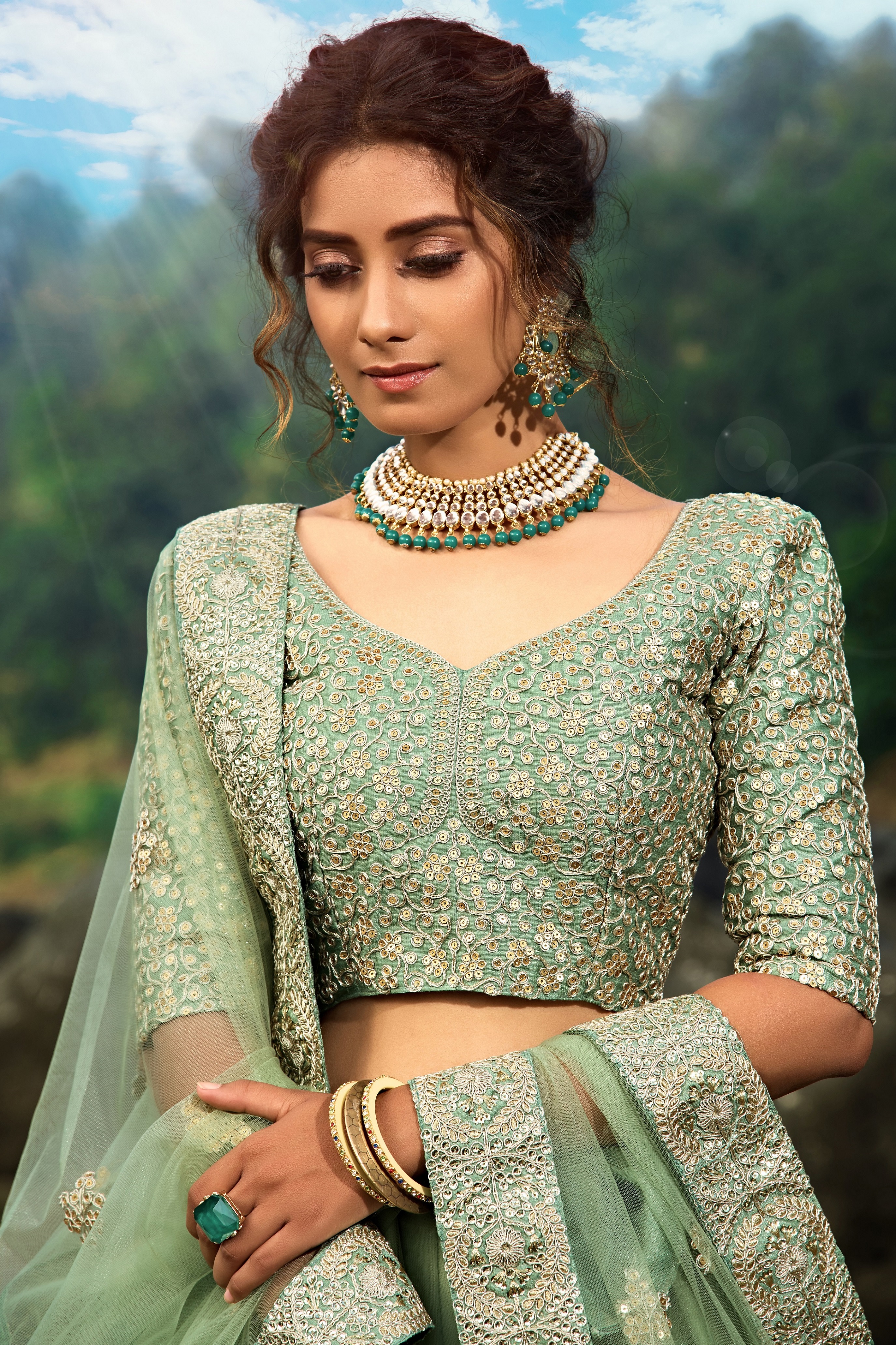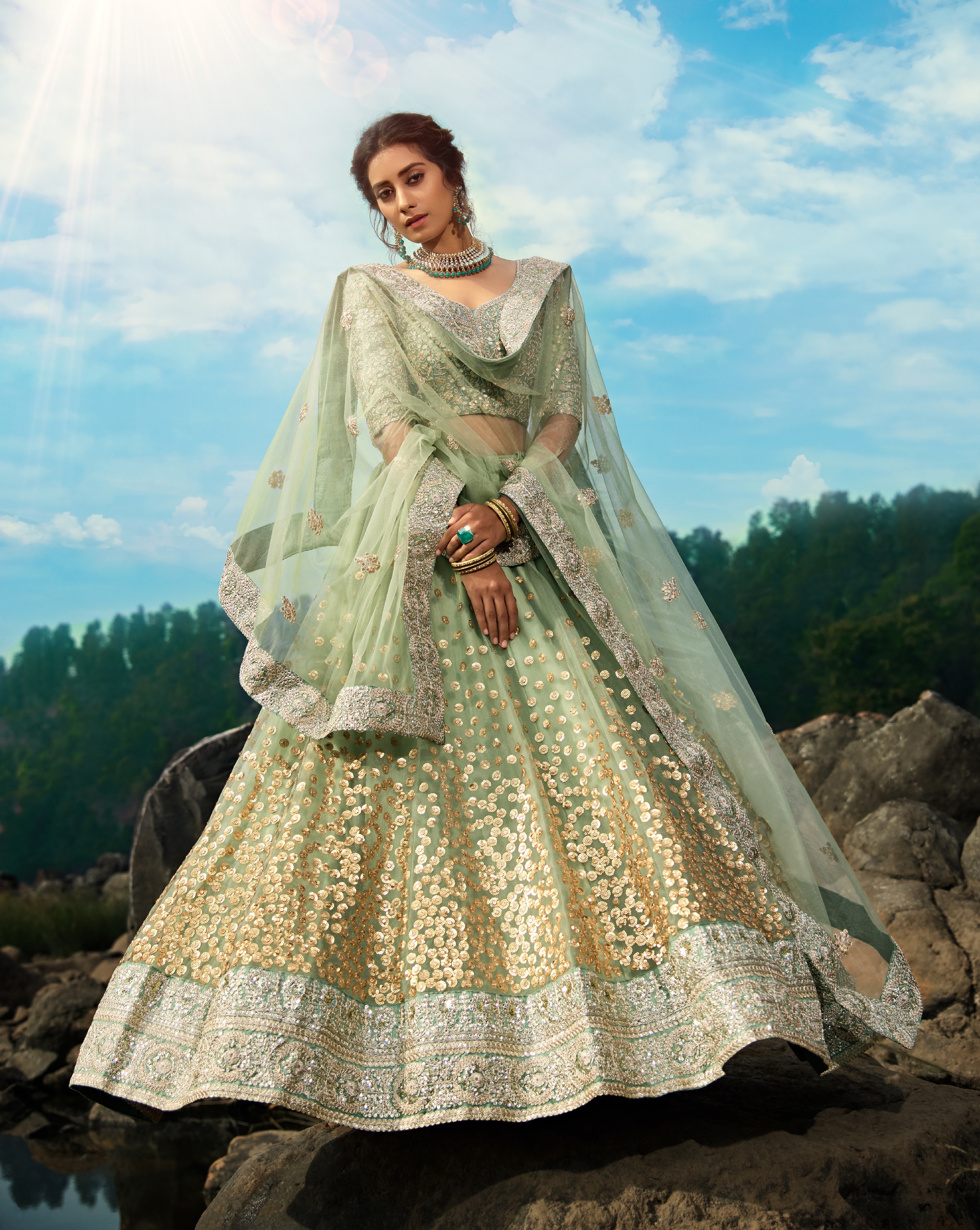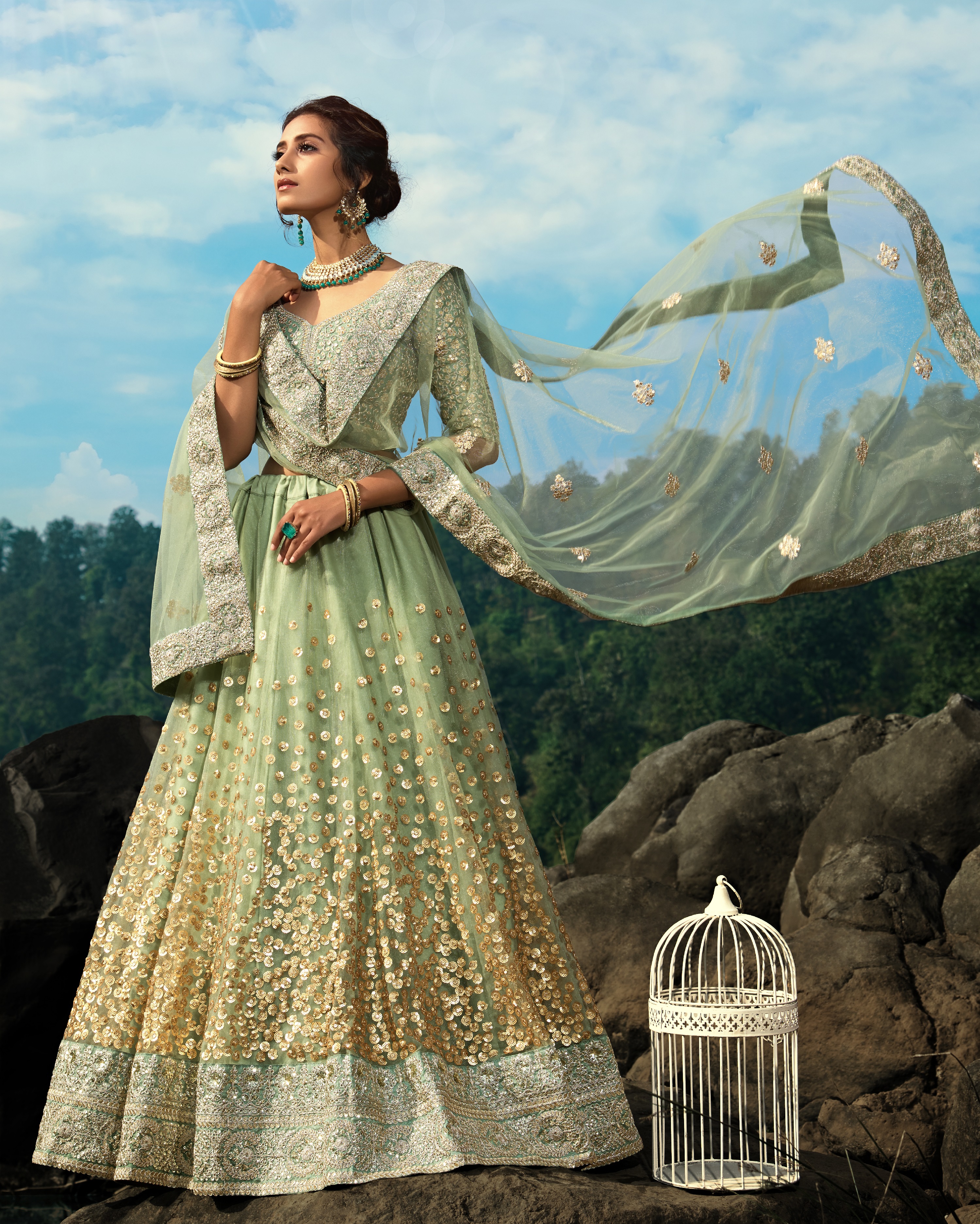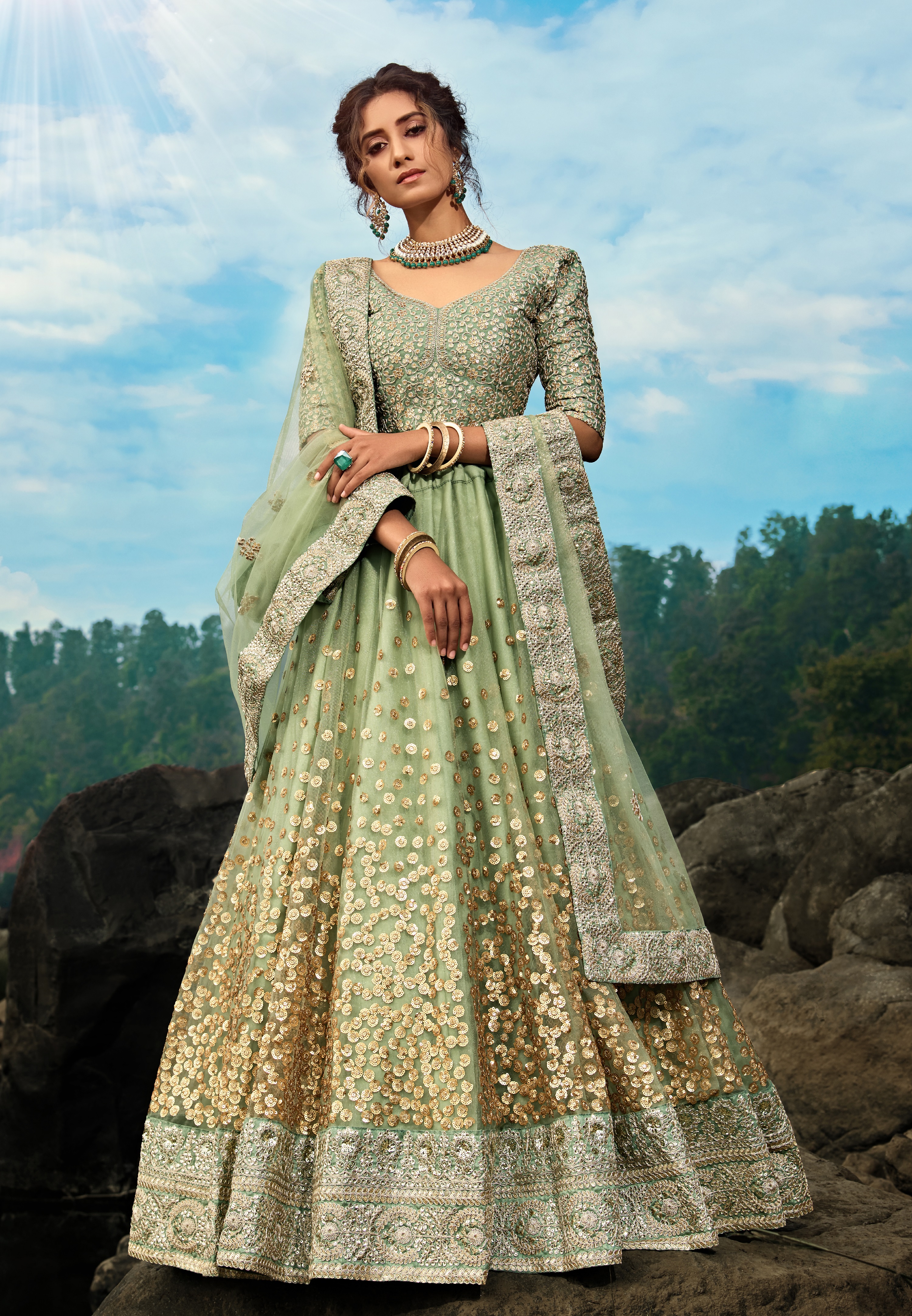Elevate your ethnic look with this green net lehenga featuring sequience work work. Designed for festive occasions and celebrations, it offers a graceful flow and timeless appeal.Crafted from lightweight net fabric with a semi-stitched finish, this lehenga ensures comfort and easy customization. Dry clean recommended.