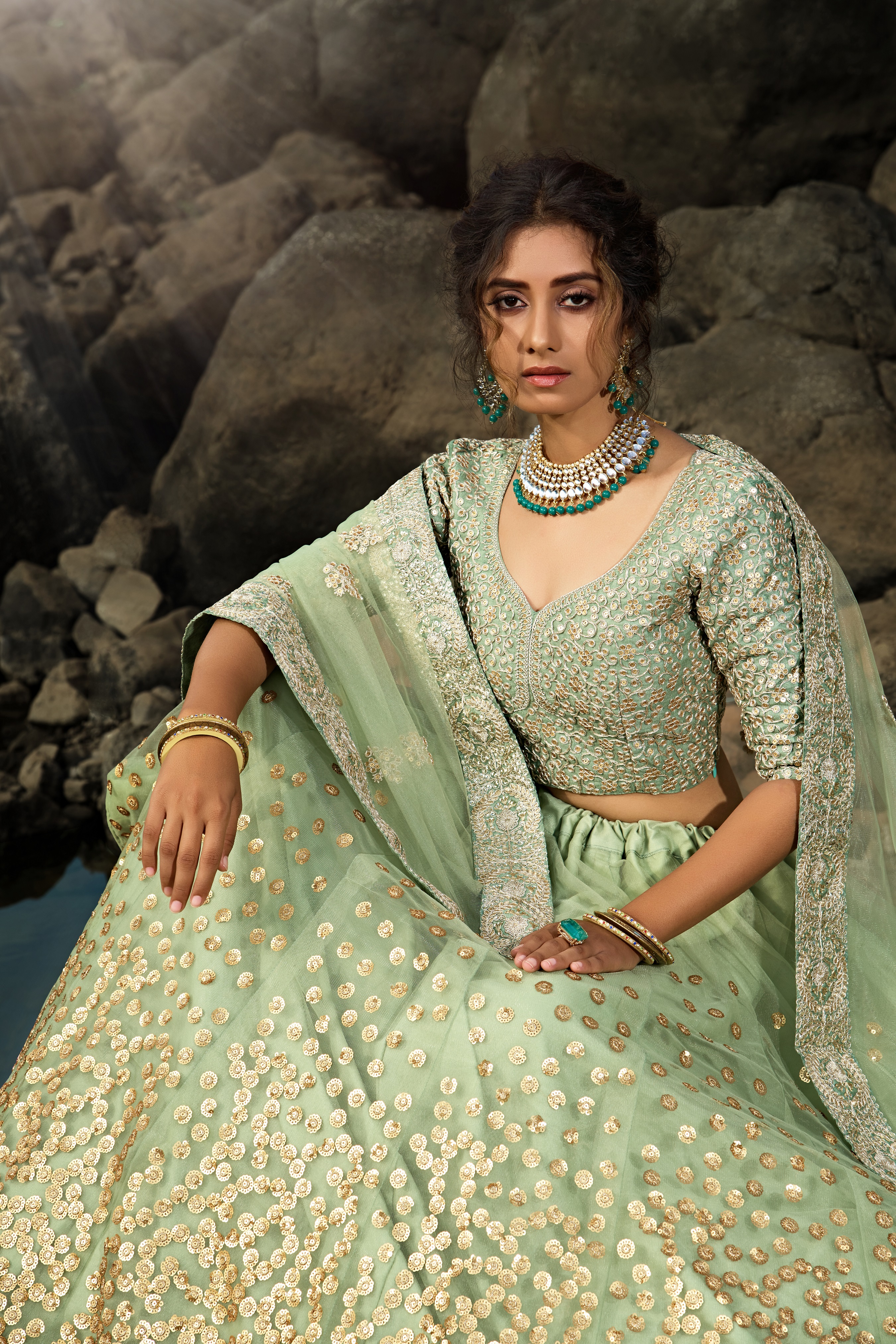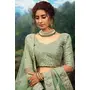 Womens Green Net Sequience Work Lehenga Set