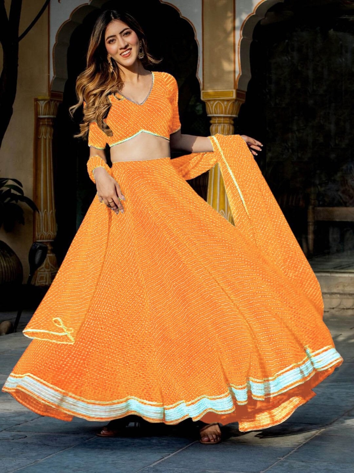 Womens Orange Georgette Lehariya Lehenga Set