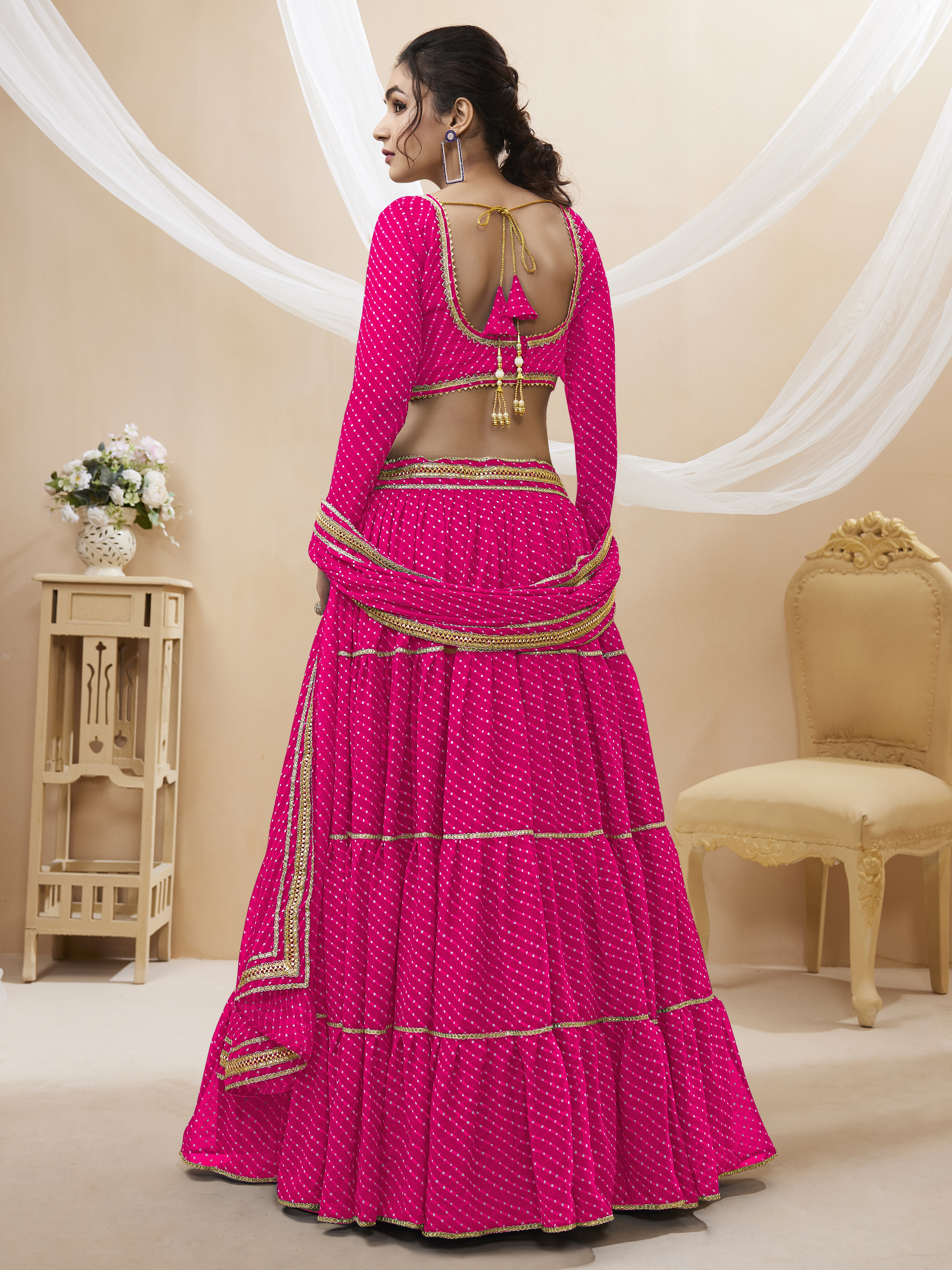 Elevate your ethnic look with this pink georgette lehenga featuring lehariya work. Designed for festive occasions and celebrations, it offers a graceful flow and timeless appeal.Crafted from lightweight georgette fabric with a semi-stitched finish, this lehenga ensures comfort and easy customization. Dry clean recommended.