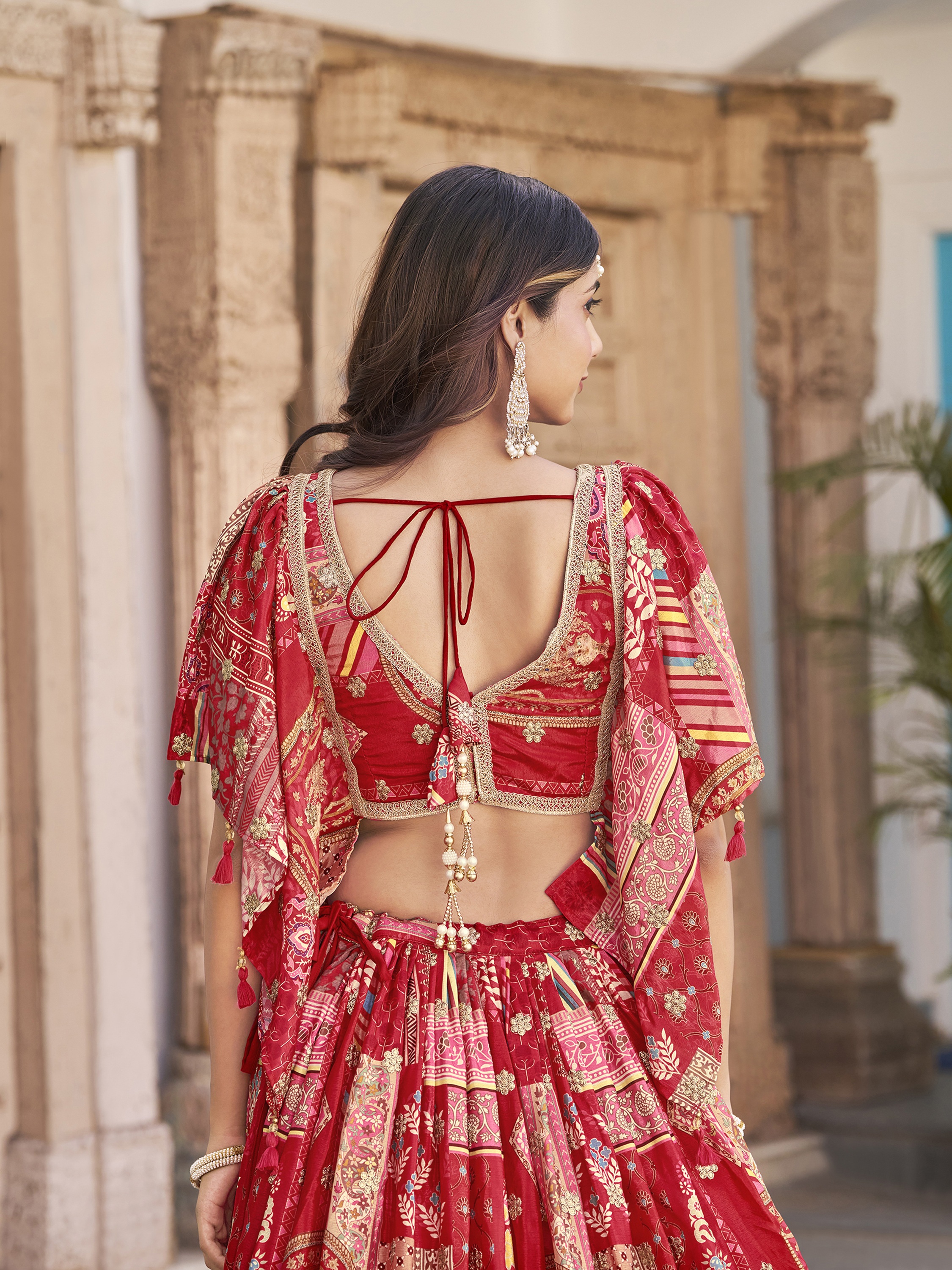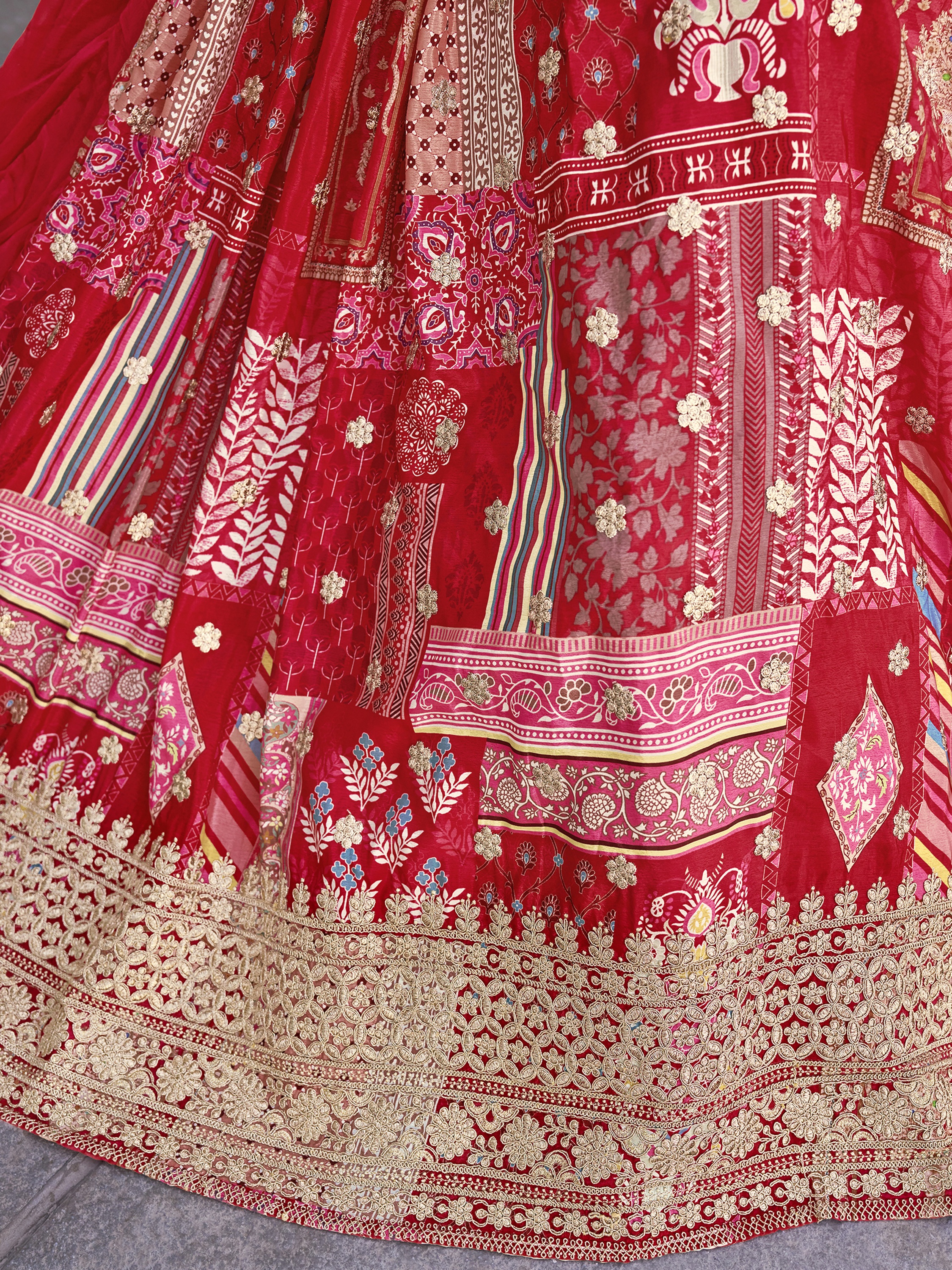 Elevate your ethnic look with this red chinnon lehenga featuring dori embroidery work. Designed for festive occasions and celebrations, it offers a graceful flow and timeless appeal.Crafted from lightweight chinnon fabric with a semi-stitched finish, this lehenga ensures comfort and easy customization. Dry clean recommended.