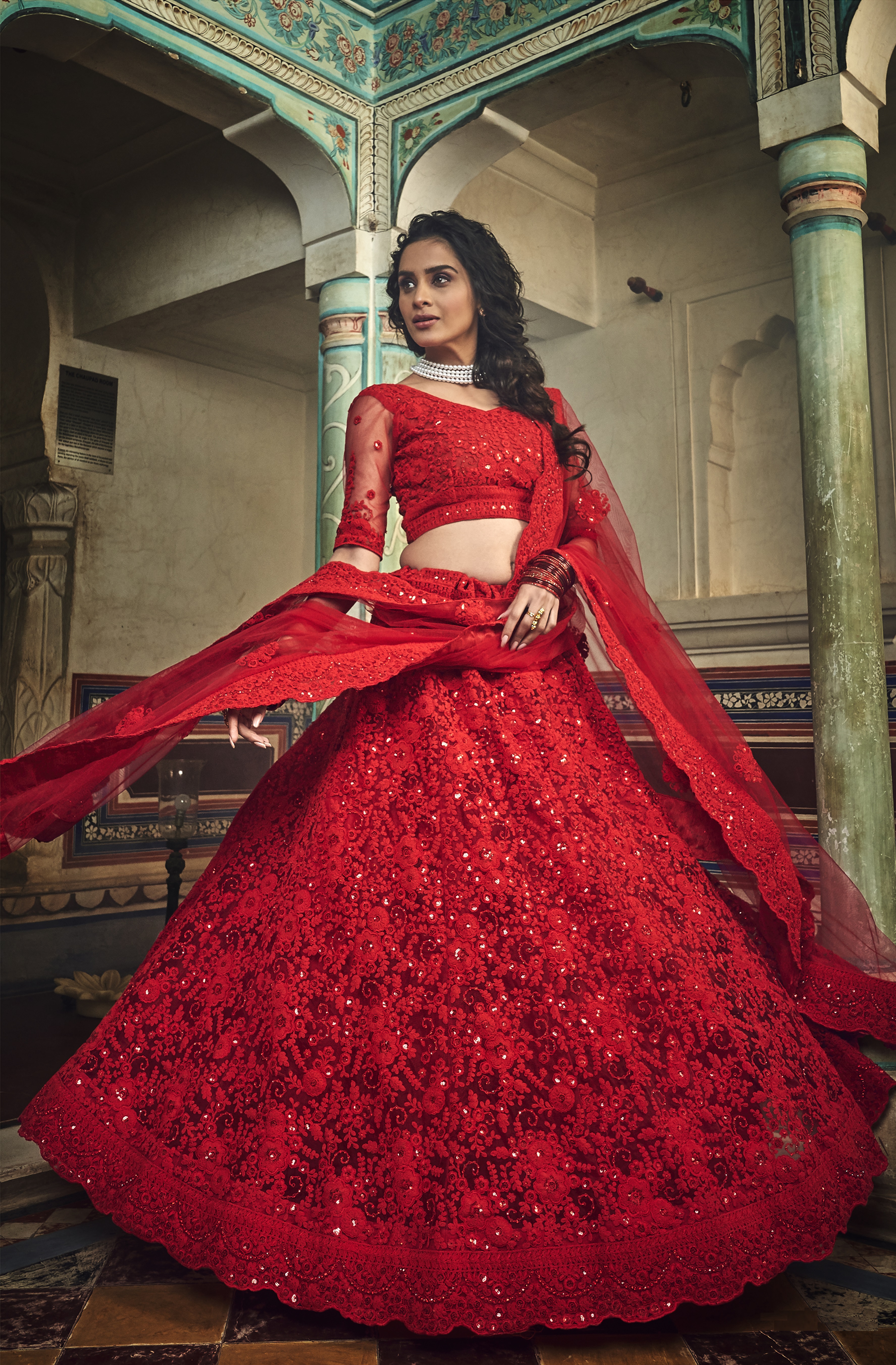 Womens Red Net Thread Embroidery Lehenga Set