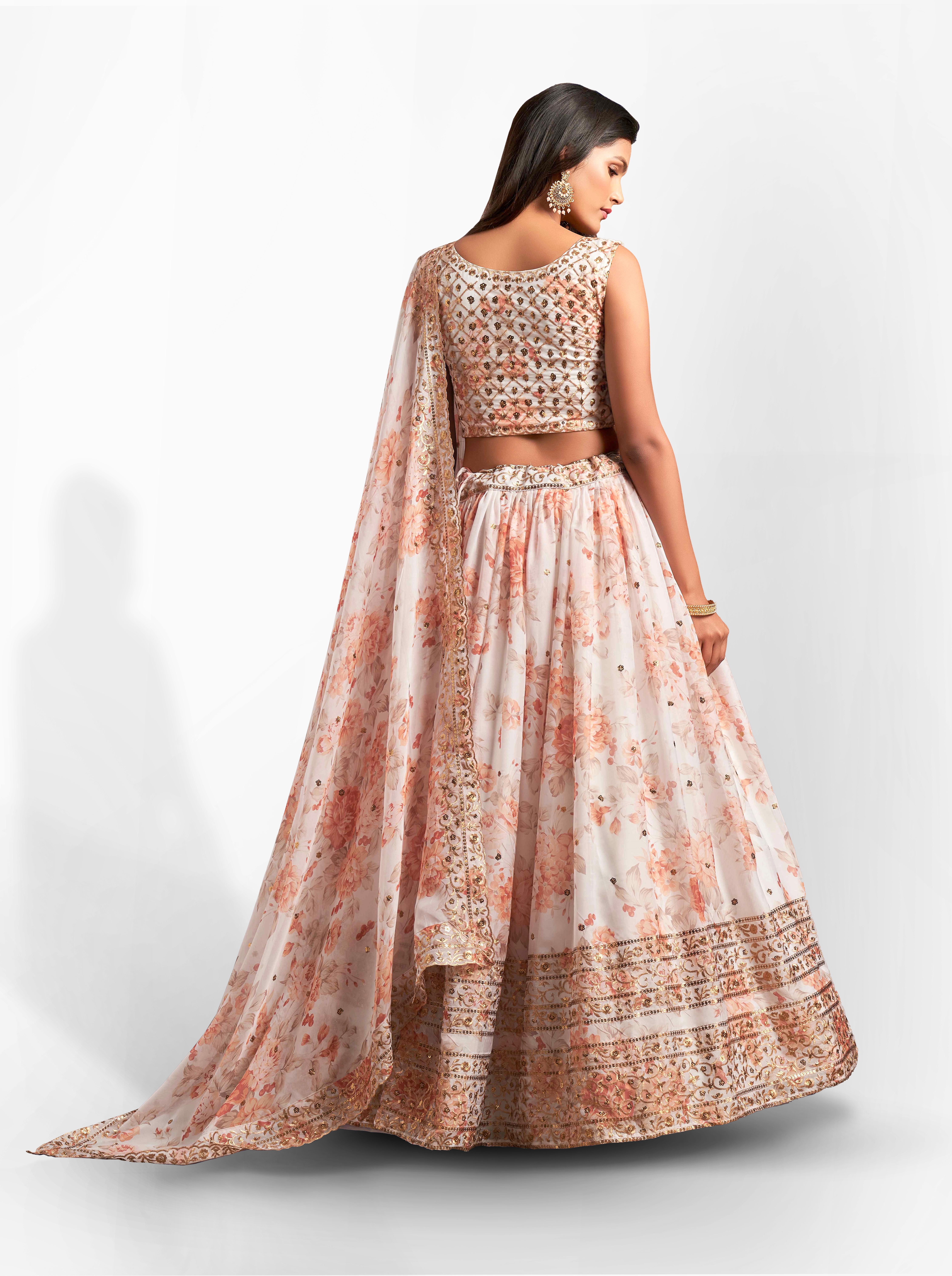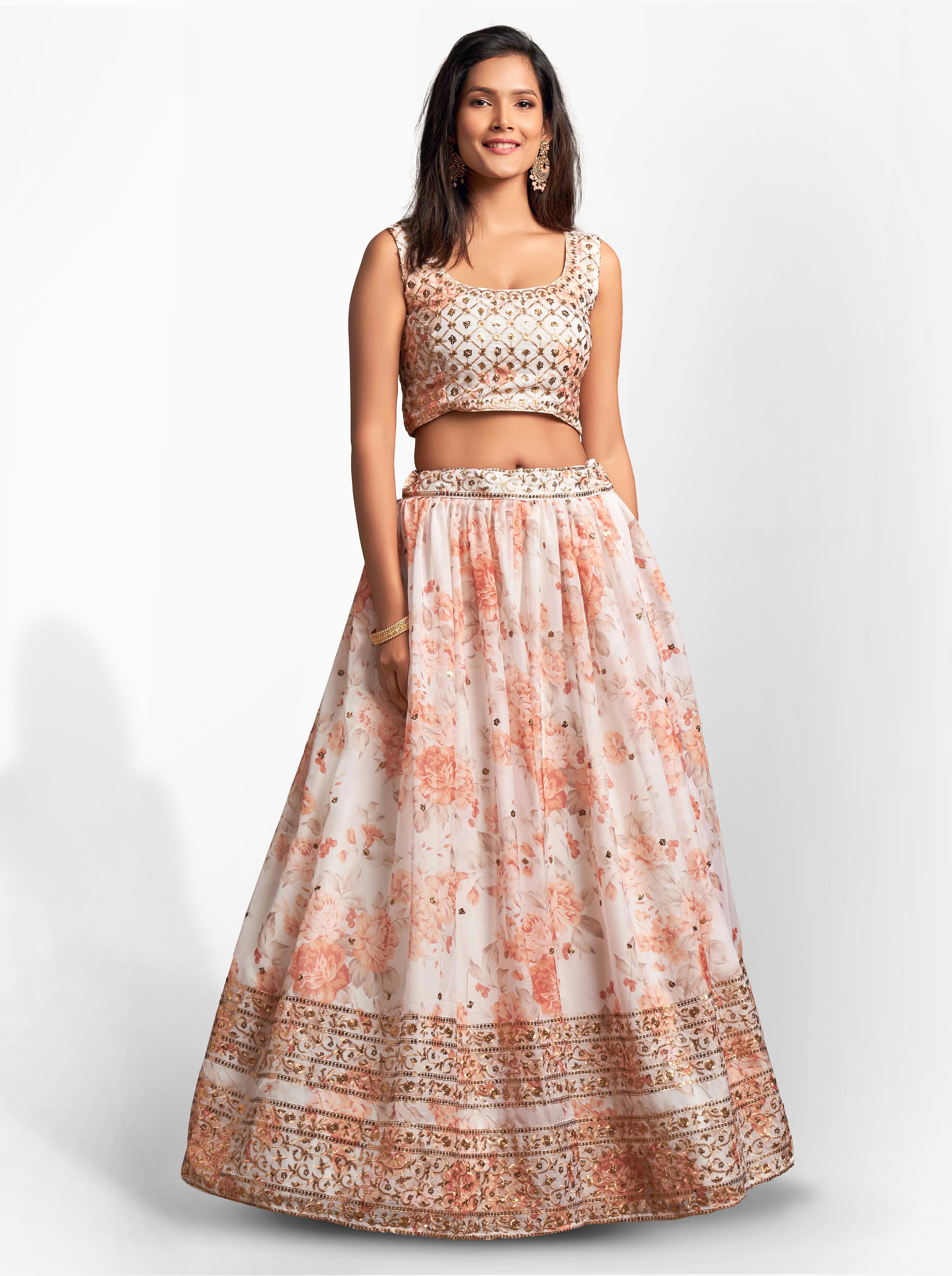 Elevate your ethnic look with this white organza lehenga featuring sequence work,floral work embroidery work. Designed for festive occasions and celebrations, it offers a graceful flow and timeless appeal.Crafted from lightweight organza fabric with a semi-stitched finish, this lehenga ensures comfort and easy customization. Dry clean recommended.