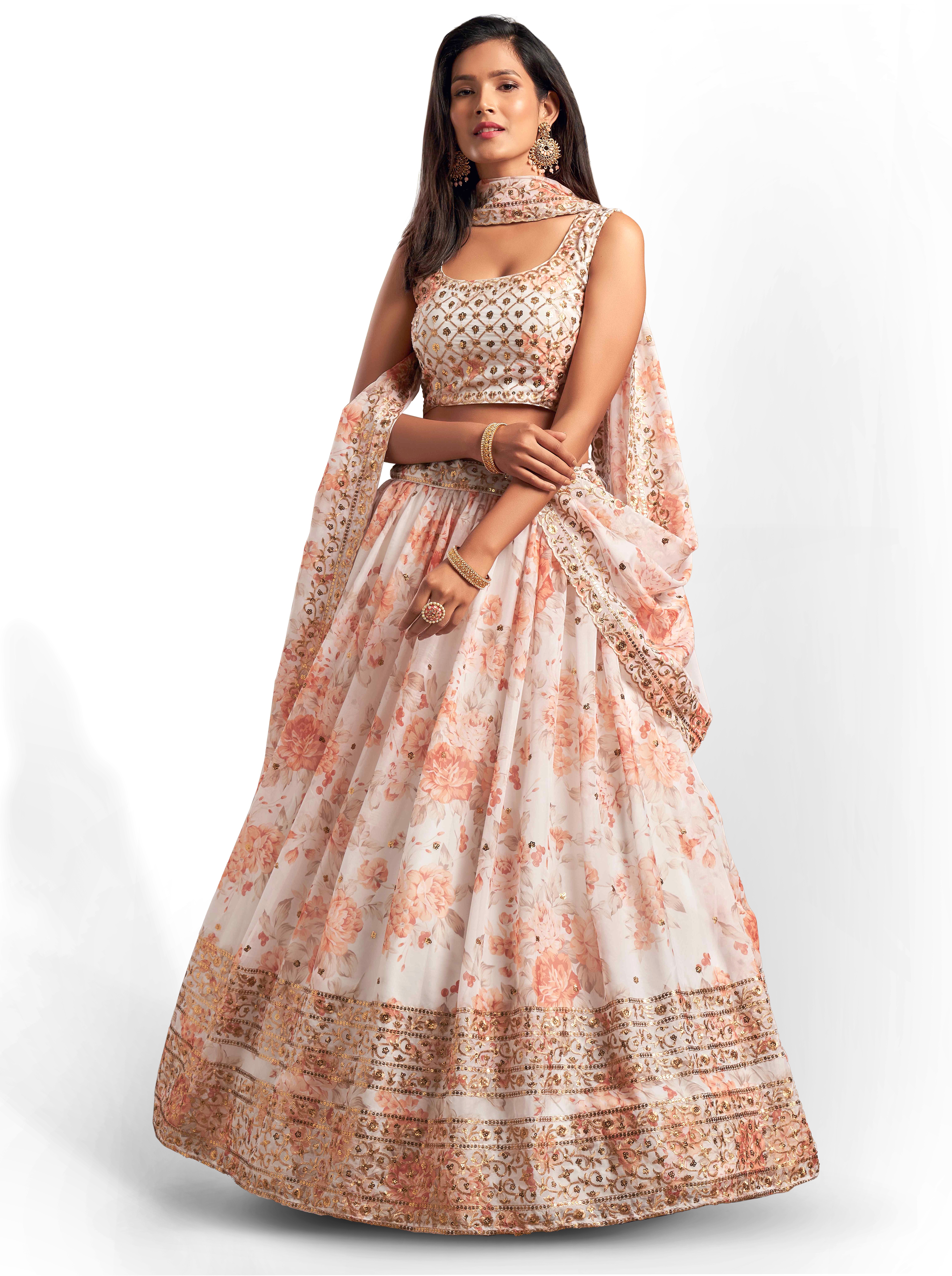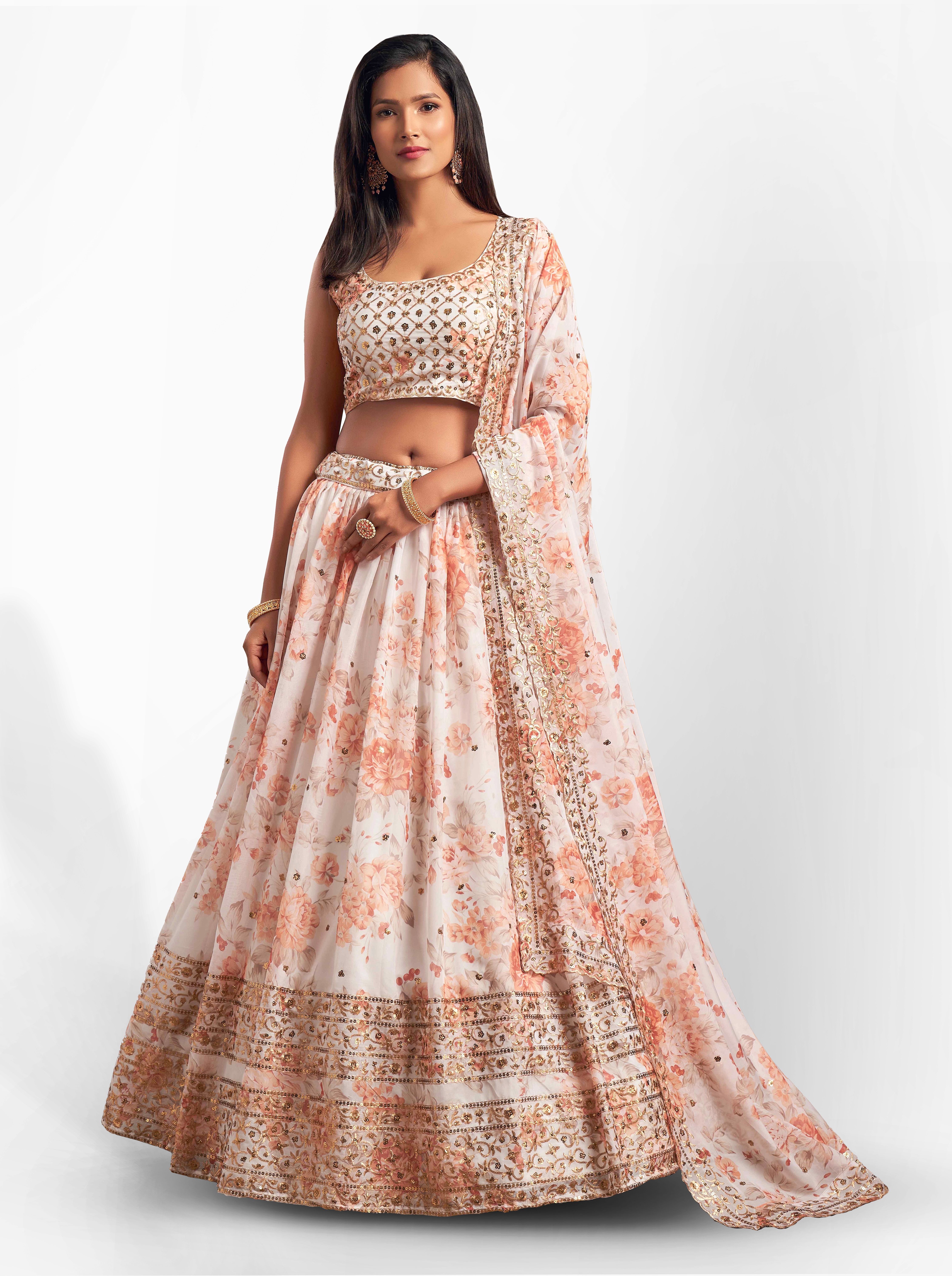 Womens White Organza Sequence Work,Floral Work Embroidery Lehenga Set