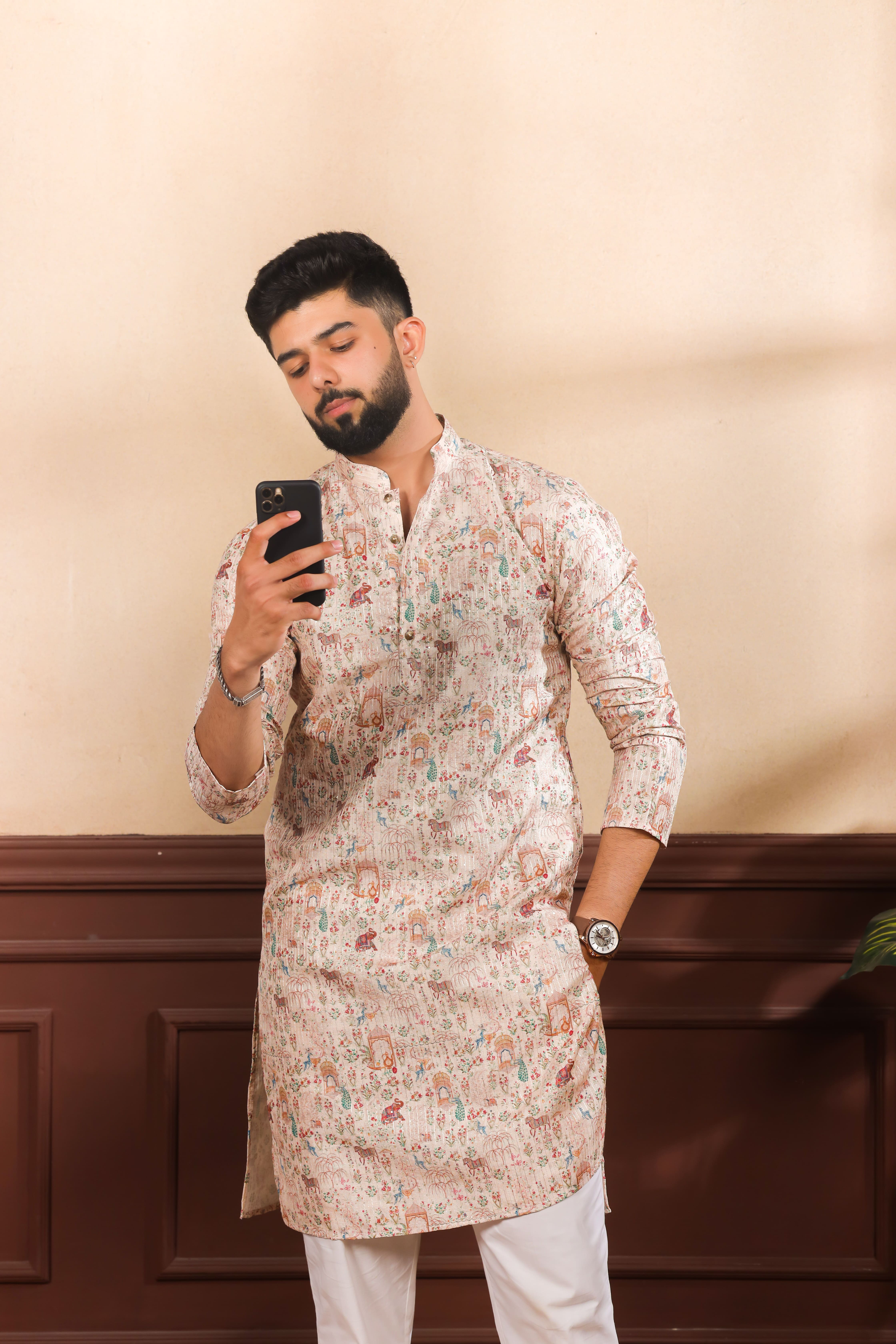 Beige Color Beautiful Art Silk Fabric Smart Print Designer Kurta Payjama