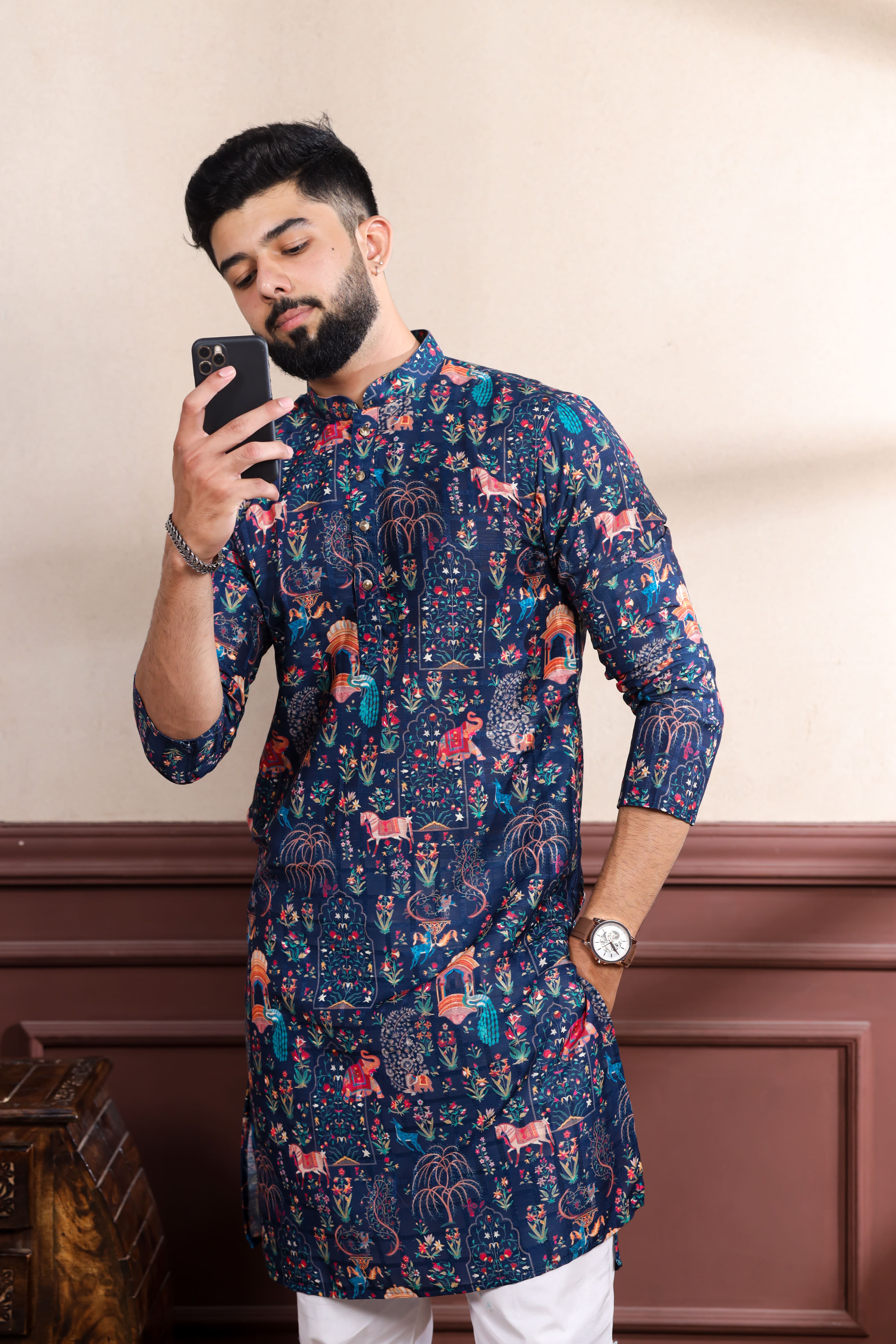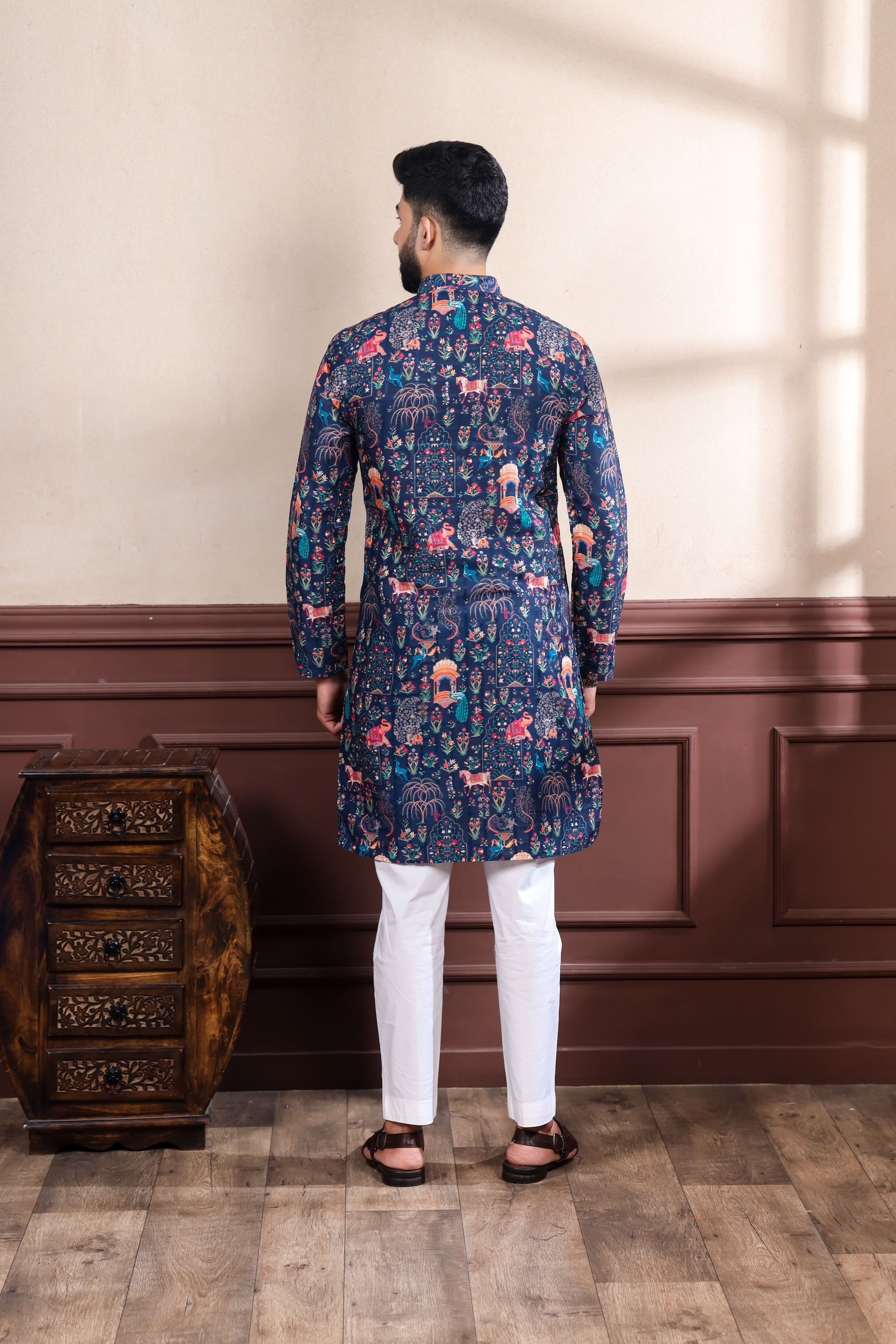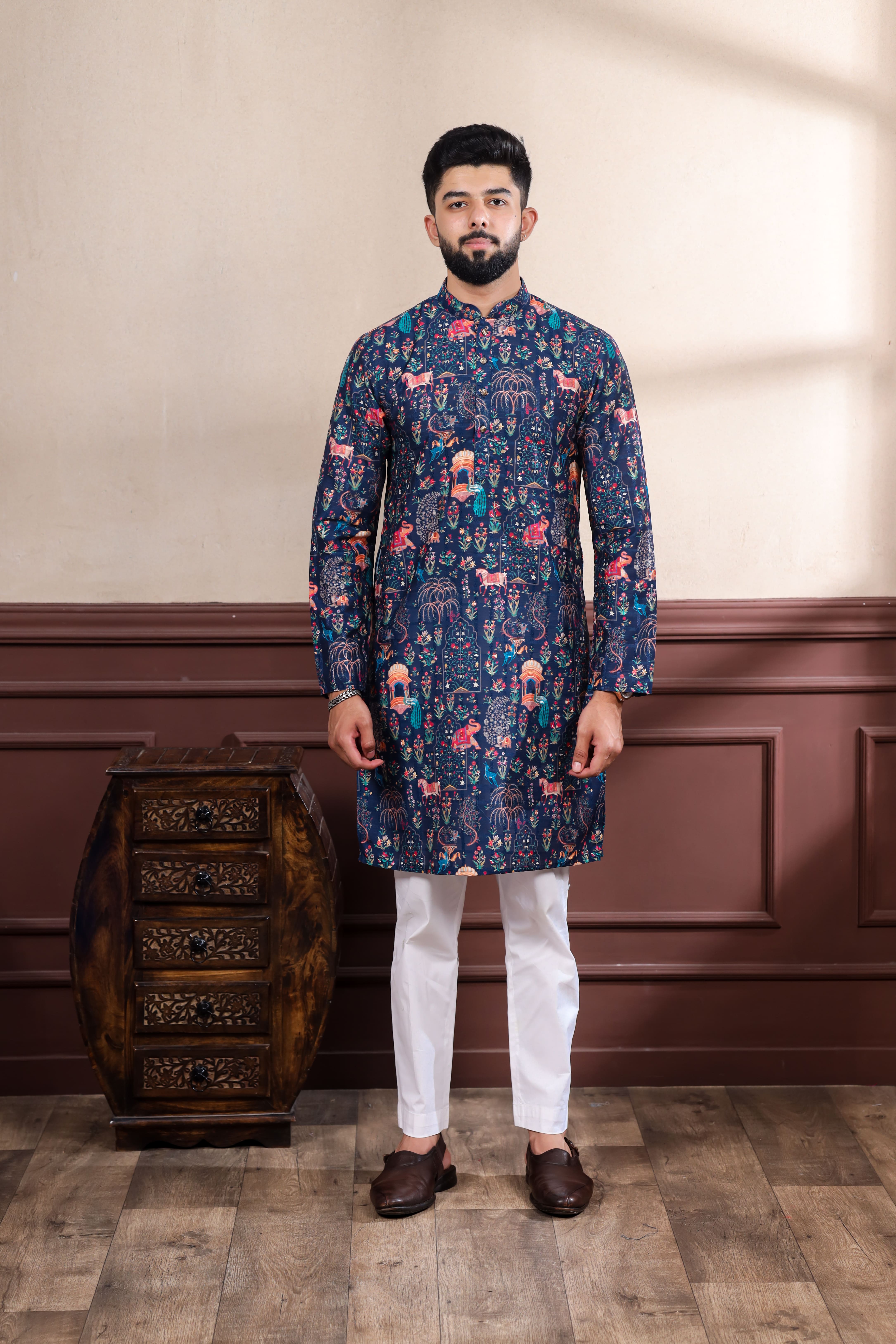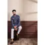 Blue Color Ethnic Woven Patta With Digital Printed Ceremonial Kurta Payjama For Men's
