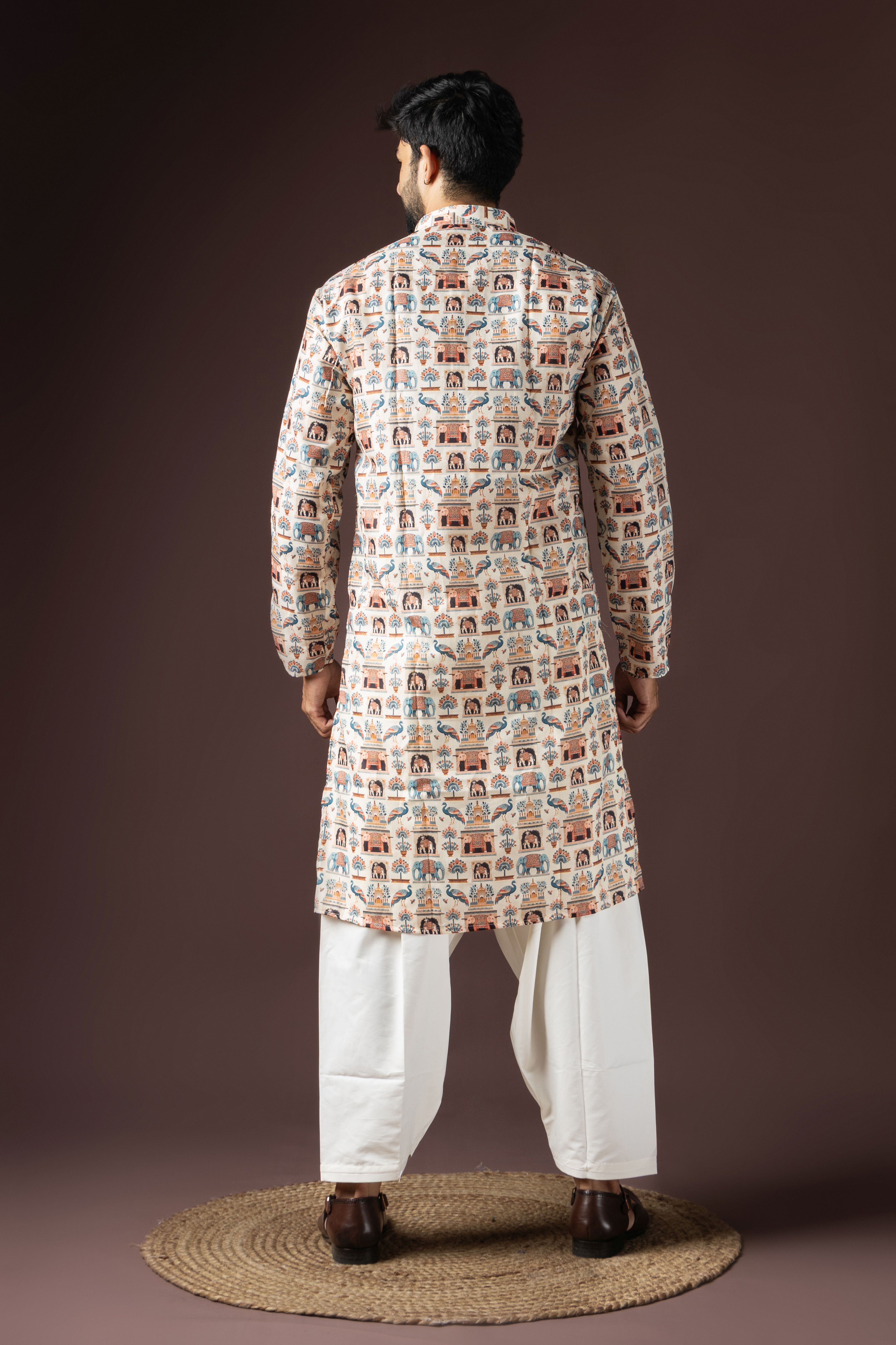 Cream Color Beautiful Printed Blended Cotton Fabric Ceremonial Men's Kurta Payjama