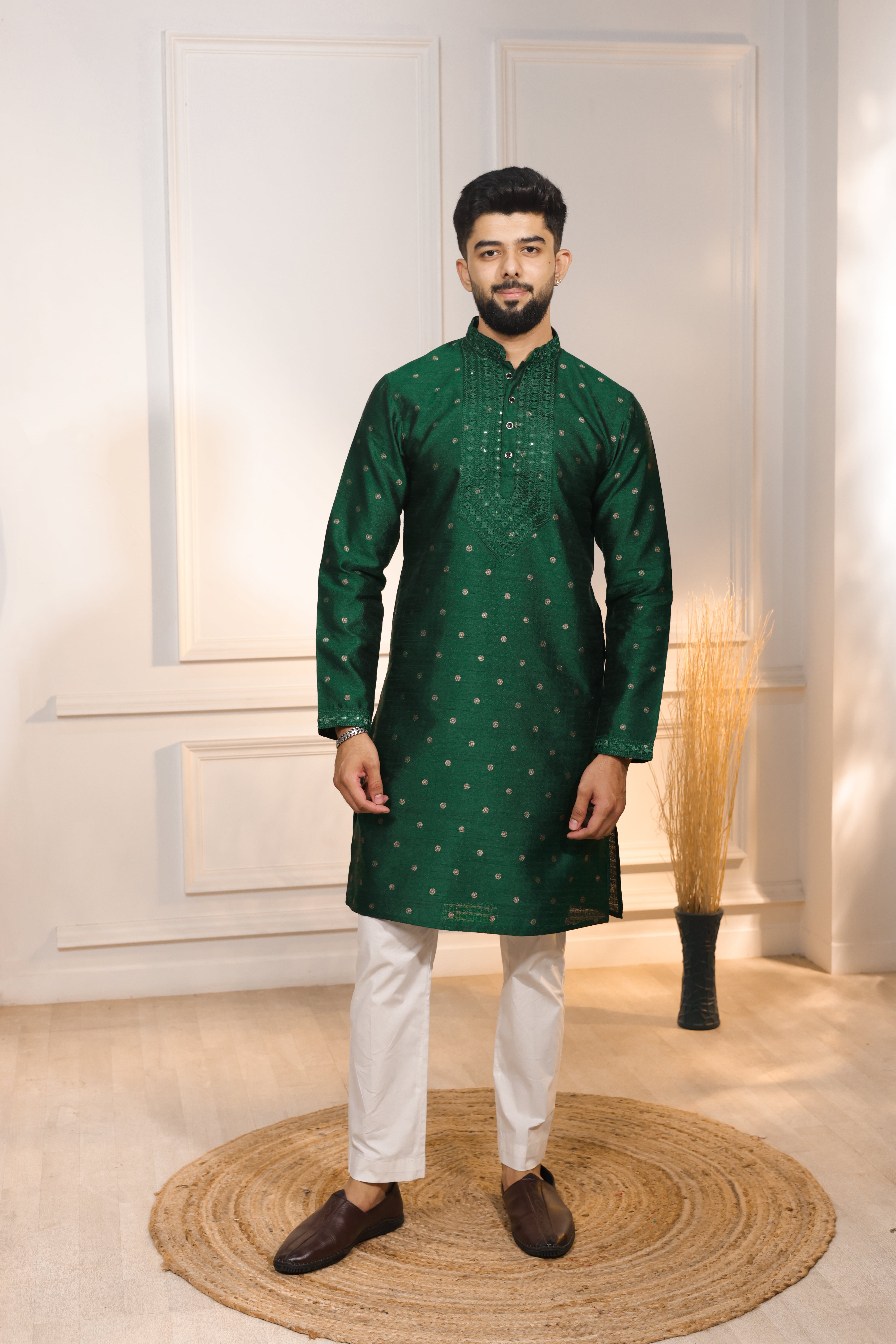 Green Color Jacquard Silk Fabric Designer Embroidered Kurta Payjama For Men's