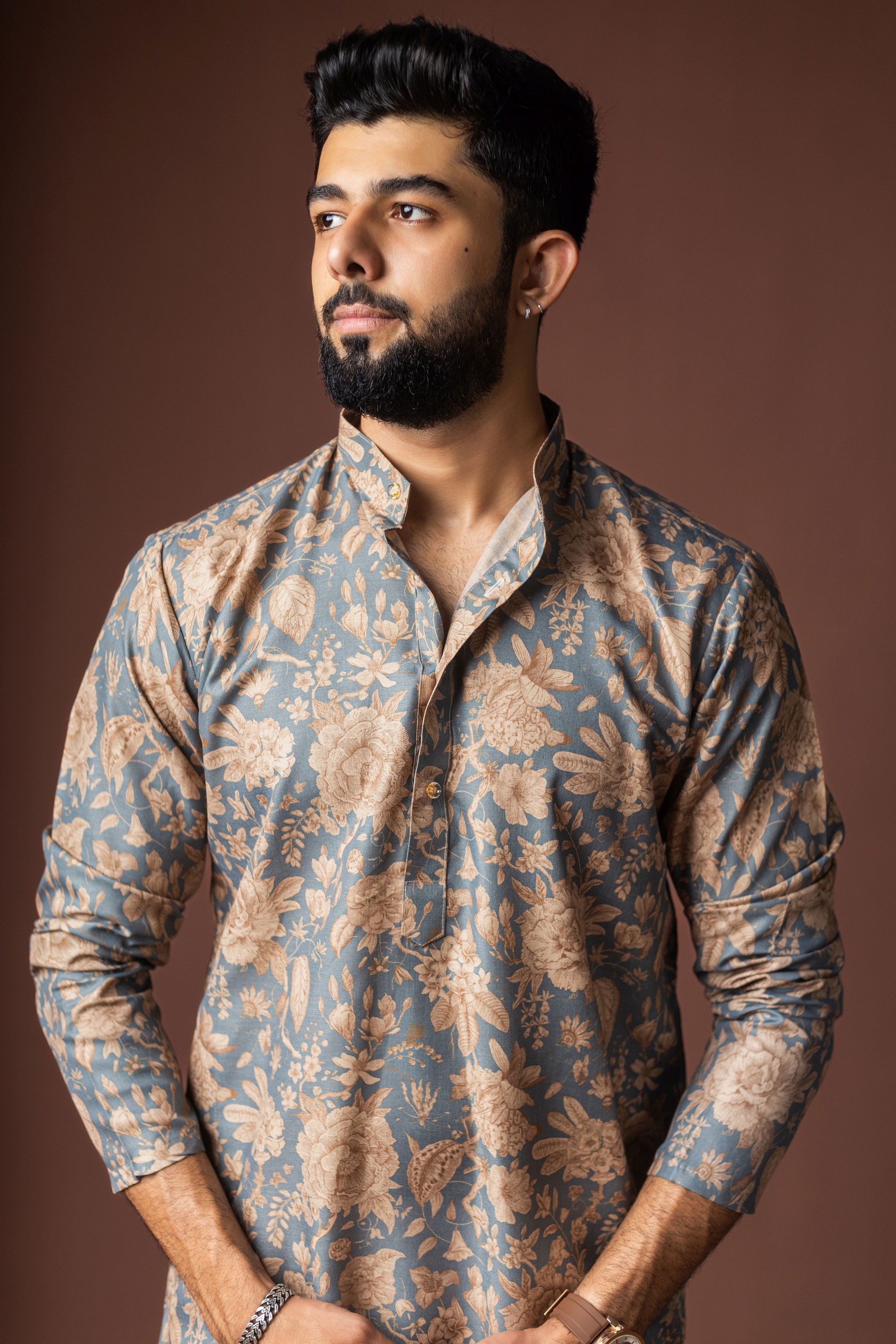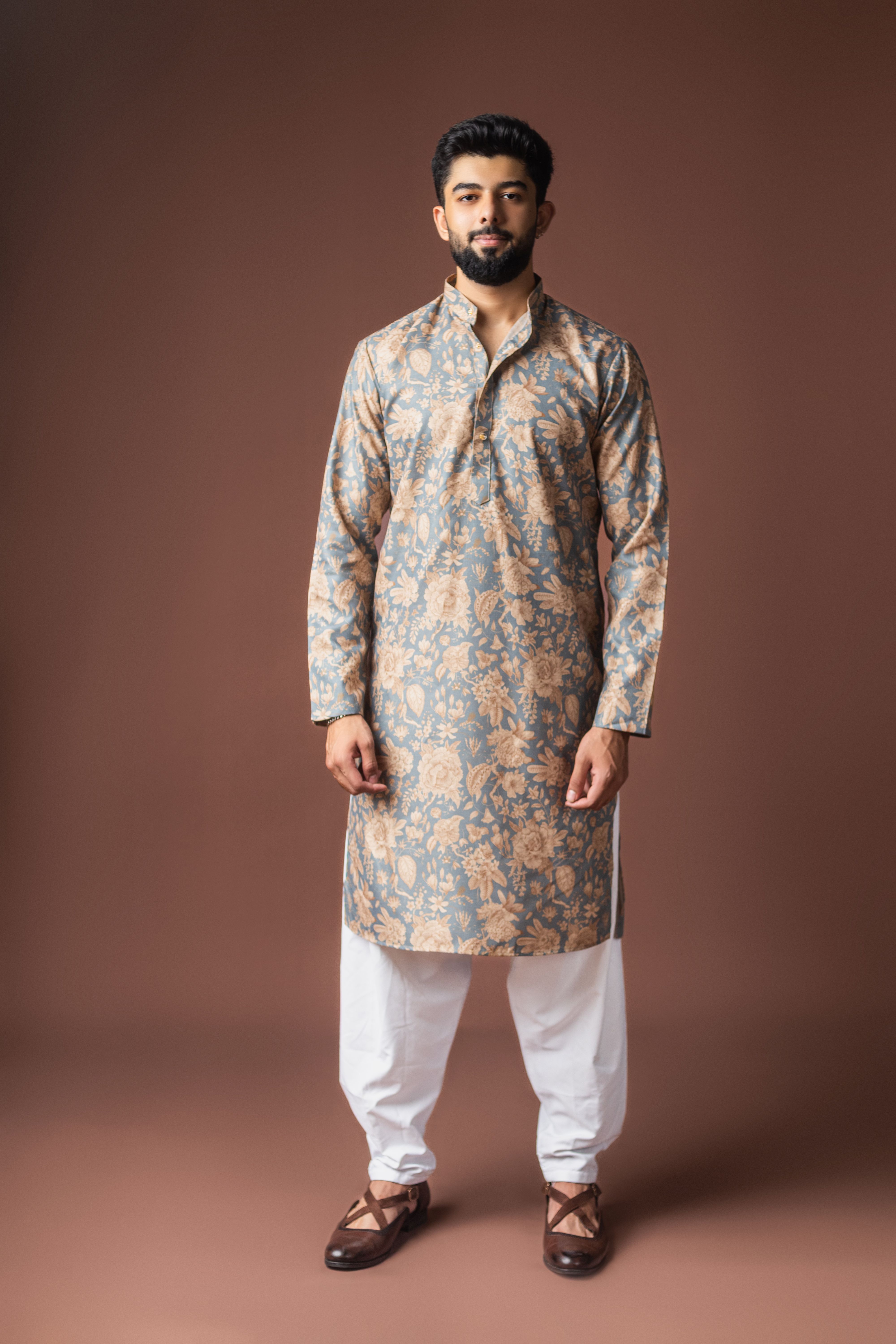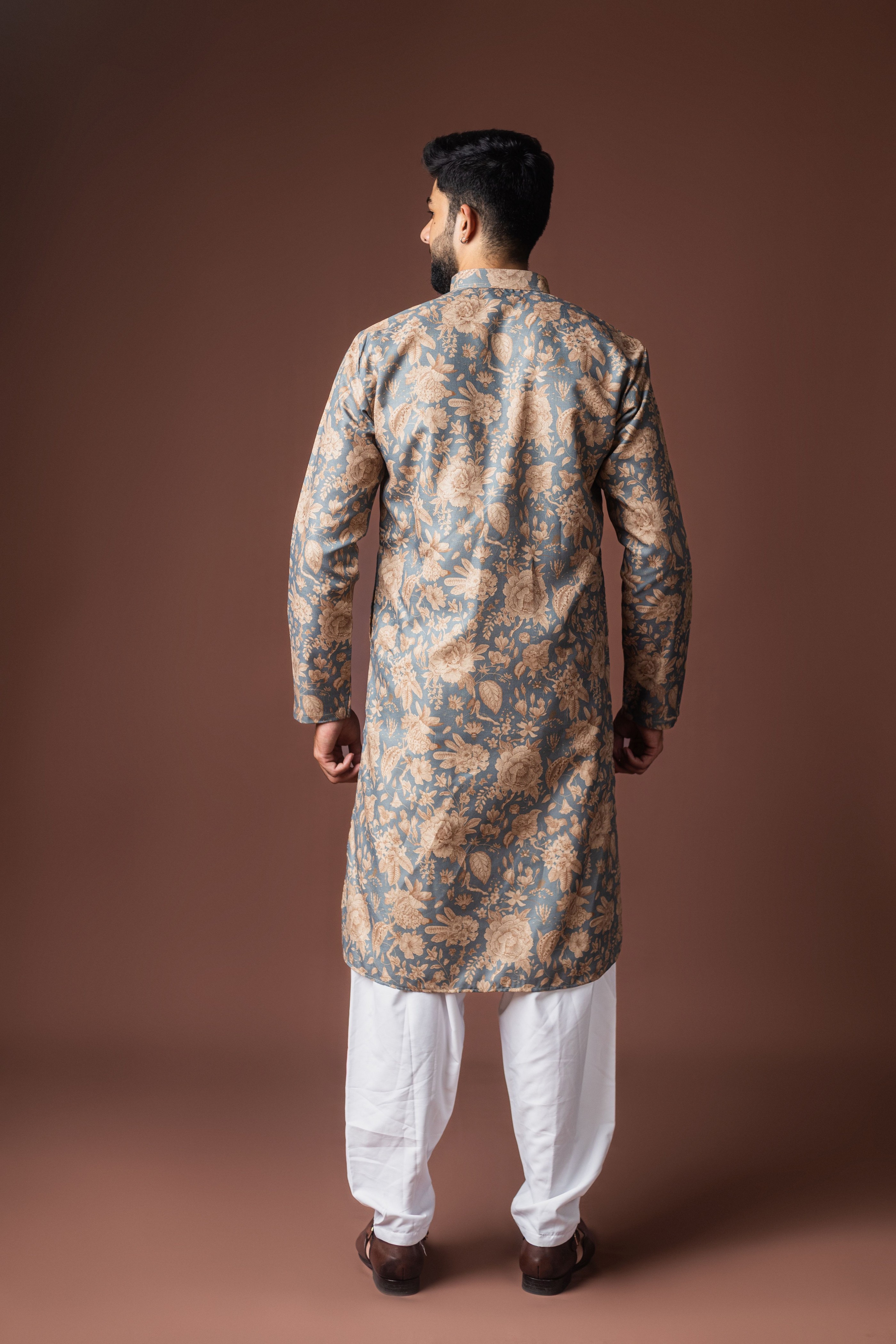 Grey Color Blended Linen Designer Printed Stylish Kurta Payjama For Mens'