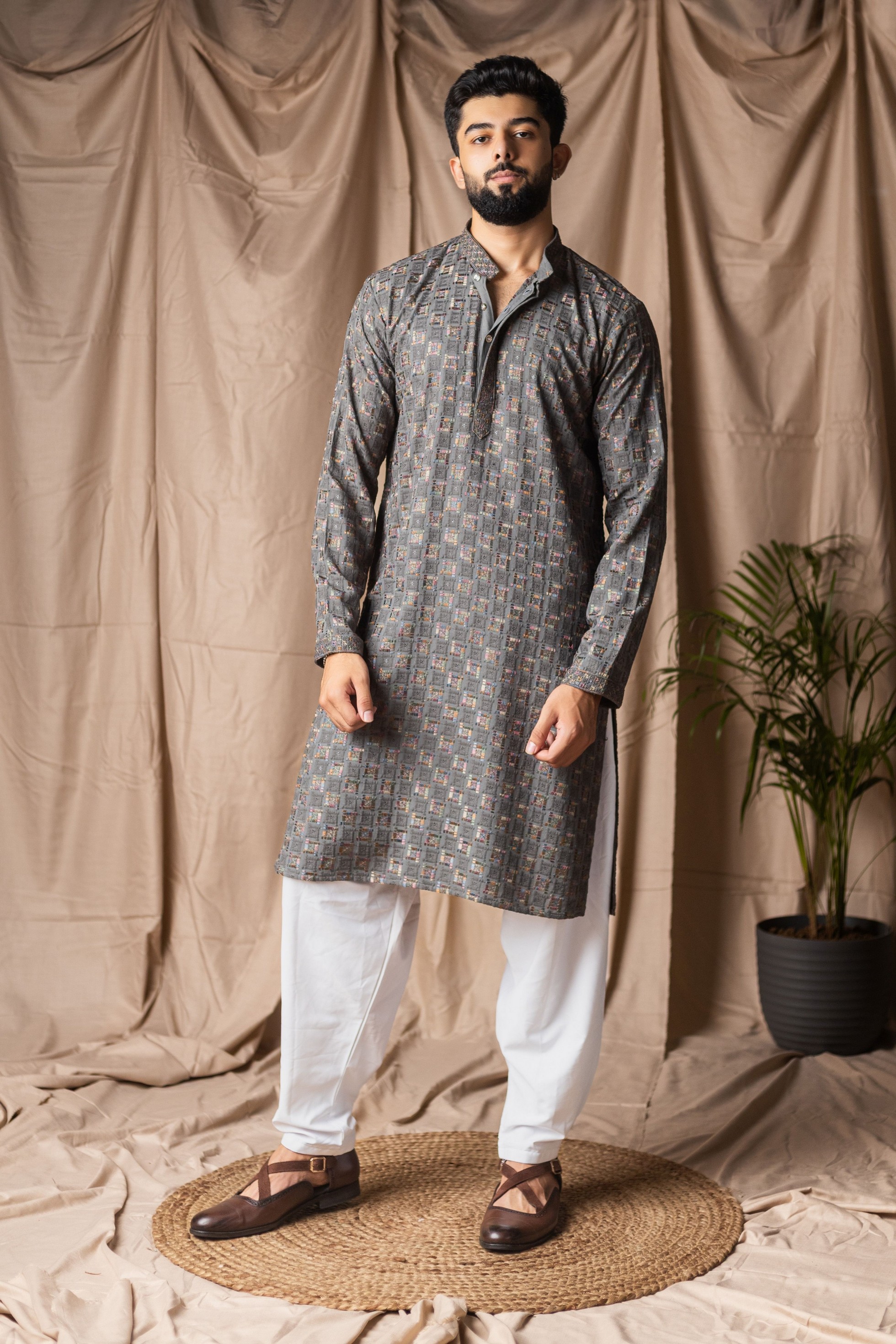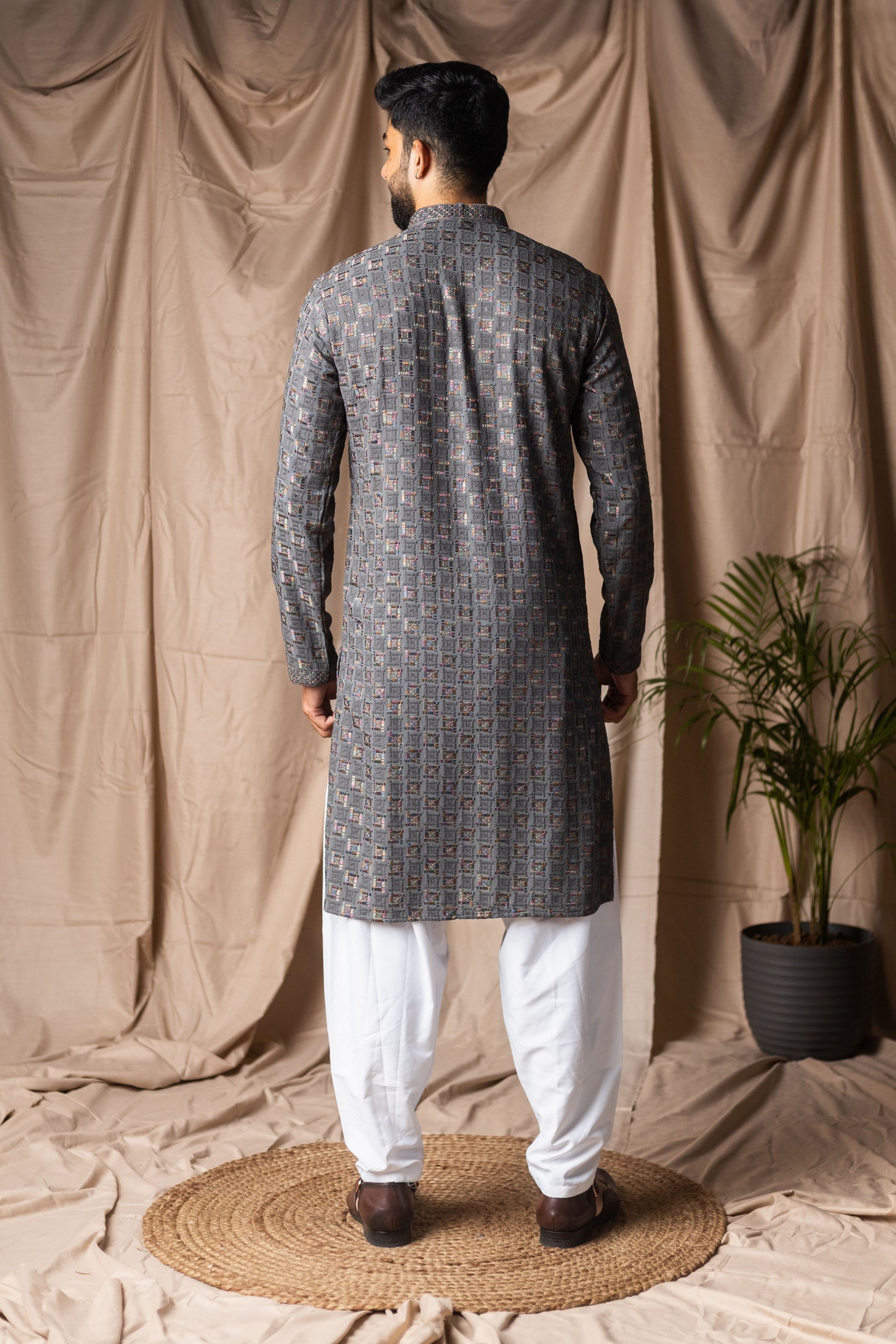 Grey Color Rayon Fabric Festive Wear Ethnic Men's Embroidered Kurta Payjama