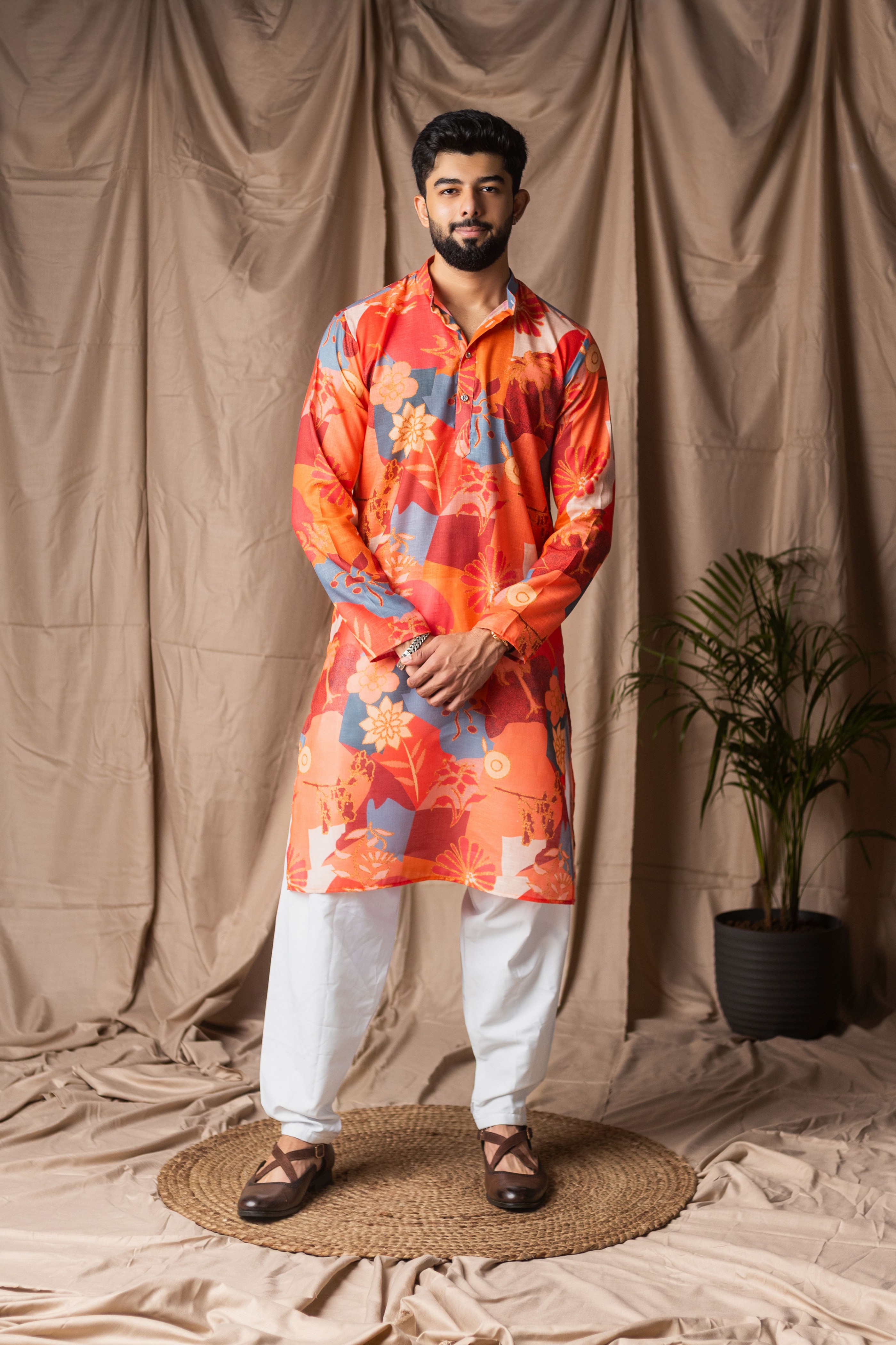 Orange Color Blended Linen Designer Printed Stylish Kurta Payjama For Mens'