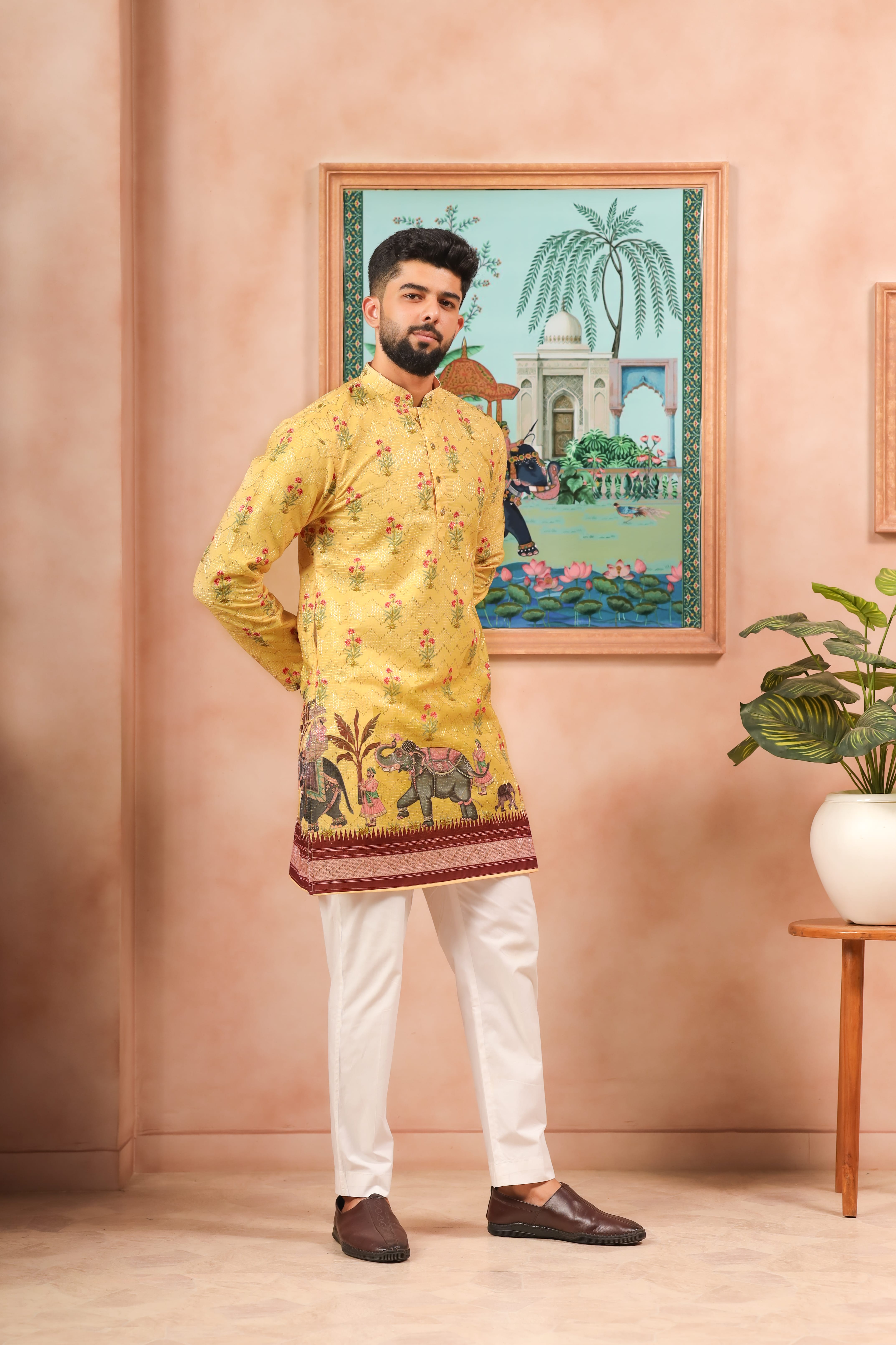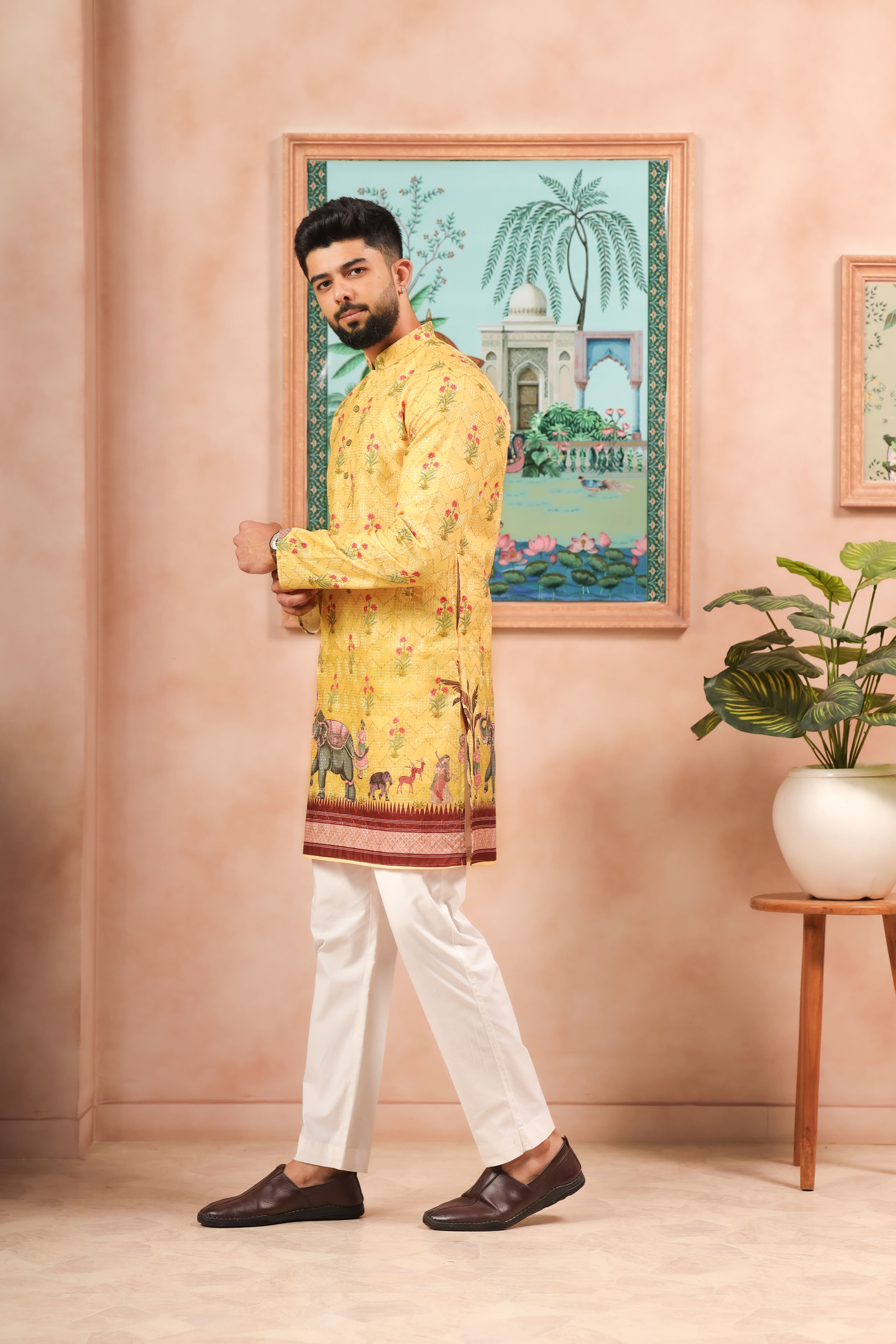 Yellow Color Beautiful Blended Cotton Fabric Ceremonial Kurta Pjyama
