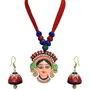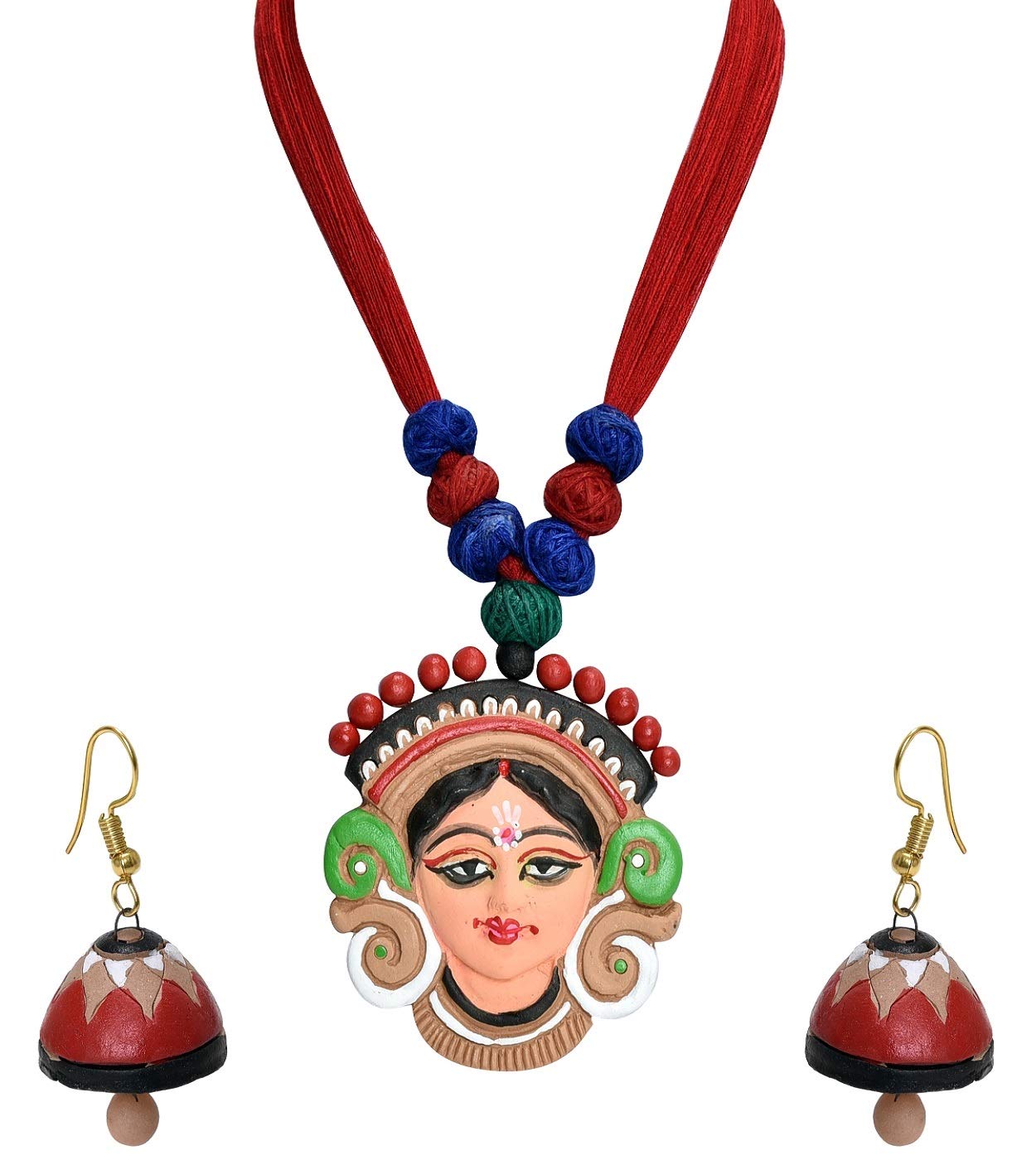 Maa Durga Necklace set.The product in display is made from terracotta material and is finished in an attractive black color. Furthermore this product features a strand shape and a design that renders it with the versatility to be worn as a festive occasion wear