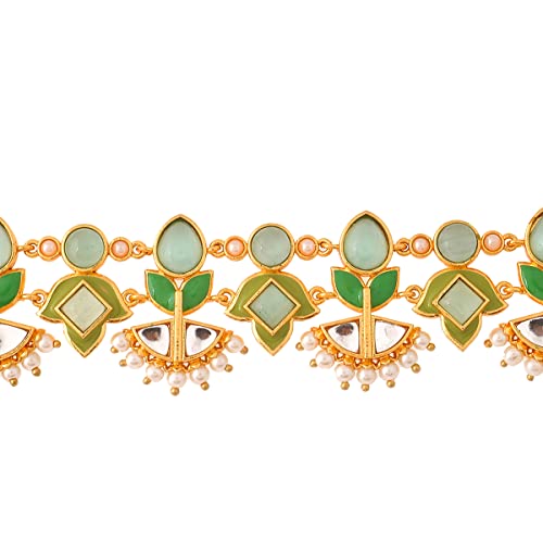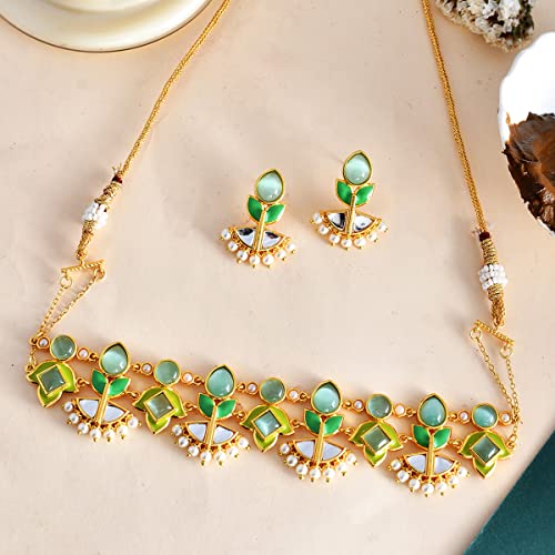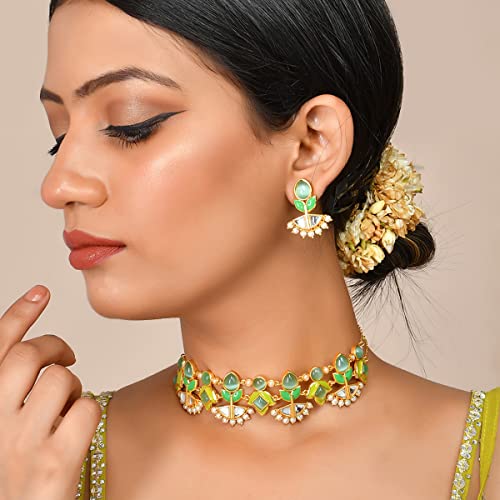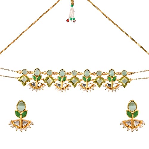 Embrace the regal charm of this Choker Necklace Set adorned with stunning gold plating. The intricate design of the necklace and matching earrings exudes elegance and grace. Crafted with meticulous attention to detail this set effortlessly enhances your neckline ing a touch of sophistication to any ensemble. Let this choker necklace set become a statement piece that reflects your exquisite style and captures attention wherever you go.