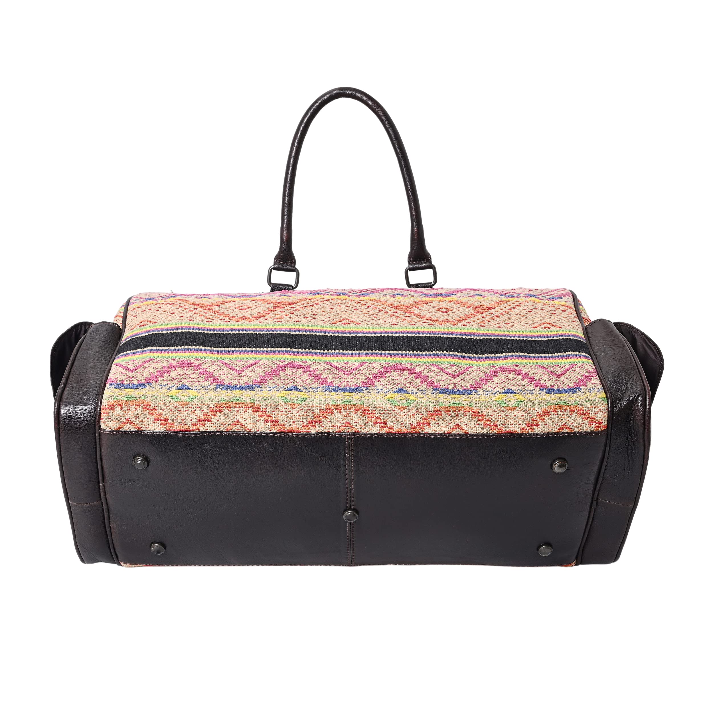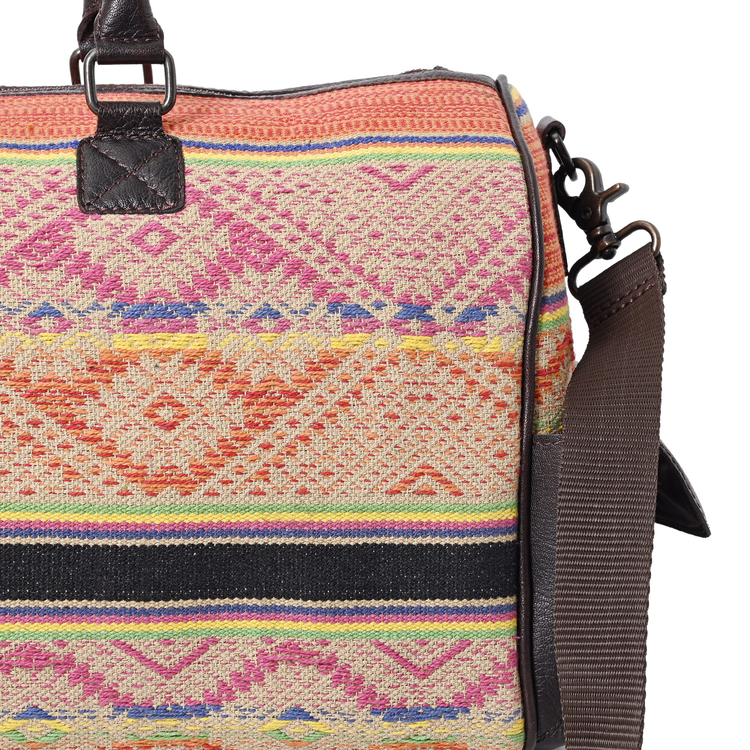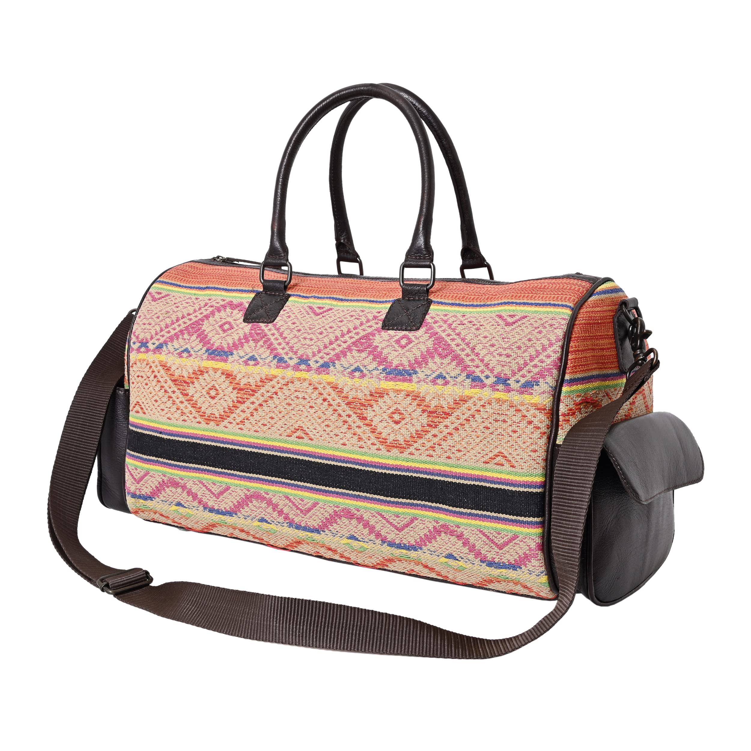 Travel in style with this bright & attractive woven multicolour travel duffle luggage bag made from high quality genuine full grain leather & cotton dari. Whether jet-setting around the world or going on a weekend trip this bag is sure to make heads turn. It fastens fully with a zipper on top. Very spacious to store all your essential stuff it has an inner zipper compartment along with two other open compartments inside the bag. Also there are two pockets on the sides for extra storage & convenience that close with a magnetic button. The padded double handles are comfortable to hold & it also comes with an adjustable & detachable shoulder strap. So carry it as a hand-held bag or over your shoulders. The bag has rivets / protective feet at the bottom. Dimensions: Length- 18.8 inches Height- 13.3 inches Width (at base)- 9 inches