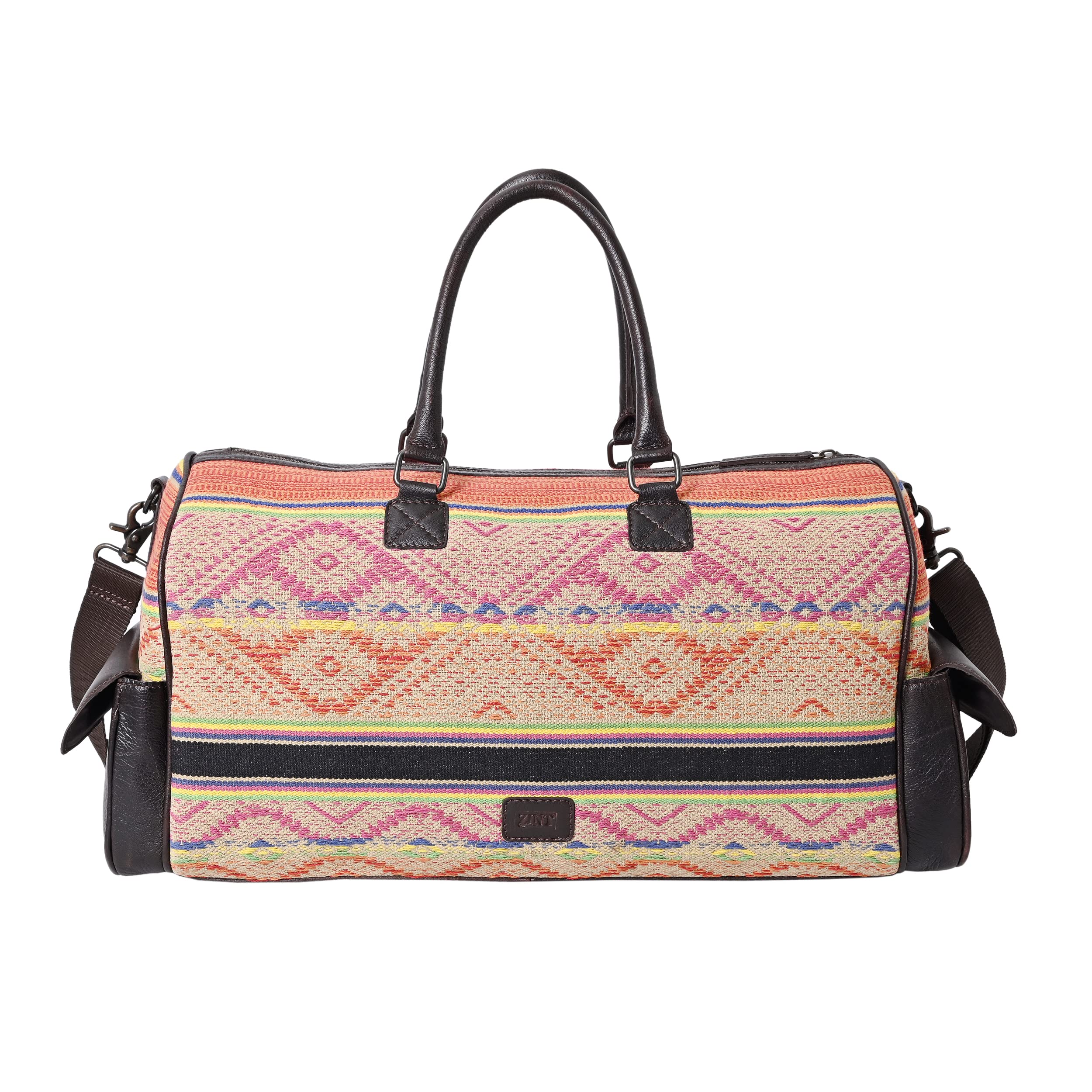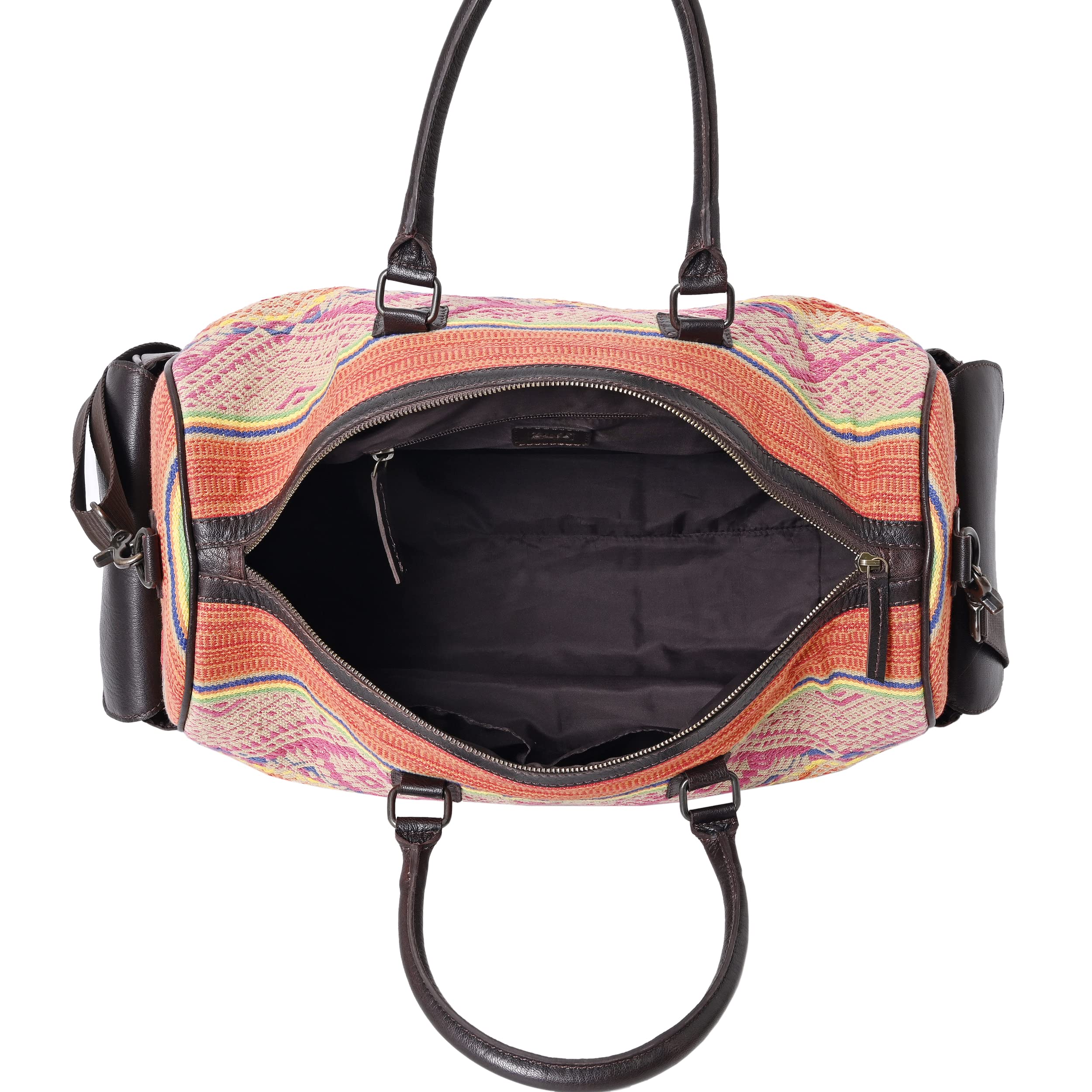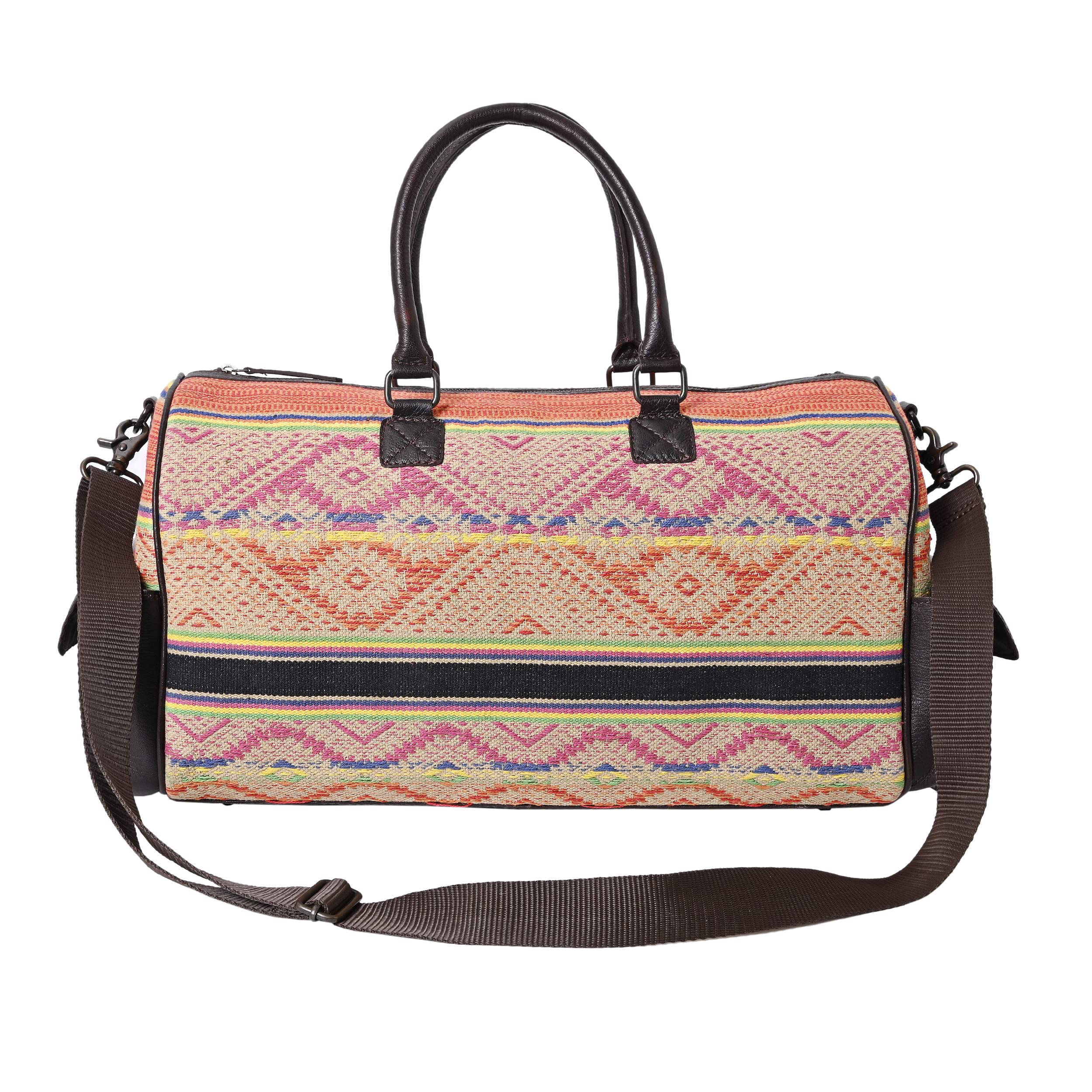 Travel in style with this bright & attractive woven multicolour travel duffle luggage bag made from high quality genuine full grain leather & cotton dari. Whether jet-setting around the world or going on a weekend trip this bag is sure to make heads turn. It fastens fully with a zipper on top. Very spacious to store all your essential stuff it has an inner zipper compartment along with two other open compartments inside the bag. Also there are two pockets on the sides for extra storage & convenience that close with a magnetic button. The padded double handles are comfortable to hold & it also comes with an adjustable & detachable shoulder strap. So carry it as a hand-held bag or over your shoulders. The bag has rivets / protective feet at the bottom. Dimensions: Length- 18.8 inches Height- 13.3 inches Width (at base)- 9 inches