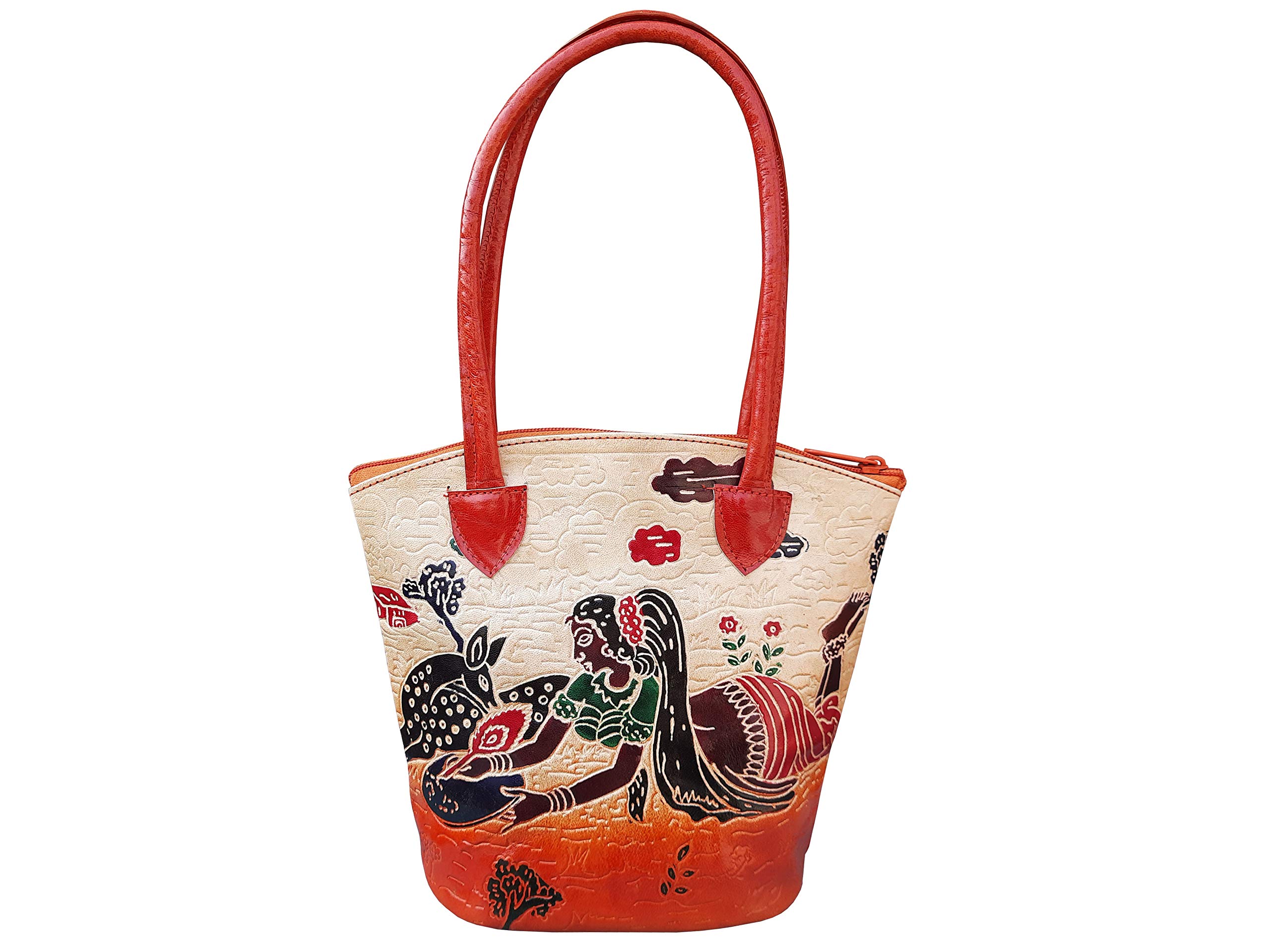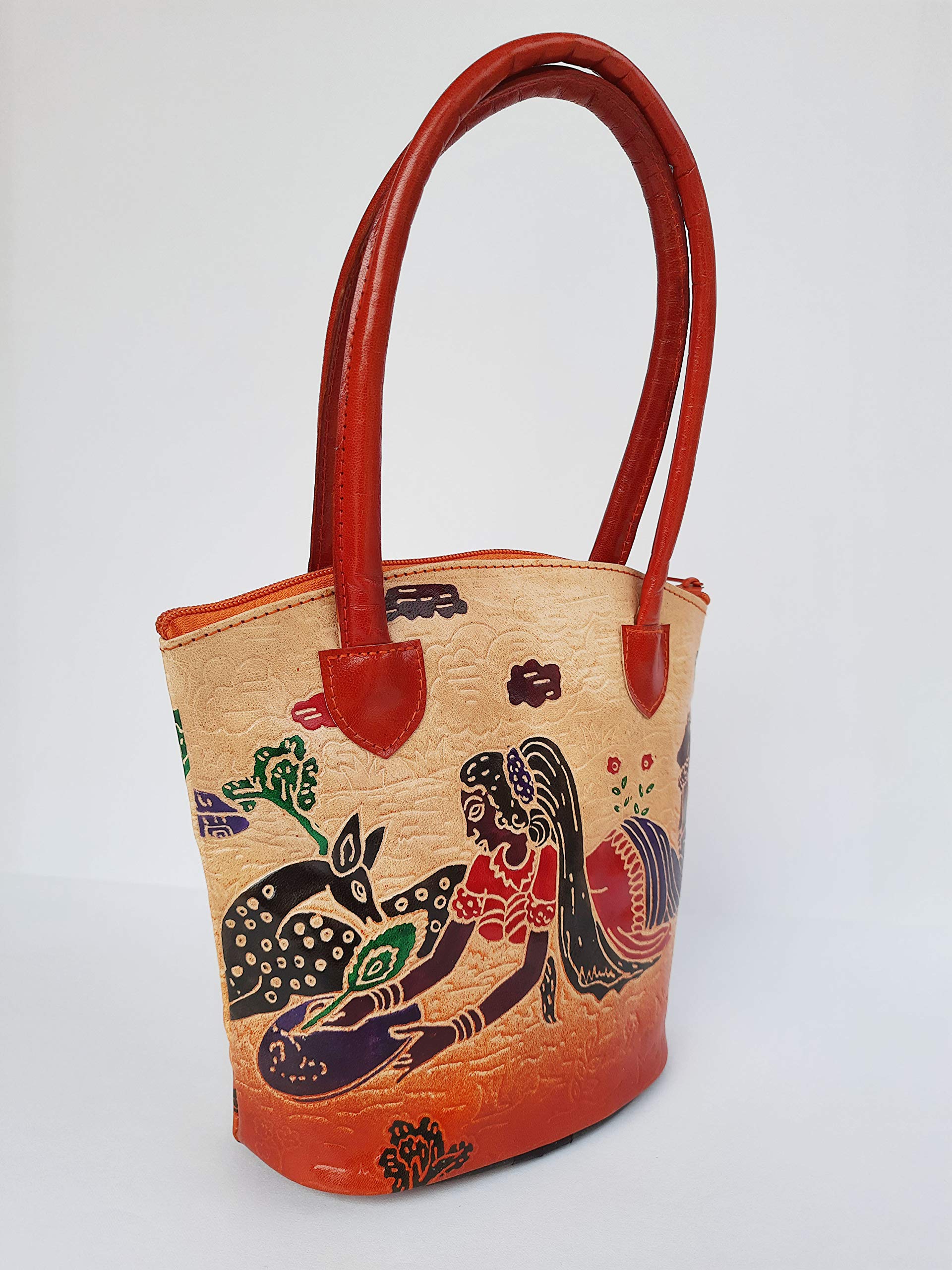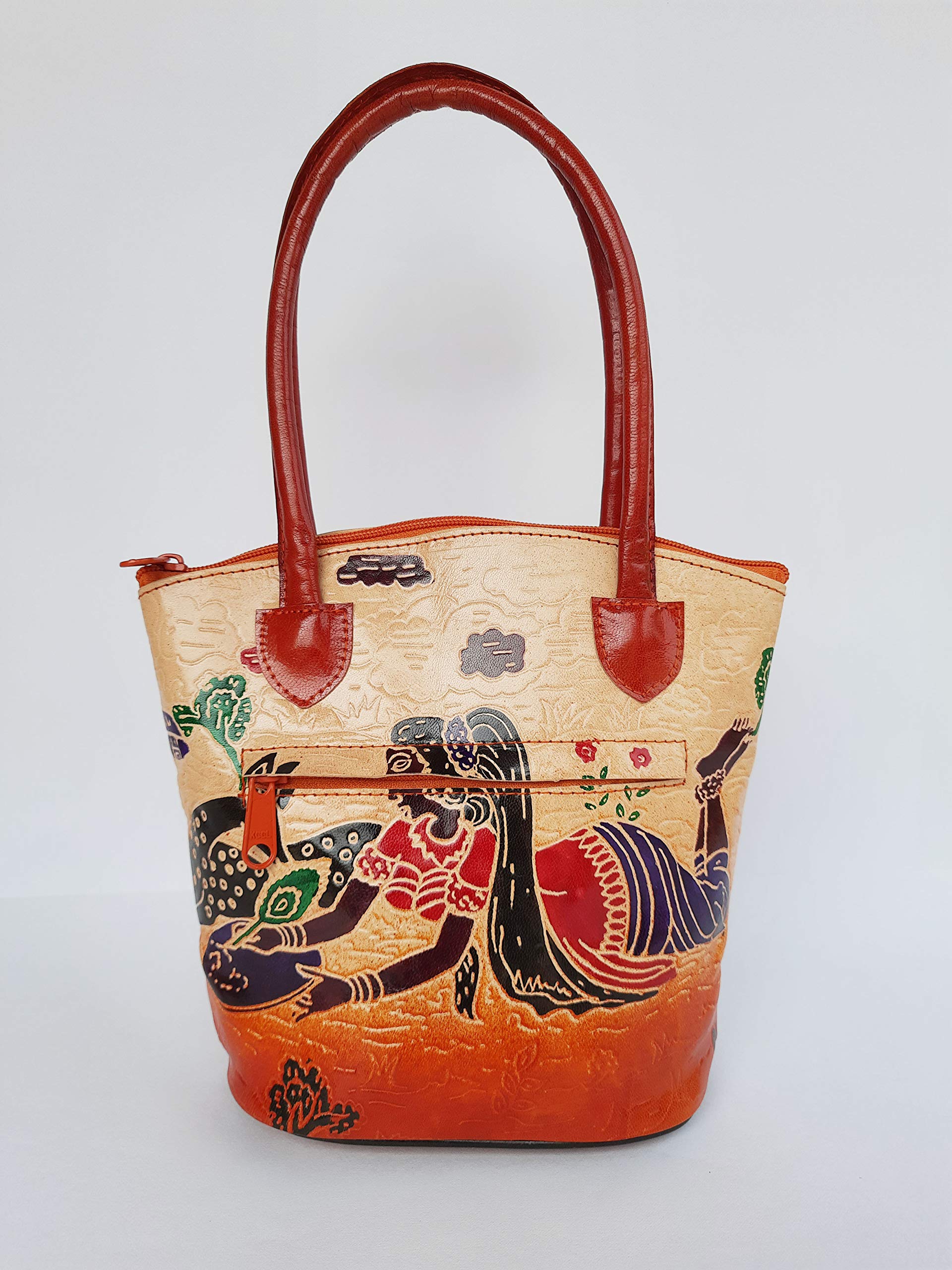 Handcrafted from 100% Genuine Leather a Beautiful Ethnic Art of West Bengal. Design on Both Sides Double Handle One Main compartment and One Cell phone compartment Inside One pocket in the back. Closes fully with zip.Traditional Block print. This purse is a classic example of age old Shantiniketan craft which was introduced in West Bengal India during the 1940s. The traditional motifs used for these Shantiniketan bags depict the rich cultural heritage of India. The Shantiniketan style evolved as a result of the Art Movement and these products have now become world famous for their appliqu batik and embossed craft work. The process of burnishing the leather gives it an elegant sheen and brings out the colors. The major embossing craft is done by hand and is an intricate process. After the final leather made it is then stitched into the desired product coated with a lacquer finish for making the product shiny and long lasting. We are happy for your interest SHANTINIKETAN EMBOSSED LEATHER PRODUCTS and artist of Shantinikan thanks to you.