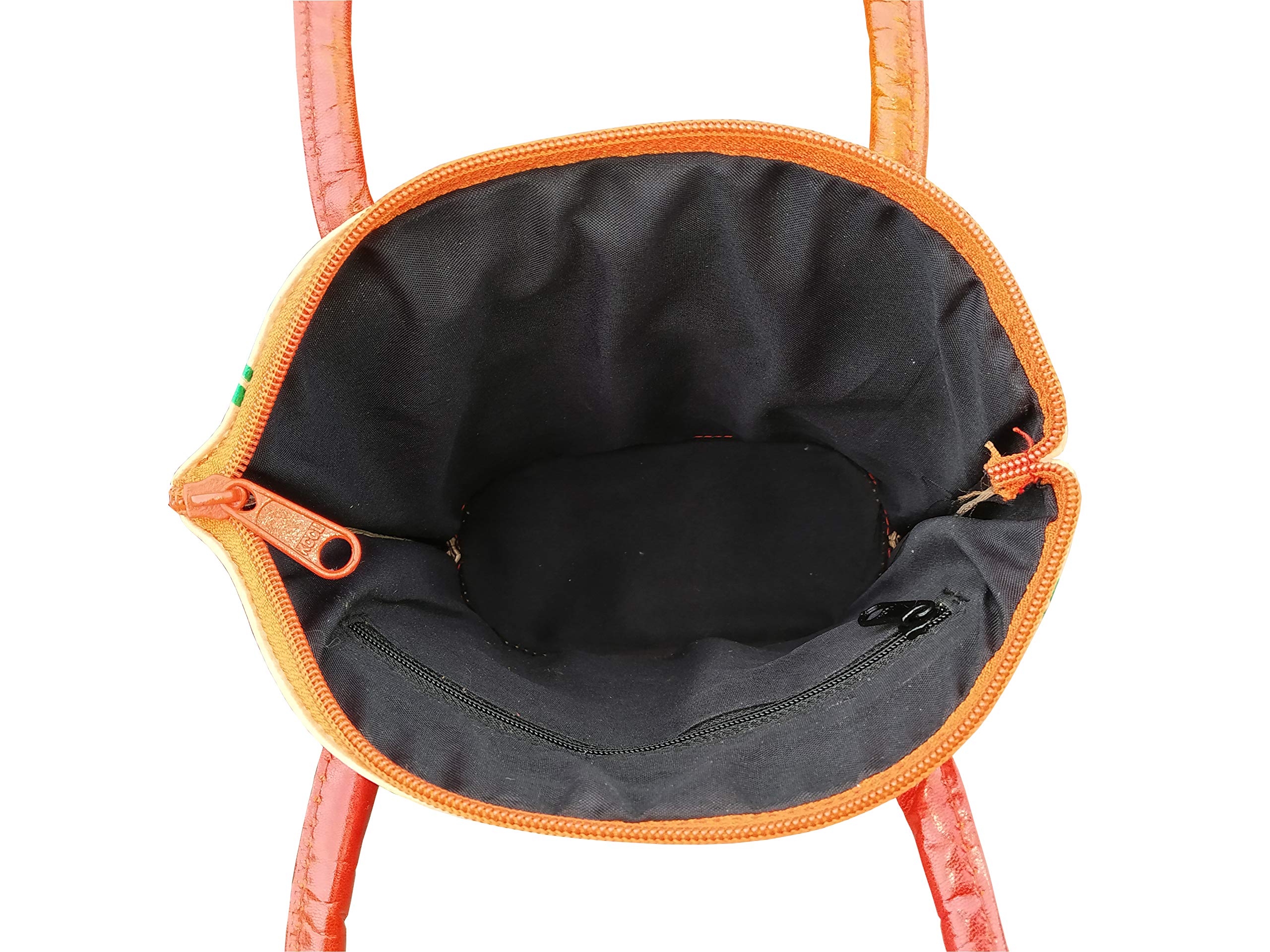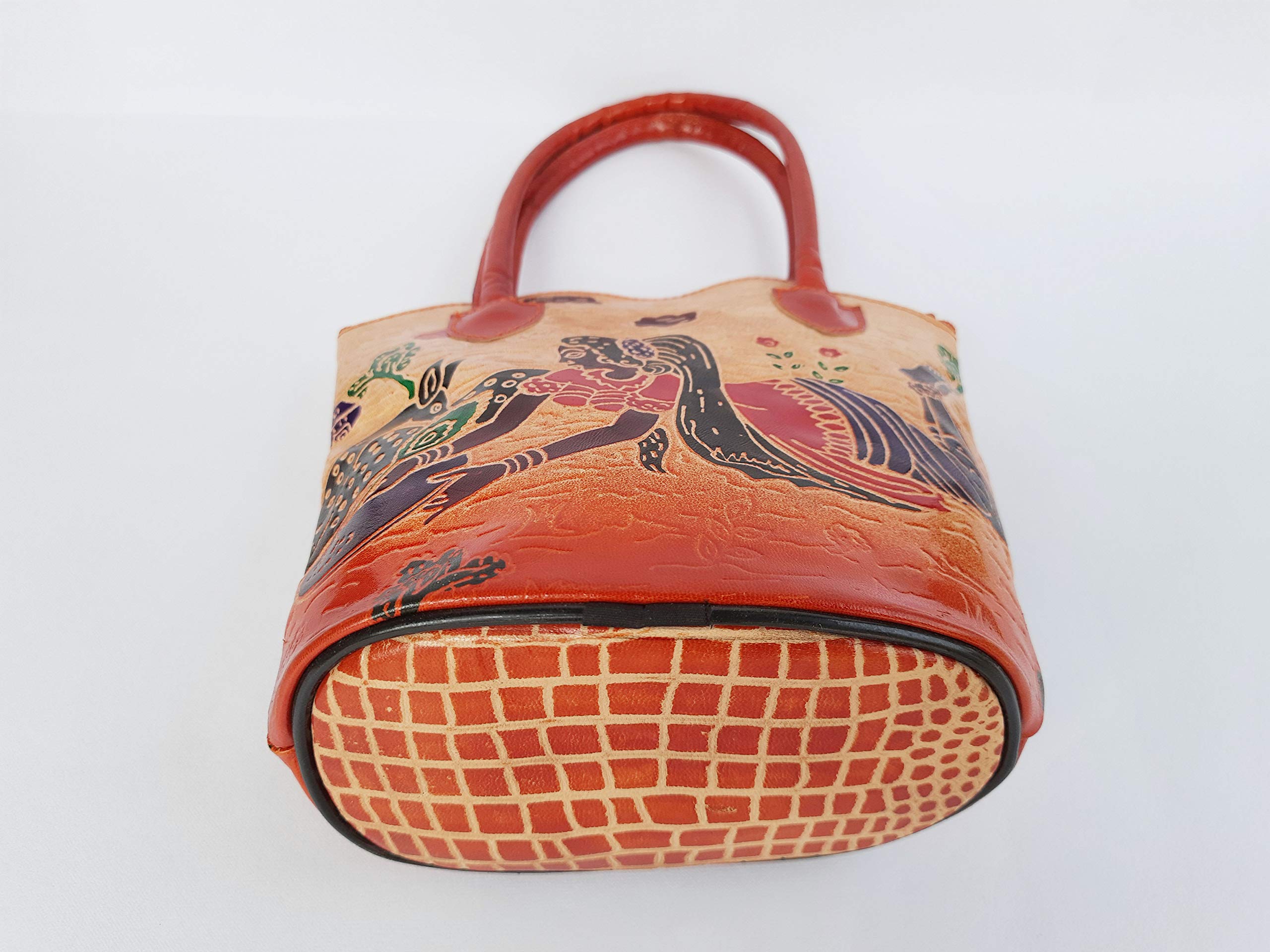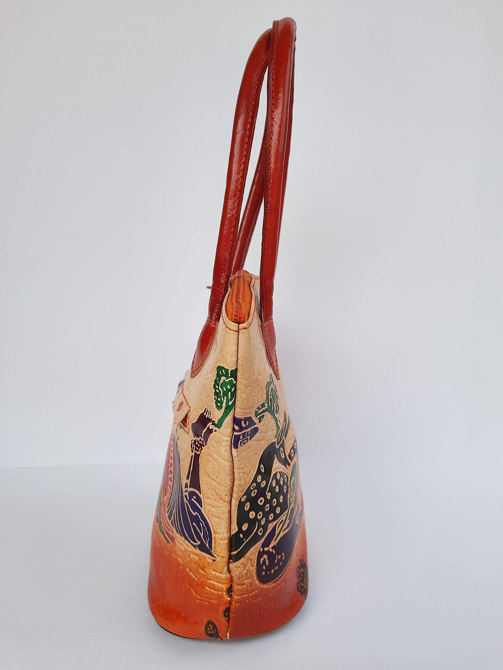 Handcrafted from 100% Genuine Leather a Beautiful Ethnic Art of West Bengal. Design on Both Sides Double Handle One Main compartment and One Cell phone compartment Inside One pocket in the back. Closes fully with zip.Traditional Block print. This purse is a classic example of age old Shantiniketan craft which was introduced in West Bengal India during the 1940s. The traditional motifs used for these Shantiniketan bags depict the rich cultural heritage of India. The Shantiniketan style evolved as a result of the Art Movement and these products have now become world famous for their appliqu batik and embossed craft work. The process of burnishing the leather gives it an elegant sheen and brings out the colors. The major embossing craft is done by hand and is an intricate process. After the final leather made it is then stitched into the desired product coated with a lacquer finish for making the product shiny and long lasting. We are happy for your interest SHANTINIKETAN EMBOSSED LEATHER PRODUCTS and artist of Shantinikan thanks to you.